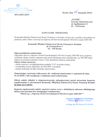 -el I.\'j 'ta l:: Konin, alra 0f tistopada 2015r. ,,GUZTK" Systemy Informatyczne ul. Spółdzielców 8 62 - 510 Konin ZAPYTANIE OFERTOWE Komenda Miejska Państwowej Strazy Pozarnej w Koninie zwraca się z prośbąo przesłanie na ponlŻszy adres oferty cenowej na naprawę dwóch kserokopiarek olivetti d-copia 2500 MF: Komenda Miejska Państwowej Strazy Pożarnej w Koninie ul. Przemysłowa 7 62 - 510 Konin opis przedmiotu zamówienia: olivetti d-copia 2500 MF m.in. poprzez wymianę całego zestawu naprawczego przewidzianego przezproducenta na 300 000 kopii. Zaleca się przeprowadzęnie wizji w celu określenia zakresu uszkodzeń. Oferta winna zawieraćz - ofertę cenową ZUwzględnieniem podatku VAT za jedną sztukę' - ewentualne koszty dojazdów do KM PSP w Koninie, - tęrmin realtzacji od dnia zLoŻeniazamówienia. Zap1Ąanie dotyczy naprawy dwóch kserokopiarek Zamawiający zastrzega sobie prawo do rea|izacji zamówienia w częściach do dnia 3l.12.20l5r.o lub rezygnacji z realuacji części zamówienia. oferty na|eĘ składać w nieprzezroczystej, zabezpieczonej przed otwarciem kopercie (opakowaniu) w sekretariacie Komendy Miejskiej Państwowej Strary Pożarnej Koninie do dnia 16.11.2015r. Kopertę (opakowanie) naleĘ opatrzyć naz;wą wraz z dokładnym adresem składającego ofertę oraz powinna być następująco oznakowana: oferta na: ,,Naprawę dwóch kserokopiarek olivetti d-copia 2500 MF''' Zastępca Kgpf}danta }l icjskicgo Państwofff Śrraz_y I'i;żarncj st. bryg. ^g, tłIż.Knyszrof Cościniuk