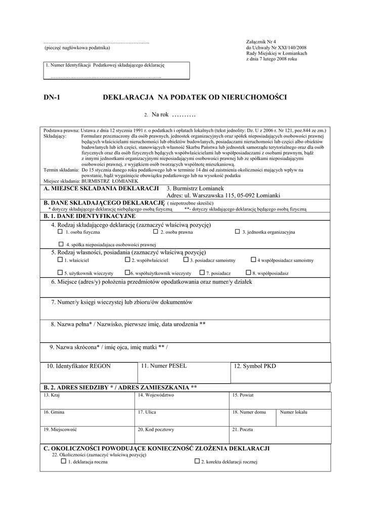 ……………………………………………………….. (pieczęć nagłówkowa podatnika) Załącznik Nr 4 do Uchwały Nr XXI/140/2008 Rady Miejskiej w Łomiankach z dnia 7 lutego 2008 roku 1. Numer Identyfikacji Podatkowej składającego deklarację ………………………………………………………….. DN-1 DEKLARACJA NA PODATEK OD NIERUCHOMOŚCI 2. Na rok ………. Podstawa prawna: Ustawa z dnia 12 stycznia 1991 r. o podatkach i opłatach lokalnych (tekst jednolity: Dz. U z 2006 r. Nr 121, poz.844 ze zm.) Składający: Formularz przeznaczony dla osób prawnych, jednostek organizacyjnych oraz spółek nieposiadających osobowości prawnej będących właścicielami nieruchomości lub obiektów budowlanych, posiadaczami nieruchomości lub części albo obiektów budowlanych lub ich części, stanowiących własność Skarbu Państwa lub jednostek samorządu terytorialnego oraz dla osób fizycznych oraz dla osób fizycznych będących współwłaścicielami lub współposiadaczami z osobami prawnym, bądź z innymi jednostkami organizacyjnymi nieposiadającymi osobowości prawnej lub ze spółkami nieposiadającymi osobowości prawnej, z wyjątkiem osób tworzących wspólnotę mieszkaniową. Termin składania: Do 15 stycznia danego roku podatkowego lub w terminie 14 dni od zaistnienia okoliczności mających wpływ na powstanie, bądź wygaśnięcie obowiązku podatkowego lub na wysokość podatku Miejsce składania: BURMISTRZ ŁOMIANEK A. MIEJSCE SKŁADANIA DEKLARACJI 3. Burmistrz Łomianek Adres: ul. Warszawska 115, 05-092 Łomianki B. DANE SKŁADAJĄCEGO DEKLARACJĘ ( niepotrzebne skreślić) * dotyczy składającego deklarację niebędącego osobą fizyczną **- dotyczy składającego deklarację będącego osobą fizyczną B. 1. DANE IDENTYFIKACYJNE 4. Rodzaj składającego deklarację (zaznaczyć właściwą pozycję) 1. osoba fizyczna 2. osoba prawna 3. jednostka organizacyjna 4. spółka nieposiadajaca osobowości prawnej 5. Rodzaj własności, posiadania (zaznaczyć właściwą pozycję) 1. właściciel 2. współwłaściciel 3. posiadacz samoistny 5. użytkownik wieczysty 6. współużytkownik wieczysty 7. posiadacz 4 współposiadacz samoistny 8. współposiadasz 6. Miejsce (adres/y) położenia przedmiotów opodatkowania oraz numer/y działek 7. Numer/y księgi wieczystej lub zbioru/ów dokumentów 8. Nazwa pełna* / Nazwisko, pierwsze imię, data urodzenia ** 9. Nazwa skrócona* / imię ojca, imię matki ** / 10. Identyfikator REGON 11. Numer PESEL 12. Symbol PKD B. 2. ADRES SIEDZIBY * / ADRES ZAMIESZKANIA ** 13. Kraj 14. Województwo 15. Powiat 16. Gmina 17. Ulica 18. Numer domu 19. Miejscowość 20. Kod pocztowy 21. Poczta C. OKOLICZNOŚCI POWODUJĄCE KONIECZNOŚĆ ZŁOŻENIA DEKLARACJI 22. Okoliczności (zaznaczyć właściwą pozycję) 1. deklaracja roczna 2. korekta deklaracji rocznej Numer lokalu D. DANE DOTYCZĄCE PRZEDMIOTÓW OPODATKOWANIA ( z wyjątkiem zwolnionych) Wyszczególnienie D.1 POWIERZCHNIA GRUNTÓW 1. związanych z prowadzeniem działalności gospodarczej bez względu na sposób zakwalifikowania w ewidencji gruntów i budynków 2. pod jeziorami, zajętych na zbiorniki wodne retencyjne lub elektrowni wodnych 3. związanych z prowadzeniem odpłatnej statutowej działalności pożytku publicznego przez organizacje pożytku publicznego Podstawa opodatkowania w m² Stawka podatku w zł Kwota podatku w zł. gr 23. 24. 25. ………………….zł 27. ………………….zł 30. .……………….. zł 28. ………...……….zł 31 …………….m² 26. …………….m² 29. ……………….m² ………………….zł ……….………….zł 32. 33. 34. 4. pozostałych ……………….m² ……..………….zł …….…………….zł D.2 POWIERZCHNIA UŻYTKOWA BUDYNKÓW LUB ICH CZĘŚCI ( *) Do powierzchni użytkowej budynku lub jego części należy zaliczyć powierzchnię mierzoną, po wewnętrznej długości ścian na wszystkich kondygnacjach, z wyjątkiem powierzchni klatek schodowych oraz szybów dźwigowych. Za kondygnację uważa się również garaże podziemne, piwnice sutereny i poddasza użytkowe. 35. 36. 37. 1. mieszkalnych – ogółem ……..….……….m² ……..………….zł ……….………….zł w tym: - kondygnacji o wysokości od 1,40m do 2,20m (zaliczyć w 50% powierzchni ) ……..…..……….m² …. …...………….zł - kondygnacji o wysokości powyżej 2,20 m ……..…..……….m² …....….………….zł 2. zajętych na prowadzenie działalności gospodarczej oraz od części budynków mieszkalnych zajętych na prowadzenie działalności gospodarczej - ogółem w tym: - kondygnacji o wysokości od 1,40m do 2,20m (zaliczyć w 50% powierzchni ) - kondygnacji o wysokości powyżej 2,20m 38. 3. zajętych na prowadzenie działalności gospodarczej w zakresie obrotu kwalifikowanym materiałem siewnym ogółem w tym: - kondygnacji wysokości od 1,40m do 2,20m (zaliczyć 50% powierzchni) - kondygnacji o wysokości powyżej 2,20m 41. 4. zajętych na prowadzenie działalności gospodarczej w zakresie udzielania świadczeń zdrowotnych ogółem, w tym: - kondygnacji o wysokości od 1,40m do 2,20m (zaliczyć w 50% powierzchni), - kondygnacji o wysokości powyżej 2,20m 42. ..……….….…….m² 5. pozostałych, – ogółem w tym: - kondygnacji o wysokości od 1,40m do 2,20m (zaliczyć 50% powierzchni), - kondygnacji o wysokości powyżej 2,20m 6. zajętych na prowadzenie odpłatnej działalności pożytku publicznego przez organizacje pożytku publicznego ogółem w tym: - kondygnacji o wysokości od 1,40 do 2,20m (zaliczyć 50% powierzchni), - kondygnacji o wysokości 2,20m …….…..……….m² 39. 40. ……...………….zł ……..……..…….m² ……….………….m² ………………….m² …. ..…………….zł …........………….zł 42 43. ……..………….zł ……….………….m² ………….……….m² …..….