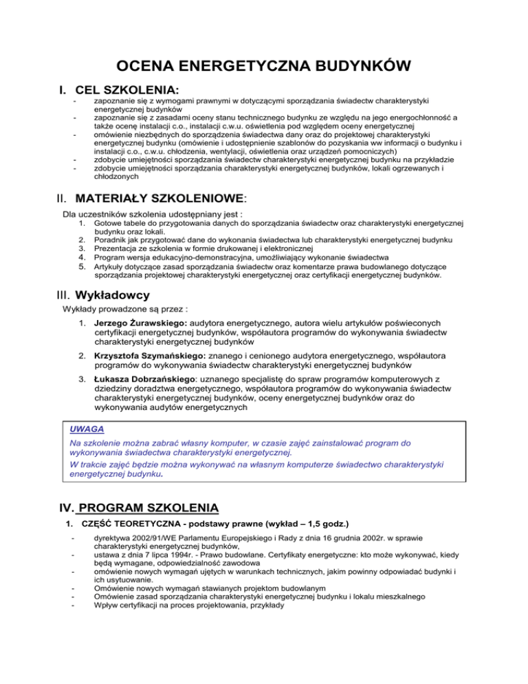 OCENA ENERGETYCZNA BUDYNKÓW I. CEL SZKOLENIA: - zapoznanie się z wymogami prawnymi w dotyczącymi sporządzania świadectw charakterystyki energetycznej budynków zapoznanie się z zasadami oceny stanu technicznego budynku ze względu na jego energochłonność a także ocenę instalacji c.o., instalacji c.w.u. oświetlenia pod względem oceny energetycznej omówienie niezbędnych do sporządzenia świadectwa dany oraz do projektowej charakterystyki energetycznej budynku (omówienie i udostępnienie szablonów do pozyskania ww informacji o budynku i instalacji c.o., c.w.u. chłodzenia, wentylacji, oświetlenia oraz urządzeń pomocniczych) zdobycie umiejętności sporządzania świadectw charakterystyki energetycznej budynku na przykładzie zdobycie umiejętności sporządzania charakterystyki energetycznej budynków, lokali ogrzewanych i chłodzonych - - II. MATERIAŁY SZKOLENIOWE: Dla uczestników szkolenia udostępniany jest : 1. 2. 3. 4. 5. Gotowe tabele do przygotowania danych do sporządzania świadectw oraz charakterystyki energetycznej budynku oraz lokali. Poradnik jak przygotować dane do wykonania świadectwa lub charakterystyki energetycznej budynku Prezentacja ze szkolenia w formie drukowanej i elektronicznej Program wersja edukacyjno-demonstracyjna, umożliwiający wykonanie świadectwa Artykuły dotyczące zasad sporządzania świadectw oraz komentarze prawa budowlanego dotyczące sporządzania projektowej charakterystyki energetycznej oraz certyfikacji energetycznej budynków. III. Wykładowcy Wykłady prowadzone są przez : 1. Jerzego Żurawskiego: audytora energetycznego, autora wielu artykułów poświeconych certyfikacji energetycznej budynków, współautora programów do wykonywania świadectw charakterystyki energetycznej budynków 2. Krzysztofa Szymańskiego: znanego i cenionego audytora energetycznego, współautora programów do wykonywania świadectw charakterystyki energetycznej budynków 3. Łukasza Dobrzańskiego: uznanego specjalistę do spraw programów komputerowych z dziedziny doradztwa energetycznego, współautora programów do wykonywania świadectw charakterystyki energetycznej budynków, oceny energetycznej budynków oraz do wykonywania audytów energetycznych UWAGA Na szkolenie można zabrać własny komputer, w czasie zajęć zainstalować program do wykonywania świadectwa charakterystyki energetycznej. W trakcie zajęć będzie można wykonywać na własnym komputerze świadectwo charakterystyki energetycznej budynku. IV. PROGRAM SZKOLENIA 1. CZĘŚĆ TEORETYCZNA - podstawy prawne (wykład – 1,5 godz.) - dyrektywa 2002/91/WE Parlamentu Europejskiego i Rady z dnia 16 grudnia 2002r. w sprawie charakterystyki energetycznej budynków, ustawa z dnia 7 lipca 1994r. - Prawo budowlane. Certyfikaty energetyczne: kto może wykonywać, kiedy będą wymagane, odpowiedzialność zawodowa omówienie nowych wymagań ujętych w warunkach technicznych, jakim powinny odpowiadać budynki i ich usytuowanie. Omówienie nowych wymagań stawianych projektom budowlanym Omówienie zasad sporządzania charakterystyki energetycznej budynku i lokalu mieszkalnego Wpływ certyfikacji na proces projektowania, przykłady 2. PRZYGOTOWANIE DANYCH DO ŚWIADECTWA LUB CHRAKTERYSTKI ENERGETYCZNEJ BUDYNKU – omówienie, przykłady (0,5 godz.) 3. WYKONANIE ŚWIADECTWA i CHARAKTERYSTKI ENERGETYCZNEJ DLA BUDYNKU OGRZEWANEGO (3,0 godz.) Zyski ciepła w budynku, lokalu w budynku mieszkalnym w budynku biurowym w budynku produkcyjnym w innych budynkach Określenie zacienienia typy zacienienia zacienienie od otoczenia zacienienie od elementów poziomych, pionowych zacienienie od elementów ruchomych Szczelność budynku w budynku nowych z wentylacją naturalną w budynkach istniejących z wentylacją naturalną w budynku istniejących z wentylacją mechaniczną w budynku nowych z wentylacją mechaniczną Sprawność c.o. i c.w.u. na jakość energetyczną budynku Sprawność elementów systemu grzewczego Sprawność elementów systemu zaopatrzenia w ciepłą wodę użytkową, Alternatywne źródła energii. Urządzenia pomocnicze Oświetlenie w budynku a ocena energetyczna budynku oświetlenie energooszczędne, systemy oświetlenia dziennego, możliwości sterowania systemem oświetleniowym, przedsięwzięcie zmniejszające zużycie energii na oświetlenie Wentylacja w budynku określenie wymaganej wymiany powietrza w pomieszczeniach wentylacja naturalna, hybrydowa, aeracja, wentylacja mechaniczna, z odzyskiem ciepła (rekuperacja) oraz z wymiennikami gruntowymi Ochrona cieplna budynku Szczelności przegród i budynku, termowizja w procesie oceny jakości energetycznej przegród Parametry izolacyjne przegród budowlanych, Mostki cieplne w przegrodach 4. WYKONANIE CHRAKTERYSTKI ENERGETYCZNEJ BUDYNKU OGRZEWANEGO I CHŁODZONEGO (1,5 godziny) Strefy w budynkach ogrzewanych i chłodzonych - Zasady sporządzania świadectwa budynku ogrzewanego i chłodzonego Podział na strefy Określanie przerw w grzaniu i chłodzeniu Zyski ciepła w budynkach ogrzewanych i chłodzonych Zyski ciepła na poziomie lokalu i pomieszczenia Zyski od oświetlenia, urządzeń elektrycznych, ludzi, cieczy i procesów produkcyjnych Instalacje chłodnicze Określanie parametrów instalacji chłodniczej Zacienienie Zacienienie w pomieszczeniach chłodzących: osłony stałe i zmienne w budynkach Wykonanie świadectwa dla budynku chłodzonego 5. PRZYGOTOWANIE PROCESU INWESTYCYJNEGO A JAKOŚĆ ENERGETYCZNA BUDYNKÓW (1,0 godz.) - Przygotowanie koncepcji a ocena energetyczna budynku (ocena energetyczna na etapie koncepcji, przykłady) Wpływ izolacyjności termicznej przegród budowlanych na jakość energetyczną budynku Wpływ sprawności c.o. i c.w.u. na jakość energetyczną budynku Odnawialne źródła energii na etapie projektowania i oceny energetycznej budynku