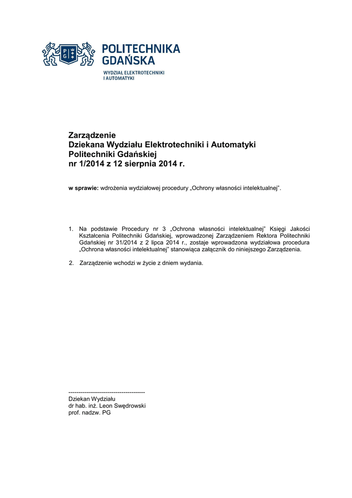 Zarządzenie Dziekana Wydziału Elektrotechniki i Automatyki Politechniki Gdańskiej nr 1/2014 z 12 sierpnia 2014 r. w sprawie: wdrożenia wydziałowej procedury „Ochrony własności intelektualnej”. 1. Na podstawie Procedury nr 3 „Ochrona własności intelektualnej” Księgi Jakości Kształcenia Politechniki Gdańskiej, wprowadzonej Zarządzeniem Rektora Politechniki Gdańskiej nr 31/2014 z 2 lipca 2014 r., zostaje wprowadzona wydziałowa procedura „Ochrona własności intelektualnej” stanowiąca załącznik do niniejszego Zarządzenia. 2. Zarządzenie wchodzi w życie z dniem wydania. --------------------------------------Dziekan Wydziału dr hab. inż. Leon Swędrowski prof. nadzw. PG 1. PROCEDURA WYDZIAŁOWA zatwierdzona przez Dziekana Wydziału Elektrotechniki i Automatyki w dniu 12.08.2014 r. Data aktualizacji: 2014-08-12 Ochrona własności intelektualnej Strona 2/6 Cel, przedmiot i zakres działań 1.1. Celem wydziałowej procedury „Ochrony własności intelektualnej” jest przeciwdziałanie naruszaniu praw autorskich i nieuprawnionemu wykorzystywaniu cudzej własności intelektualnej na Wydziale Elektrotechniki i Automatyki Politechniki Gdańskiej. 1.2. Przedmiotem działań, w ramach niniejszej procedury wydziałowej, jest weryfikacja przez system antyplagiatowy treści prac dyplomowych/projektów dyplomowych realizowanych na studiach wyższych na Wydziale Elektrotechniki i Automatyki PG, które w dalszej części niniejszego dokumentu nazywane są pracami. 1.3. Prace są wykonywane przez studentów, którzy w dalszej części niniejszego dokumentu są nazywani autorami prac. 1.4. Prace są wykonywane pod kierunkiem opiekunów. 1.5. Niniejsza procedura wydziałowa wchodzi w życie z dniem zatwierdzenia przez Dziekana Wydziału Elektrotechniki i Automatyki PG. 2. Wykaz pojęć stosowanych w procedurze wydziałowej 2.1. System antyplagiatowy – stosowane na Wydziale narzędzie informatyczne o nazwie System Ochrony Własności Intelektualnej PG (SOWI), służące do weryfikacji prac pod kątem ich autorskiego charakteru; dostępne na portalu mojaPG w zakładce Dyplomy, a także pod adresem internetowym https://sowi.pg.gda.pl. 2.2. Weryfikacja pracy –proces, w którym system antyplagiatowy wyszukuje dokumenty podobne do weryfikowanej pracy, a następnie oblicza stopień podobieństwa tekstu wyodrębnionego z pracy weryfikowanej z tekstami wyodrębnionymi ze znalezionych dokumentów. Praca porównywana jest z tekstami znajdującymi się w bazie systemu antyplagiatowego PG (prace wykonane na PG i prace innych uczelni) oraz z zasobami Internetu. Na zakończenie procesu weryfikacji, system antyplagiatowy generuje raport. 2.3. Raport – podsumowanie wyników weryfikacji pracy generowane przez system antyplagiatowy. 2.4. Skierowanie pracy do weryfikacji przez system antyplagiatowy (załącznik nr 1). 2.5. Opinia opiekuna – zaświadczenie wydawane przez opiekuna na podstawie raportu (załącznik nr 2). 2.6. Sprawozdanie z raportów – sprawozdanie przygotowywane semestralnie na podstawie raportów przez Centrum Usług Informatycznych (CUI). 2.7. Operator systemu – pracownik powołany przez Dziekana do interpretowania i poświadczania raportów. Na Wydziale Elektrotechniki i Automatyki funkcję tę pełnią opiekunowie. 2.8. Administrator systemu – pracownik powołany przez Dziekana do obsługi technicznej i kontaktu z dostawcą systemu antyplagiatowego. 3. Opis postępowania w ramach procedury 3.1. Autor pracy przekazuje opiekunowi wersję papierową pracy. 3.2. Po uzyskaniu skierowania od opiekuna (załącznik nr 1) autor pracy wprowadza wersję elektroniczną pracy, o treści identycznej z wersją papierową, do systemu antyplagiatowego. 3.3. Dla każdej wprowadzonej pracy, system antyplagiatowy generuje raport. 3.4. Raport jest dostępny na portalu mojaPG zarówno dla autora pracy, jak i opiekuna. 3.5. Portal mojaPG przesyła informację e-mailową do autora pracy i opiekuna o dostępności raportu. PROCEDURA WYDZIAŁOWA zatwierdzona przez Dziekana Wydziału Elektrotechniki i Automatyki w dniu 12.08.2014 r. Data aktualizacji: 2014-08-12 Ochrona własności intelektualnej Strona 3/6 3.6. Opiekun zapoznaje się z treścią raportu i podejmuje decyzję o dalszym trybie postępowania (akceptacji pracy lub nie), czyli może: 3.6.1. zaakceptować pracę bez konieczności dokonywania zmian/poprawek w jej treści; 3.6.2. skierować pracę do autora w celu wprowadzenia zmian/poprawek; 3.6.3. nie przyjąć pracy i przekazać sprawę do decyzji Dziekana. 3.7. Autor odbiera od opiekuna opinię (załącznik 2) w przypadku, gdy praca jest zaakceptowana lub wymaga wprowadzenia zmian/poprawek. 3.8. Opiekun osobiście przekazuje pracę w wersji papierowej wraz z opinią (załącznik 2) do Dziekanatu, gdy praca nie została przyjęta. 3.9. Autor pracy przekazuje zaakceptowaną pracę w wersji papierowej wraz z opinią (załącznik 2) i wydrukiem raportu do Dziekanatu. 3.10. Raport, opinia opiekuna oraz inne dokumenty związane ze sprawą weryfikacji autorskiego charakteru pracy, dołączane są do dokumentów autora pracy przechowywanych w Dziekanacie. 3.11. Dziekanat dodaje zaakceptowaną pracę do bazy danych systemu antyplagiatowego i do repozytorium dokumentów cyfrowych Uczelni. 3.12. W przypadku braku akceptacji pracy, na podstawie opinii opiekuna, Dziekan może: 3.12.1. po konsultacji z opiekunem skierować pracę do autora w celu wprowadzenia zmian/poprawek, 3.12.2. skierować pracę dyplomową do recenzji, której celem będzie stwierdzenie wystąpienia plagiatu, a po jego potwierdzeniu wystąpić do rektora PG z wnioskiem o wszczęcie postępowania dyscyplinarnego wobec autora pracy zgodnie z art. 214 ust. 4 ustawy z dnia 27 lipca 2005 r. Prawo o szkolnictwie wyższym (Dz. U. 2012 poz. 572 z późn. zm) oraz zgodnie z rozporządzeniem Ministra Nauki i Szkolnictwa Wyższego z dnia 6 grudnia 2006 r. w sprawie szczegółowego trybu postępowania wyjaśniającego i dyscyp