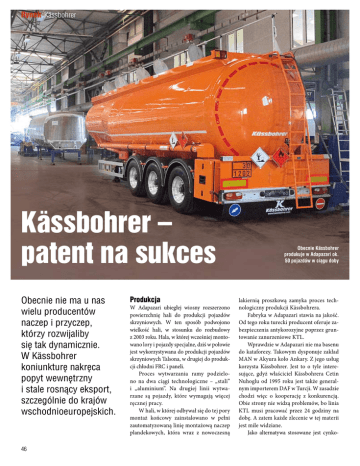 Rynek Kässbohrer Kässbohrer – patent na sukces Obecnie nie ma u nas wielu producentów naczep i przyczep, którzy rozwijaliby się tak dynamicznie. W Kässbohrer koniunkturę nakręca popyt wewnętrzny i stale rosnący eksport, szczególnie do krajów wschodnioeuropejskich. 46 Produkcja W Adapazari ubiegłej wiosny rozszerzono powierzchnię hali do produkcji pojazdów skrzyniowych. W ten sposób podwojono wielkość hali, w stosunku do rozbudowy z 2003 roku. Hala, w której wcześniej montowano lory i pojazdy specjalne, dziś w połowie jest wykorzystywana do produkcji pojazdów skrzyniowych Talsona, w drugiej do produkcji chłodni FRC i paneli. Proces wytwarzania ramy podzielono na dwa ciągi technologiczne – „stali” i „aluminium”. Na drugiej linii wytwarzane są pojazdy, które wymagają więcej ręcznej pracy. W hali, w której odbywał się do tej pory montaż końcowy zainstalowano w pełni zautomatyzowaną linię montażową naczep plandekowych, która wraz z nowoczesną Obecnie Kässbohrer produkuje w Adapazari ok. 50 pojazdów w ciągu doby lakiernią proszkową zamyka proces technologiczny produkcji Kässbohrera. Fabryka w Adapazari stawia na jakość. Od tego roku turecki producent oferuje zabezpieczenia antykorozyjne poprzez gruntowanie zanurzeniowe KTL. Wprawdzie w Adapazari nie ma basenu do kataforezy. Takowym dysponuje zakład MAN w Akyura koło Ankary. Z jego usług korzysta Kässbohrer. Jest to o tyle interesujące, gdyż właściciel Kässbohrera Cetin Nuhoglu od 1995 roku jest także generalnym importerem DAF w Turcji. W zasadzie chodzi więc o kooperację z konkurencją. Obie strony nie widzą problemów, bo linia KTL musi pracować przez 24 godziny na dobę. A zatem każde zlecenie w tej materii jest mile widziane. Jako alternatywa stosowane jest cynko- wanie ogniowe. Takie rozwiązanie znajduje zastosowanie dla podwozi i podłóg Talsona. To okazało się hitem, gdyż doskonale zdaje egzamin i sprawdza się w codziennym użytkowaniu, w trudnych warunkach. Obecnie Kässbohrer produkuje w Adapazari ok. 50 pojazdów w ciągu doby, na dwóch zmianach i ciągle zwiększa przepustowość fabryki. Docelowo mówi się o ponad 15000 szt. rocznie, a już w roku 2011 przekroczony został próg 10000. Liczba egzemplarzy mało mówi o rzeczywistej wydajności pracy, gdyż do programu należą także skrzynie, chłodnie, cysterny paliwowe, silosy oraz pojazdy niskopodwoziowe i kurtyny. Rozbudowa Fabryka postawiła na maksymalne skoncentrowanie operacji. Nowe budynki zostały wzniesione specjalnie po to, żeby na miejscu mieć dwóch dostawców podzespołów: jeden dostarcza profile walcowane i pojedyncze podwozia dla produkcji, drugi plandeki. Ich producent zresztą pochodzi z Oberhausen – Planen-Pfister. Jeszcze większym kompleksem jest nowy, od początku specjalnie zaprojektowany, budynek działu rozwoju. Konstruktorzy Kässbohrer do tej pory musieli walczyć z okolicznościami, żeby zakwaterować się gdzieś w fabryce na cykle testowe, np. te według normy EN 12642, tam Fabryka postawiła na maksymalne skoncentrowanie operacji Obecnie Kässbohrer produkuje w Adapazari ok. 50 pojazdów w ciągu doby, na dwóch zmianach i ciągle zwiększa przepustowość fabryki gdzie akurat było miejsce, a to znajdowało się rzadko. Dlatego konstruktorzy i dział testowy przewędrowali właśnie do nowej siedziby w północnej części fabryki. Posiadając klientów w 48 krajach na całym świecie Kässbohrer musiał od zawsze walczyć z dwiema „kulturami transportu”. Jedna to kultura wschodnia, gdzie „dopuszczalna masa całkowita jest równa masie użytkowej”, druga – przede wszystkim obowiązująca w transporcie międzynarodowym w krajach cywilizowanych – „40 t masy całkowitej, a w tym możliwie dużo masy użytkowej”. Pomiędzy tym znajdują się wszyscy przewoźnicy, którzy po prostu potrzebują naczepy czy przyczepy, która od czasu do czasu może być traktowana niezbyt delikatnie. Ponieważ tak różne podejścia funkcjonują do dziś, w programie Kässbohrer znajdują się zarówno „normalne” podwozia dla klientów, którzy tradycyjnie pracują z „dodatkami” jak i pojazdy dla optymalizatorów wagi, którzy z powodu obowiązujących limitów muszą optymalnie wycelować w ciężar użytkowy. Ponieważ w obszarze pojazdów budowlanych byli głównie tradycyjnie ukierunkowani klienci, Kässbohrer przez dziesiątki lat dostarczał same podwozia do producentów zabudów wywrotek w Niemczech. Ci istnieją również dzisiaj. Dopiero w ubiegłym roku opracowano własną okrągłą muldę Hardox 450 i połączono ze zoptymalizowanym pod względem wagi podwoziem. Program Od zawsze bazą programową dla Kässbohrer były naczepy plandekowe i firanki. Większość stanowią naczepy 13,6 m, ale są także wersje jedno- i dwuosiowe. Ta seria produkcyjna Maxima ma w Polsce, Włoszech i Niemczech 47 Rynek Kässbohrer Przed prawie trzema laty Kässbohrer zaprezentował też serię produkcyjną firanek „Light” Z nabyciem fabryki Kässbohrer w Günzburg Tirsan posiada także prawo do nazwy, logo, dokumentacji technicznej, narzędzi. a jeden z większych klientów Tirsan ma swoją siedzibę w Luksemburgu. Nowe serie produkcyjne Kiedy kryzys nadprodukcji naczep i przyczep wkroczył do Europy w roku 2008, Tirsan za małe pieniądze nabył stanowiska produkcyjne Univan. Produkcję skrzyni izolowanych z tworzywa sztucznego rozpoczęto przed rokiem. Teraz wszystko kręci się wokół modelu naczepy 13,6 m, przy czym jasne jest, że w przyszłości trzeba będzie zaoferować także zabudowy ciężarówek i przyczepy skrzyniowe. Obecnie od Tirsan dostępne są tylko nadbudówki wyłącznie dla firanek. Kässbohrer bardzo szybko podjął temat pojazdów niskopodwoziowych, ale długo był niezdecydowany, co do naczep wywrotek. Z powodu faktu, że rodzimi przewoźnicy posiadający wywrotki pielęgnują zasady starej „kultury transportu” (masa całkowita równa s