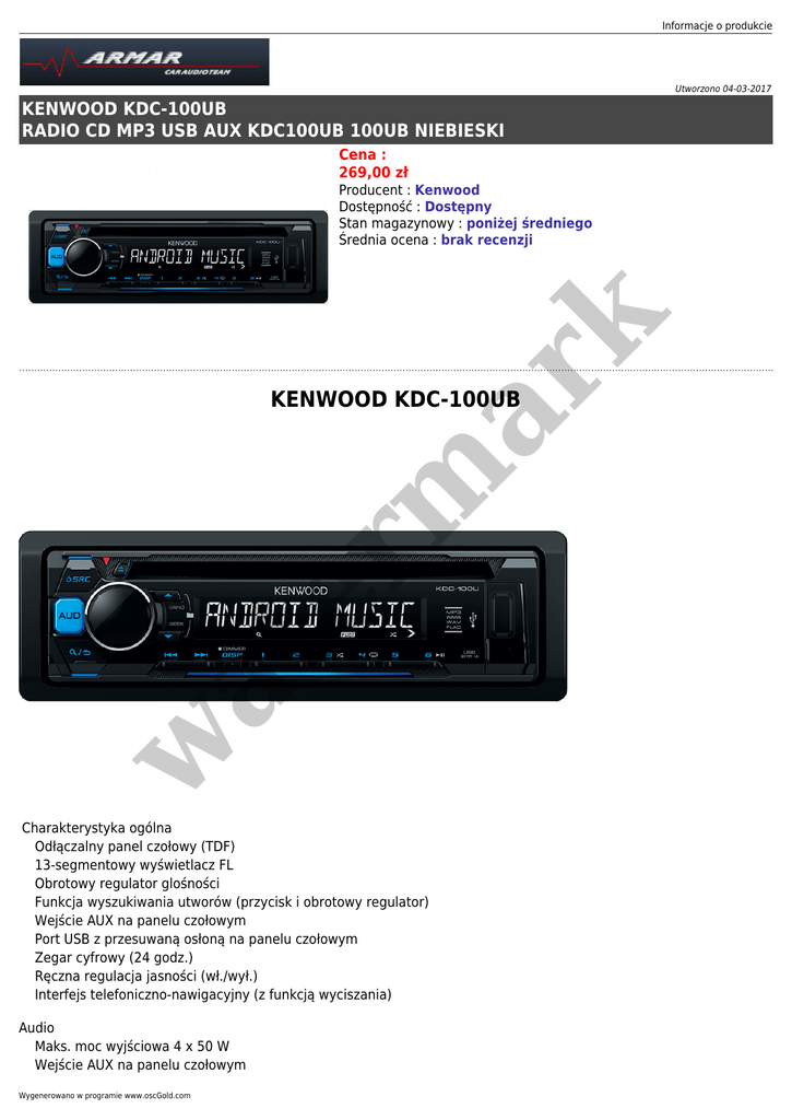 Informacje o produkcie Utworzono 04-03-2017 KENWOOD KDC-100UB RADIO CD MP3 USB AUX KDC100UB 100UB NIEBIESKI Cena : 269,00 zł er m ar k Producent : Kenwood Dostępność : Dostępny Stan magazynowy : poniżej średniego Średnia ocena : brak recenzji w at KENWOOD KDC-100UB Charakterystyka ogólna Odłączalny panel czołowy (TDF) 13-segmentowy wyświetlacz FL Obrotowy regulator glośności Funkcja wyszukiwania utworów (przycisk i obrotowy regulator) Wejście AUX na panelu czołowym Port USB z przesuwaną osłoną na panelu czołowym Zegar cyfrowy (24 godz.) Ręczna regulacja jasności (wł./wył.) Interfejs telefoniczno-nawigacyjny (z funkcją wyciszania) Audio Maks. moc wyjściowa 4 x 50 W Wejście AUX na panelu czołowym Wygenerowano w programie www.oscGold.com 1 wyjście przedwzmacniacza Przełączalny kanał tylny/subwooferowy Wyjście subwooferowe z filtrem dolnoprzepustowym i regulacją poziomu System Q (zaprogramowane krzywe korekcji) Bass Boost Regulacja równowagi kanałów przedniego i tylnego (Fade) i funkcja konturu (Loudness) Port USB Port USB z przesuwaną osłoną na panelu czołowym Odtwarzanie plików AAC (Advanced Audio Codec) Odtwarzanie plików WMA (Windows Media Audio) Odtwarzanie plików MP3 z wyświetlaniem informacji ID-3 Tag er m ar k Tuner Programowanie 24 stacji: 18 UKF, 3 f. dł./3 f. śr. System RDS z Radio Text Inteligentny tuner czystego odbioru K3I Automatyczne programowanie stacji (AME) Strojenie w kierunku wyższych/niższych częstotliwości Odbiór UKF w trybie stereo lub mono W zestawie: at Odtwarzacz CD Odtwarzanie plików AAC (Advanced Audio Codec) Odtwarzanie plików WMA Odtwarzanie plików MP3 z wyświetlaniem informacji ID-3 Tag Wyszukiwanie folderów bez przerywania odtwarzania Odtwarzanie płyt wielosesyjnych Odtwarzanie płyt CD-R/CD-RW Wyświetlanie informacji CD-Text Odtwarzanie losowe, powtarzane i skanowanie (Intro) Przetwornik cyfrowo-analogowy 24 bit Wyciszanie zerobitowe Supreme w KENWOOD KDC-100UB NIEBIESKI INSTRUKCJA KLUCZE MONTAŻOWE PÓŁKIESZEŃ MONTAŻOWA ZŁĄCZE ISO w at er m ar k Informacje o produkcie Wygenerowano w programie www.oscGold.com