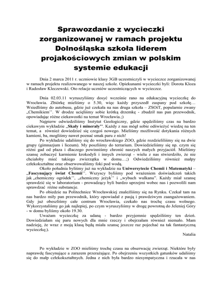 Sprawozdanie z wycieczki zorganizowanej w ramach projektu Dolnośląska szkoła liderem projakościowych zmian w polskim systemie edukacji Dnia 2 marca 2011 r. uczniowie klasy 3GB uczestniczyli w wycieczce zorganizowanej w ramach projektu realizowanego w naszej szkole. Opiekunami wycieczki byli: Dorota Kloza i Radosław Kleczewski. Oto relacje uczniów uczestniczących w wycieczce. Dnia 02.03.11 wyruszyliśmy dosyć wcześnie rano na edukacyjną wycieczkę do Wrocławia. Zbiórkę mieliśmy o 5.30, więc kaŜdy przyszedł zaspany pod szkołę… Wsiedliśmy do autobusu, gdzie juŜ czekała na nas druga szkoła – ZSOiT, popularnie zwany „Chemikiem’’. W drodze ucięliśmy sobie krótką drzemkę - zbudził nas pan przewodnik, opowiadając róŜne ciekawostki na temat Wrocławia.;) Najpierw odwiedziliśmy Instytut Geologiczny, gdzie spędziliśmy czas na bardzo ciekawym wykładzie „Skały i minerały’’. KaŜdy z nas mógł sobie odświeŜyć wiedzę na ten temat, a równieŜ dowiedzieć się czegoś nowego. Mieliśmy moŜliwość dotykania róŜnych kamieni, ba, mogliśmy nawet poznać smak paru z nich! Po wykładzie udaliśmy się do wrocławskiego ZOO, gdzie rozdzieliliśmy się na dwie grupy (gimnazjum i liceum). My poszliśmy do terrarium. Dowiedzieliśmy się np. czym się róŜni gad od płaza i dlaczego powinniśmy chronić naszych małych przyjaciół. Mieliśmy szansę zobaczyć karmienie krokodyli i innych zwierząt - wielu z nas stwierdziło, Ŝe nie chciałoby mieć takiego zwierzątka w domu…;) Odwiedziliśmy równieŜ małpy człekokształtne oraz obserwowaliśmy foki pod wodą. Około południa byliśmy juŜ na wykładzie na Uniwersytecie Chemii i Matematyki – „Fascynujący świat Chemii’’. Wszyscy byliśmy pod wraŜeniem doświadczeń takich jak „chemiczny ogródek’’, „chemiczny jeŜyk’’ i „wybuch wulkanu”. KaŜdy miał szansę sprawdzić się w laboratorium - prowadzący byli bardzo uprzejmi wobec nas i pozwolili nam sprawdzać róŜne substancje. Po obiedzie na Politechnice Wrocławskiej znaleźliśmy się na Rynku. Czekał tam na nas bardzo miły pan przewodnik, który opowiadał z pasją i prawdziwym zaangaŜowaniem. Gdy juŜ obeszliśmy całe centrum Wrocławia, czekało nas trochę czasu wolnego. Wykorzystaliśmy go jak najlepiej, po czym wyruszyliśmy w drogę powrotną do Jeleniej Góry - w domu byliśmy około 19.30. UwaŜam wycieczkę za udaną - bardzo przyjemnie spędziliśmy ten dzień. Dowiedziałam się paru nowych dla mnie rzeczy i obejrzałam równieŜ niemało. Mam nadzieję, Ŝe wraz z moją klasą będą miała szansę jeszcze raz pojechać na tak fantastyczną wycieczkę;). Natalia Po wykładzie w ZOO mieliśmy trochę czasu na obserwację zwierząt. Niektóre były naprawdę fascynujące a zarazem przeraŜające. Po obejrzeniu wszystkich gatunków udaliśmy się do małp człekokształtnych. Jedna z nich była bardzo niesympatyczna i rzucała w nas miśkami. Potem idąc do autokaru mieliśmy jeszcze okazję zaobserwować róŜne inne zwierzęta, od ptaków po niedźwiedzie. Po wyjściu z ZOO udaliśmy się na obiad, który nie był wyśmienity, ale głodni mogli się posilić. Kolejnym punktem naszej wycieczki był Wydział Chemii na Uniwersytecie Wrocławskim. Celem tego spotkania było omówienie i pokazanie nam prostych, interesujących doświadczeń w laboratorium. Następnie udaliśmy się do miasta by zwiedzić ratusz i okoliczne punkty godne uwagi i zainteresowania. Towarzyszył nam przewodnik, który dokładnie opisał kaŜde odwiedzane miejsce. Po zwiedzeniu ratusza poszliśmy do galerii dominikańskiej, gdzie mieliśmy pół godziny, by coś zjeść, czy po prostu cokolwiek pooglądać. Myślę, Ŝe wycieczka była poŜyteczna i ciekawa. Najmniej interesujący był dla mnie początek w Instytucie Nauk Geologicznych. Na dworze pomimo słońca było bardzo zimno, takŜe spacer po rynku równieŜ mi się nie spodobał, jak i większości uczestników. Poza tym była to jakaś ciekawa odmiana nauki i cieszę się, Ŝe tam byłam. Paula We wrocławskim ZOO widzieliśmy wiele gatunków Ŝab, które zaciekawiły mnie najbardziej. Zobaczyliśmy równieŜ krokodyle i małpy. Następnie byliśmy na niesamowitych wykładach z chemii, na których ujrzeliśmy kilka ciekawych i fascynujących doświadczeń. Potem głodni i zmęczeni, poszliśmy na pyszny obiad na stołówce Politechniki wrocławskiej. Pod koniec naszej wycieczki zwiedziliśmy centrum miasta, rynek i wiele innych obiektów znajdujących się na jego terenie. Prowadził nas miły przewodnik, ciekawie opowiadając legendy i mity. Moim zdaniem wycieczka była bardzo udana. Nauczyłem się wiele nowych rzeczy. Bardzo się cieszę, Ŝe pojechałem na tą wycieczkę. Marcel Kiedy dojechaliśmy na miejsce, pierwsze zajęcia, na które poszliśmy odbyły się w Muzeum Geologii, a wykłady były na temat kamieni i minerałów. Wszyscy mogliśmy je zobaczyć i dotknąć. Następnie udaliśmy się do ZOO, gdzie mogliśmy podziwiać wiele okazów zwierząt. Główne zajęcia jednak odbywały na temat płazów i gadów. Mieliśmy okazje poznać bardzo rzadkie i niespotykane gatunki zwierząt (Ŝółwi, Ŝab, motyli, węŜy). Mimo to w pamięć najbardziej zapadły mi krokodyle, jaja z których niebawem mogły się wykluć młode ☺. Kolejnym punktem wycieczki były wykłady z chemii, na których przedstawiono nam sporo niebywałych eksperymentów – wybuchający mini-wulkan, chemiczny ogródek w którym „roślinki” rosły w oczach, a takŜe wiele innych. Później pojechaliśmy na obiad, a pod sam koniec zwiedzaliśmy z panem przewodnikiem Wrocław, szukając zarazem po drodze wszystkich krasnali, których sami nigdy byśmy nie znaleźli. Przewodnik pokazał nam zakątki miasta o których istnieniu nawet nie mieliśmy pojęcia i do kaŜdego przedstawiał wciągającą historie. Na sam koniec udaliśmy się na chwile do galerii dominikańskiej, a zaraz po tym 