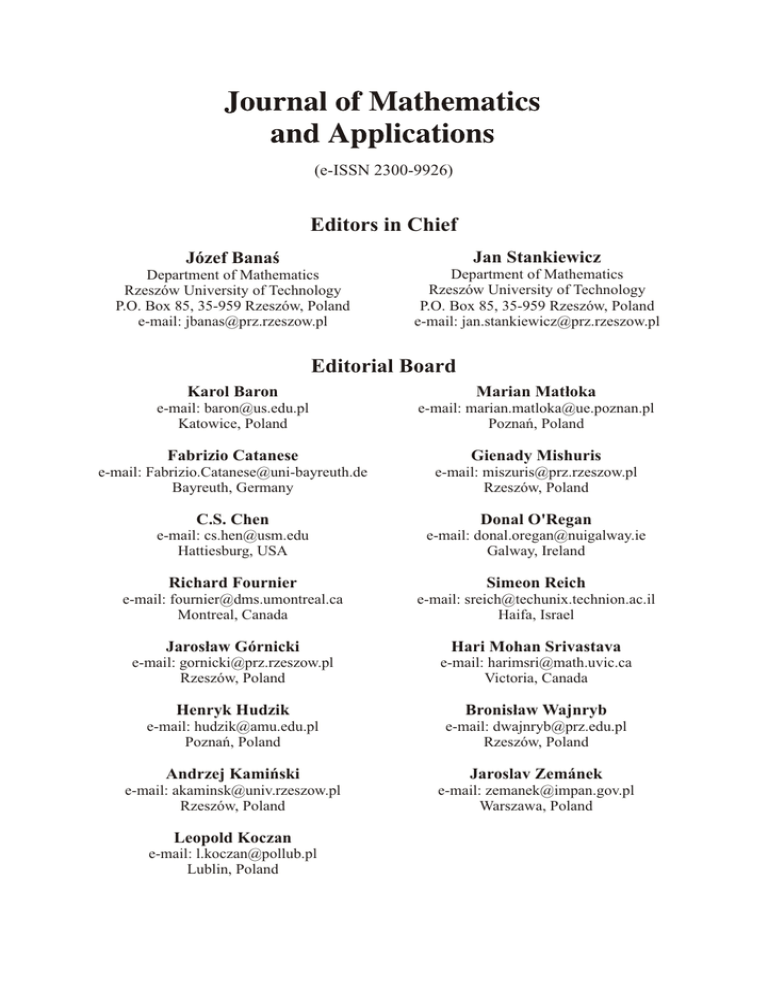 (e-ISSN 2300-9926) Editors in Chief Józef Banaś Jan Stankiewicz Department of Mathematics Rzeszów University of Technology P.O. Box 85, 35-959 Rzeszów, Poland e-mail: [email protected] Department of Mathematics Rzeszów University of Technology P.O. Box 85, 35-959 Rzeszów, Poland e-mail: [email protected] Editorial Board Karol Baron Marian Matłoka e-mail: [email protected] Katowice, Poland e-mail: [email protected] Poznań, Poland Fabrizio Catanese Gienady Mishuris e-mail: [email protected] Bayreuth, Germany e-mail: [email protected] Rzeszów, Poland C.S. Chen Donal O'Regan e-mail: [email protected] Hattiesburg, USA e-mail: [email protected] Galway, Ireland Richard Fournier Simeon Reich e-mail: [email protected] Montreal, Canada e-mail: [email protected] Haifa, Israel Jarosław Górnicki Hari Mohan Srivastava e-mail: [email protected] Rzeszów, Poland e-mail: [email protected] Victoria, Canada Henryk Hudzik Bronisław Wajnryb e-mail: [email protected] Poznań, Poland e-mail: [email protected] Rzeszów, Poland Andrzej Kamiński Jaroslav Zemánek e-mail: [email protected] Rzeszów, Poland e-mail: [email protected] Warszawa, Poland Leopold Koczan e-mail: [email protected] Lublin, Poland
