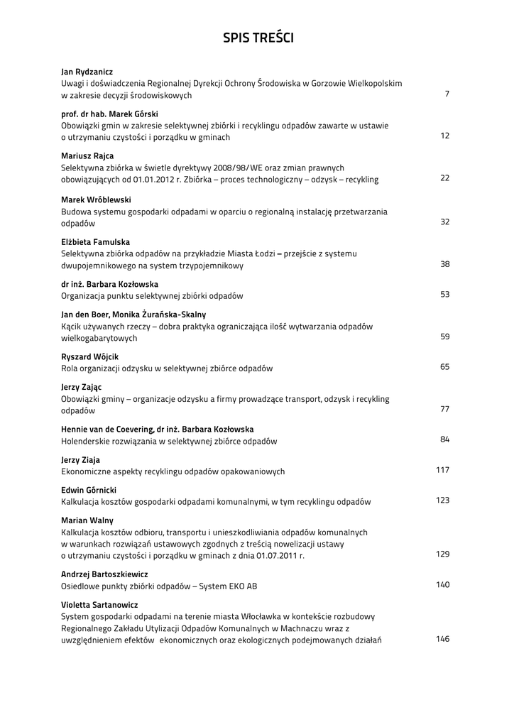 SPIS TREŚCI Jan Rydzanicz Uwagi i doświadczenia Regionalnej Dyrekcji Ochrony Środowiska w Gorzowie Wielkopolskim w zakresie decyzji środowiskowych 7 prof. dr hab. Marek Górski Obowiązki gmin w zakresie selektywnej zbiórki i recyklingu odpadów zawarte w ustawie o utrzymaniu czystości i porządku w gminach 12 Mariusz Rajca Selektywna zbiórka w świetle dyrektywy 2008/98/WE oraz zmian prawnych obowiązujących od 01.01.2012 r. Zbiórka – proces technologiczny – odzysk – recykling 22 Marek Wróblewski Budowa systemu gospodarki odpadami w oparciu o regionalną instalację przetwarzania odpadów 32 Elżbieta Famulska Selektywna zbiórka odpadów na przykładzie Miasta Łodzi – przejście z systemu dwupojemnikowego na system trzypojemnikowy 38 dr inż. Barbara Kozłowska Organizacja punktu selektywnej zbiórki odpadów 53 Jan den Boer, Monika Żurańska-Skalny Kącik używanych rzeczy – dobra praktyka ograniczająca ilość wytwarzania odpadów wielkogabarytowych 59 Ryszard Wójcik Rola organizacji odzysku w selektywnej zbiórce odpadów 65 Jerzy Zając Obowiązki gminy – organizacje odzysku a firmy prowadzące transport, odzysk i recykling odpadów 77 Hennie van de Coevering, dr inż. Barbara Kozłowska Holenderskie rozwiązania w selektywnej zbiórce odpadów 84 Jerzy Ziaja Ekonomiczne aspekty recyklingu odpadów opakowaniowych 117 Edwin Górnicki Kalkulacja kosztów gospodarki odpadami komunalnymi, w tym recyklingu odpadów 123 Marian Walny Kalkulacja kosztów odbioru, transportu i unieszkodliwiania odpadów komunalnych w warunkach rozwiązań ustawowych zgodnych z treścią nowelizacji ustawy o utrzymaniu czystości i porządku w gminach z dnia 01.07.2011 r. 129 Andrzej Bartoszkiewicz Osiedlowe punkty zbiórki odpadów – System EKO AB 140 Violetta Sartanowicz System gospodarki odpadami na terenie miasta Włocławka w kontekście rozbudowy Regionalnego Zakładu Utylizacji Odpadów Komunalnych w Machnaczu wraz z uwzględnieniem efektów ekonomicznych oraz ekologicznych podejmowanych działań 146