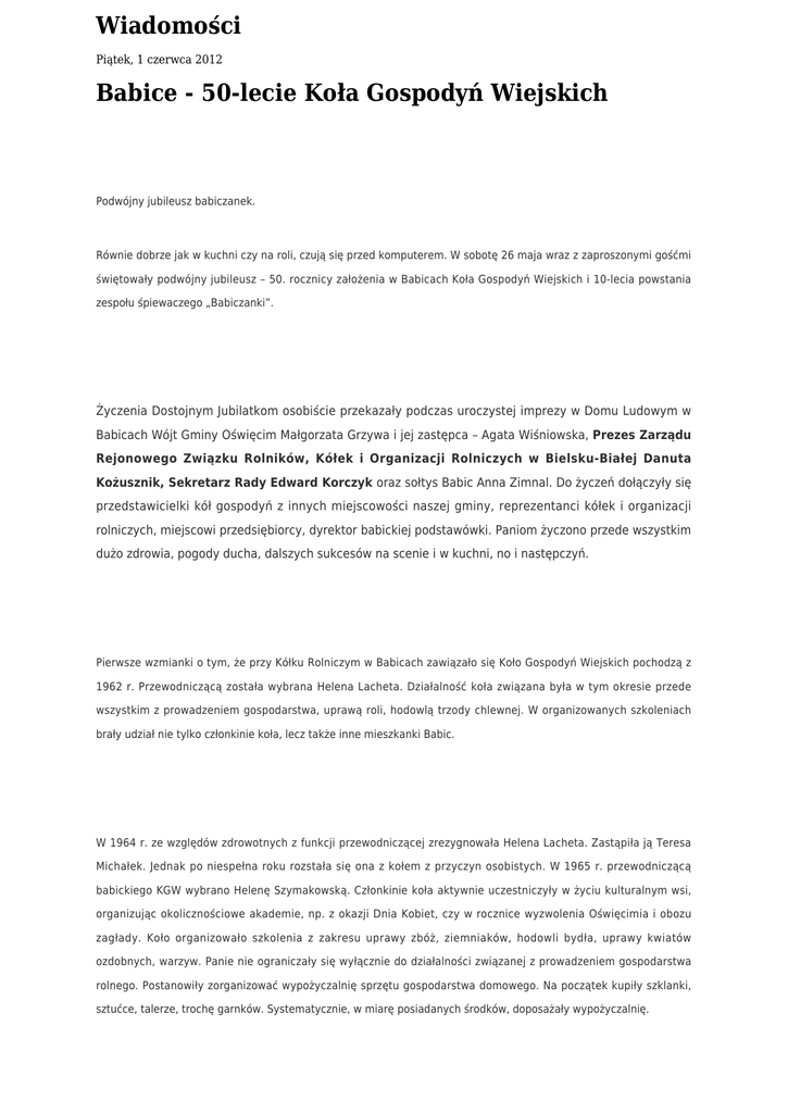 Wiadomości Piątek, 1 czerwca 2012 Babice - 50-lecie Koła Gospodyń Wiejskich Podwójny jubileusz babiczanek. Równie dobrze jak w kuchni czy na roli, czują się przed komputerem. W sobotę 26 maja wraz z zaproszonymi gośćmi świętowały podwójny jubileusz – 50. rocznicy założenia w Babicach Koła Gospodyń Wiejskich i 10-lecia powstania zespołu śpiewaczego „Babiczanki”. Życzenia Dostojnym Jubilatkom osobiście przekazały podczas uroczystej imprezy w Domu Ludowym w Babicach Wójt Gminy Oświęcim Małgorzata Grzywa i jej zastępca – Agata Wiśniowska, Prezes Zarządu Rejonowego Związku Rolników, Kółek i Organizacji Rolniczych w Bielsku-Białej Danuta Kożusznik, Sekretarz Rady Edward Korczyk oraz sołtys Babic Anna Zimnal. Do życzeń dołączyły się przedstawicielki kół gospodyń z innych miejscowości naszej gminy, reprezentanci kółek i organizacji rolniczych, miejscowi przedsiębiorcy, dyrektor babickiej podstawówki. Paniom życzono przede wszystkim dużo zdrowia, pogody ducha, dalszych sukcesów na scenie i w kuchni, no i następczyń. Pierwsze wzmianki o tym, że przy Kółku Rolniczym w Babicach zawiązało się Koło Gospodyń Wiejskich pochodzą z 1962 r. Przewodniczącą została wybrana Helena Lacheta. Działalność koła związana była w tym okresie przede wszystkim z prowadzeniem gospodarstwa, uprawą roli, hodowlą trzody chlewnej. W organizowanych szkoleniach brały udział nie tylko członkinie koła, lecz także inne mieszkanki Babic. W 1964 r. ze względów zdrowotnych z funkcji przewodniczącej zrezygnowała Helena Lacheta. Zastąpiła ją Teresa Michałek. Jednak po niespełna roku rozstała się ona z kołem z przyczyn osobistych. W 1965 r. przewodniczącą babickiego KGW wybrano Helenę Szymakowską. Członkinie koła aktywnie uczestniczyły w życiu kulturalnym wsi, organizując okolicznościowe akademie, np. z okazji Dnia Kobiet, czy w rocznice wyzwolenia Oświęcimia i obozu zagłady. Koło organizowało szkolenia z zakresu uprawy zbóż, ziemniaków, hodowli bydła, uprawy kwiatów ozdobnych, warzyw. Panie nie ograniczały się wyłącznie do działalności związanej z prowadzeniem gospodarstwa rolnego. Postanowiły zorganizować wypożyczalnię sprzętu gospodarstwa domowego. Na początek kupiły szklanki, sztućce, talerze, trochę garnków. Systematycznie, w miarę posiadanych środków, doposażały wypożyczalnię. W tym okresie koło nie posiadało stałej siedziby. Korzystało z pomieszczeń miejscowej szkoły lub Domu Ludowego, który zajmował Klub Ruch. W 1980 r. klub zlikwidowano, a pomieszczenia po Ruchu pozwolono zaadaptować przez KGW. Panie same je wymalowały, uporządkowały i dostosowały do własnych potrzeb. Swoją siedzibą nie nacieszyły się zbyt długo, bo już w 1983 r. Dom Ludowy został oddany do kapitalnego remontu. Wypożyczalnię przeniesiono do prywatnego domu, a zebrania członkiń odbywały się w szkole lub mieszkaniach prywatnych. W 1985 r. koło po raz pierwszy wzięło udział w konkursie wieńców dożynkowych. Dwa lata później, w 30. rocznicę działalności Kołek Rolniczych w PRL Miejsko-Gminny Zarząd Kołek i Organizacji Rolniczych uhonorował Helenę Szymakowską i Helenę Kaczmarczyk dyplomami za całokształt pracy w KGW. W 1988 r., po 23 latach pracy społecznej z funkcji przewodniczącej rezygnuje Helena Szymakowska. Jej miejsce zajmuje Janina Płużek. Babiczanki chętnie włączyły się do prac społecznych przy porządkowaniu wyremontowanego Domu Ludowego. Choć jego uroczyste otwarcie nastąpiło w 1997 r., dopiero w 2002 r. Koło otrzymało do zaadaptowania pomieszczenie, które użytkuje do dziś. Organizuje spotkania okolicznościowe, uczestniczy w różnych konkursach, imprezach kulturalnych, tradycją staje się plecienie wieńca dożynkowego. W marcu 2002 r. dzięki usilnym staraniom Janiny Płużek w Babicach powstaje zespół śpiewaczy „Babiczanki”. Początkowo był on prowadzony przez Gerarda Misia. Już w maju tegoż roku „Babiczanki” debiutują przed szerszą publicznością na folklorystycznej majówce na oświęcimskim Rynku. We wrześniu 2002 r. stery w zespole przejmuje Józef Nitka. Akompaniuje mu do dziś. Panie uświetniają swoimi występami imprezy organizowane przez gminę Oświęcim, bierze udział w przeglądach zespołów ludowych organizowanych przez Rejonowy Związek z Bielska-Białej. W 2004 r. w gminie rozpoczęto cykl spotkań z tradycją, w ramach którego organizowane się stoły bożonarodzeniowe i wielkanocne. Koło z Babic bierze w nich czynny udział. W lipcu 2007 r. po ciężkiej chorobie odchodzi przewodnicząca Janina Płużek. Po wyborach nową przewodniczącą zostaje Maria Czerwik. – Staram się kontynuować działalność poprzedniczek, choć nie wszystkie działania, które podejmujemy są związane z działalnością rolniczą. Życie prze do przodu zawrotnym tempem i śmiem twierdzić, że obecnej gospodyni nie jest obce korzystanie z satelity, telefonu komórkowego czy komputera – podkreśla pani Maria, dodając , ze ona i jej koleżanki starają się jak najlepiej reprezentować swoją miejscowość na zewnątrz. Panie z Babic starają się iść z duchem czasu nie zapominając jednak o pielęgnowaniu tradycji przodków. Próbkę swoich nieprzeciętnych umiejętności zaprezentowały 26 maja 2012 r. podczas podwójnego jubileuszu. Paniom życzymy wszystkiego najlepszego!