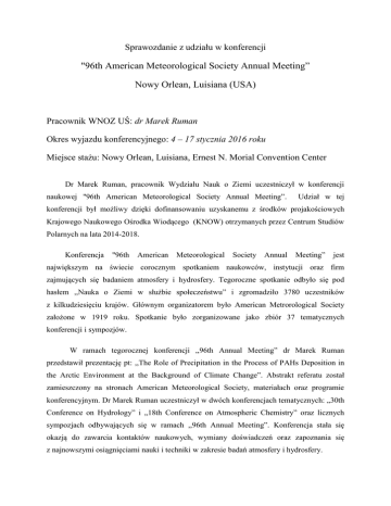 Sprawozdanie z udziału w konferencji "96th American Meteorological Society Annual Meeting” Nowy Orlean, Luisiana (USA) Pracownik WNOZ UŚ: dr Marek Ruman Okres wyjazdu konferencyjnego: 4 – 17 stycznia 2016 roku Miejsce stażu: Nowy Orlean, Luisiana, Ernest N. Morial Convention Center Dr Marek Ruman, pracownik Wydziału Nauk o Ziemi uczestniczył w konferencji naukowej "96th American Meteorological Society Annual Meeting”. Udział w tej konferencji był możliwy dzięki dofinansowaniu uzyskanemu z środków projakościowych Krajowego Naukowego Ośrodka Wiodącego (KNOW) otrzymanych przez Centrum Studiów Polarnych na lata 2014-2018. Konferencja "96th American Meteorological Society Annual Meeting” jest największym na świecie corocznym spotkaniem naukowców, instytucji oraz firm zajmujących się badaniem atmosfery i hydrosfery. Tegoroczne spotkanie odbyło się pod hasłem ,,Nauka o Ziemi w służbie społeczeństwu” i zgromadziło 3780 uczestników z kilkudziesięciu krajów. Głównym organizatorem było American Metrorological Society założone w 1919 roku. Spotkanie było zorganizowane jako zbiór 37 tematycznych konferencji i sympozjów. W ramach tegorocznej konferencji ,,96th Annual Meeting” dr Marek Ruman przedstawił prezentację pt: ,,The Role of Precipitation in the Process of PAHs Deposition in the Arctic Environment at the Background of Climate Change”. Abstrakt referatu został zamieszczony na stronach American Meteorological Society, materiałach oraz programie konferencyjnym. Dr Marek Ruman uczestniczył w dwóch konferencjach tematycznych: „30th Conference on Hydrology” i „18th Conference on Atmospheric Chemistry” oraz licznych sympozjach odbywających się w ramach ,,96th Annual Meeting”. Konferencja stała się okazją do zawarcia kontaktów naukowych, wymiany doświadczeń oraz zapoznania się z najnowszymi osiągnięciami nauki i techniki w zakresie badań atmosfery i hydrosfery. Fot. 1. "96th American Meteorological Society Annual Meeting” , Nowy Orlean, Luisiana (USA) (fot. M.Ruman)