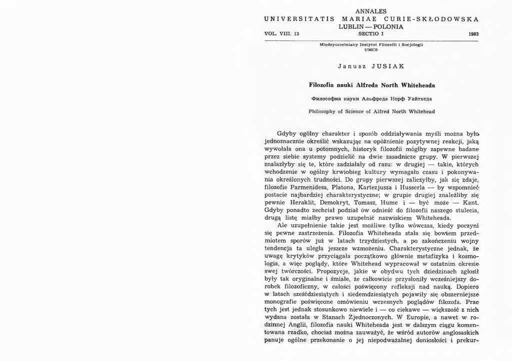 U N IV E R SITATIS VOLu V III. 13 ANNALES MARIAE CU RIE -SKŁO D O W SK A L U B L IN — P O L O N IA S E C T IO I 1983 M ię d z y u c z e ln ia n y In s t y tu t F ilo z o f ii i S o c jo lo g ii UM CS Janusz JUSIAK Filozofia nauki A lfreda N orth W hiteheada <f>Mjioco<i>MH HayKM AjibcJjpefla HopcJ> yafiTxefla Philosophy of Science of A lfre d N orth W hitehead Gdyby ogólny charakter i sposób oddziaływania myśli można było. jednoznacznie określić wskazując na opóźnienie pozytywnej reakcji, jaką wywołała ona u potomnych, historyk filozofii m ógłby zapewne badane przez siebie systemy podzielić na dwie zasadnicze grupy. W pierwszej znalazłyby się te, które zadziałały od razu: w drugiej — takie, których wchodzenie w ogólny krwiobieg kultury wymagało czasu i pokonywa nia określonych trudności. Do grupy pierwszej zaliczyłby, jak się zdaje, filozofie Parmenidesa, Platona, Kartezjusza i Husserla — by wspomnieć postacie najbardziej charakterystyczne; w grupie drugiej znaleźliby się pewnie Heraklit, Demokryt, Tomasz, Hume i — być może — Kant. Gdyby ponadto zechciał podział ów odnieść do filozofii naszego stulecia, drugą listę miałby prawo uzupełnić nazwiskiem Whiteheada. A le uzupełnienie takie jest możliwe tylko wówczas, kiedy poczyni się pewne zastrzeżenia. Filozofia Whiteheada stała się bowiem przed miotem sporów już w latach trzydziestych, a po zakończeniu w ojn y tendencja ta uległa jeszcze wzmożeniu. Charakterystyczne jednak, że uwagę krytyków przyciągała początkowo głównie m etafizyka i kosmo logia, a więc poglądy, które Whitehead wypracował w ostatnim okresie swej twórczości. Propozycje, jakie w obydwu tych dziedzinach zgłosił były tak oryginalne i śmiałe, że całkowicie przysłoniły wcześniejszy do robek filozoficzny, w całości poświęcony refleksji nad nauką. Dopiero w latach sześćdziesiątych i siedemdziesiątych pojaw iły się obszerniejsze monografie poświęcone omówieniu wczesnych poglądów filozofa. Prac tych jest jednak stosunkowo niewiele i — co ciekawe — większość z nich wydana została w Stanach Zjednoczonych. W Europie, a nawet w ro dzinnej Anglii, filozofia nauki Whiteheada jest w dalszym ciągu komen towana rzadko, chociaż można zauważyć, że wśród autorów anglosaskich panuje ogólne przekonanie o je j niepodważalnej doniosłości i prekur- Janusz Jusiak F ilozofia nauki A lfre d a N o rth W hitehea da sorskim charakterze. Przez prawie czterdzieści lat koncepcja nauki Whiteheada funkcjonowała więc w myśleniu filozoficznym podskórnie, czego nie można powiedzieć o zbudowanej w kilka lat później meta fizyce. Filozofią organizmu — jak nazywa swój system Whitehead — zajęto się natychmiast; filozofię nauki — ledwie dostrzeżono, co jednak nie znaczy, że nie ulegano je j w pływ ow i. K rytyk a hume’owsko-pozytywistycznej teorii doświadczenia, podważenie rozpowszechnionego na po czątku wieku przekonania o możliwości prostego uzgodnienia pojęć na ukowych z faktami, zakwestionowanie koncepcji kumulatywno-indukcyjnego rozwoju nauki, zapoczątkowanie badań nad historią i epistemologicznym podłożem nauki nowożytnej — to tylko niektóre z za dań, jakie Whitehead podjął. W ypracowany został nieznany wcześniej styl myślenia o nauce, nowy typ refleksji filozoficznej, który w krótkim czasie zdołał skupić wokół siebie szeroki krąg naśladowców i kontynua (sense-awarness). Chociaż głównym zadaniem wszystkich trzech roz praw jest wypracowanie alternatywnej wobec mechanicyzmu aktywistycznej koncepcji przyrody, zawierają one również szeroko rozbudowane rozważania epistemologiczne, skupiające się wokół zagadnienia natury postrzeżenia zmysłowego oraz problemu konstruowania wyjściowych po jęć nauki z bezpośrednio doświadczanego materiału wrażeniowego. Spe cjalnie przez siebie opracowany sposób konstruowania abstrakcji z kon kretu nazywa Whitehead metodą ekstensywnej abstrakcji (method of extensive abstraction). Metoda ekstensywnej abstrakcji ma być w jego przekonaniu pewną uniwersalną procedurą logiczną pozwalającą wykazać, że każdy z pierwotnych terminów fizyk i posiada określony sens empi ryczny, tzn. wykazuje związek z konkretną całością przyrody. Epistemologicznym uzasadnieniem statusu m etody jest teza, że konkretną rze czywistość stanowi całość doświadczenia, a nie jego część, która jest za wsze abstrakcją, oraz że całość ta daje się opisać przy pomocy pojęć za czerpniętych z logiki i algebry, takich jak np. całość, część, relacja, ele ment, zbiór, zbieżność itp. 182 torów. W rozwoju naukowym Whiteheada w ydzielić można trzy długie okresy. Pierw szy zaczyna się w połowie lat osiemdziesiątych ubiegłego wieku i trwa do około roku 1910. W całości jest on poświęcony pracy nad podstawami matematyki i logiki. W okresie tym Whitehead nie uprawia twórczo filozofii, ale od wczesnych lat młodości czytuje dzieła Platona, Arystotelesa, empirystów angielskich, Kartezjusza, Leibniza i Kanta. Ze szczególnym ożywieniem reaguje na bezkompromisową k ry tykę nauki dokonaną na przełomie wieku dziewiętnastego i dwudziestego przez Bergsona. K rytyka Bergsona zbiega się w czasie z poważnym wstrząsem w nauce, wywołanym załamaniem się fizyk i klasycznej N ew tona. Dzięki Bergsonowi, a częściowo również pod w pływem Jamesa, Whitehead dochodzi do przekonania, że zaistniała w fizyce rewolucja stawia przed filozofią konieczność gruntownego przeformowania do tychczasowego rozumienia znaczenia podstawowych pojęć nauki. O słu szności tego przekonania dodatkowo utwierdzają go studia nad historią nauki i filozofii nowożytnej. Drugi okres twórczości Whiteheada przypada na lata 1911— 1924. Powstają wówczas trzy prace poświęcone zagadnieniom filozoficzno-przyrodoznawczym oraz szereg artykułów będących ich komentarzami. W roku 1919 wydane z