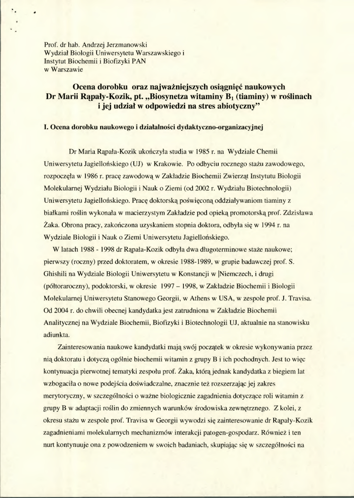 Prof. dr hab. Andrzej Jerzmanowski Wydział Biologii Uniwersytetu Warszawskiego i Instytut Biochemii i Biofizyki PAN w Warszawie Ocena dorobku oraz najważniejszych osiągnięć naukowych Dr Marii Rąpały-Kozik, pt. „Biosynetza witaminy B1 (tiaminy) w roślinach i jej udział w odpowiedzi na stres abiotyczny" I. Ocena dorobku naukowego i działalności dydaktyczno-organizacyjnej Dr Maria Rąpała-Kozik ukończyła studia w 1985 r. na Wydziale Chemii Uniwersytetu Jagiellońskiego (UJ) w Krakowie. Po odbyciu rocznego stażu zawodowego, rozpoczęła w 1986 r. pracę zawodową w Zakładzie Biochemii Zwierząt Instytutu Biologii Molekularnej Wydziału Biologii i Nauk o Ziemi (od 2002 r. Wydziału Biotechnologii) Uniwersytetu Jagiellońskiego. Pracę doktorską poświęconą oddziaływaniom tiaminy z białkami roślin wykonała w macierzystym Zakładzie pod opieką promotorską prof. Zdzisława Żaka. Obrona pracy, zakończona uzyskaniem stopnia doktora, odbyła się w 1994 r. na Wydziale Biologii i Nauk o Ziemi Uniwersytetu Jagiellońskiego. W latach 1988 - 1998 dr Rąpała-Kozik odbyła dwa długoterminowe staże naukowe; pierwszy (roczny) przed doktoratem, w okresie 1988-1989, w grupie badawczej prof. S. Ghishili na Wydziale Biologii Uniwersytetu w Konstancji w 'Niemczech, i drugi (półtoraroczny), podoktorski, w okresie 1997 — 1998, w Zakładzie Biochemii i Biologii Molekularnej Uniwersytetu Stanowego Georgii, w Athens w USA, w zespole prof. J. Travisa. Od 2004 r. do chwili obecnej kandydatka jest zatrudniona w Zakładzie Biochemii Analitycznej na Wydziale Biochemii, Biofizyki i Biotechnologii UJ, aktualnie na stanowisku adiunkta. Zainteresowania naukowe kandydatki mają swój początek w okresie wykonywania przez nią doktoratu i dotyczą ogólnie biochemii witamin z grupy B i ich pochodnych. Jest to więc kontynuacja pierwotnej tematyki zespołu prof. Żaka, którą jednak kandydatka z biegiem lat wzbogaciła o nowe podejścia doświadczalne, znacznie też rozszerzając jej zakres merytoryczny, w szczególności o ważne biologicznie zagadnienia dotyczące roli witamin z grupy B w adaptacji roślin do zmiennych warunków środowiska zewnętrznego. Z kolei, z okresu stażu w zespole prof. Travisa w Georgii wywodzi się zainteresowanie dr Rąpały-Kozik zagadnieniami molekularnych mechanizmów interakcji patogen-gospodarz. Również i ten nurt kontynuuje ona z powodzeniem w swoich badaniach, skupiając się w szczególności na 2 zagadnieniach biochemii stanów zapalnych u człowieka wywoływanych przez infekcje bakteryjne i grzybicze. Warto w tym miejscu zauważyć, że dr Rąpała-Kozik reprezentuje rzadki w doświadczalnych naukach przyrodniczych przypadek eksperymentatora prowadzącego z powodzeniem prace naukowe jednocześnie na dwóch skrajnie odmiennych modelach badawczych: roślinnym i zwierzęcym. Na główne osiągnięcia naukowe dr Rąpały-Kozik składają się łącznie 32 publikacje naukowe w czasopismach z listy filadelfijskiej. Z pośród nich 30 publikacji to prace doświadczalne, pozostałe dwie publikacje to artykuł przeglądowy i rozdział w specjalistycznej monografii. Zgodnie z kryteriami listy filadelfijskiej wszystkie periodyki, w których opublikowano wymienione prace to międzynarodowych recenzowane czasopisma anglojęzyczne. 5 z tych prac powstało przed doktoratem, pozostałe 27 - po doktoracie. Kandydatka ma publikacje w czasopismach na średnim, dobrym i bardzo dobrym poziomie międzynarodowym, w tym w: Biochimica et Biophisica Acta, Journal of Chromatography, Tetrahedron, Peptides, Plant Cell, Biological Chemistry, Journal of Protein Chemistry, Immunopharmacology, Journal of Plant Physiology, BMC Plant Biology, Journal of Biological Chemistry, Plant Physiology and Biochemistry, Biochemical Journal, Journal of Experimental Botany, Journal of Peptide Research, Biochemie. Sumaryczny Impact Factor (1F) prac, które opublikowała kandydatka wynosi 86,321. Cytowano je łącznie 276 razy, a odpowiadający im indeks Hirscha dr Rąpały-Kozik wynosi 10. Powyższe wskaźniki naukometryczne są stosunkowo wysokie jak na kandydata/kandydatkę do stopnia doktora habilitowanego w dziedzinie biologii/biochemii, i z pewnością przekraczają średnią. Oprócz wymienionych publikacji naukowych, dr Rąpała-Kozik jest współautorką 43 komunikatów na zjazdy krajowe i międzynarodowe, co świadczy o jej ogólnie bardzo wysokiej aktywności naukowej. Osiągnięcia dydaktyczne dr Rąpały-Kozik są wyższe niż przeciętne dla pracownika naukowo-dydaktycznego uczelni. Oprócz prowadzenia licznych zajęć jest bowiem współautorką 1 podręcznika i 3 skryptów akademickich. Była opiekunką 2 licencjatów i 22 magisteriów. Kandydatka wykazuje się umiejętnością nawiązywaniu współpracy naukowej, i aktywnie zdobywa środki na badania. Była głównym wykonawcą w 8 i kierownikiem w 3 projektach finansowanych przez MEN, KBN, MNiI i MNiSW, a także kierownikiem 2 grantów indywidualnych finansowanych przez UJ. Jest autorką recenzji prac doświadczalnych w międzynarodowych czasopismach i projektów grantowych finansowanych przez National Science Foundation w USA. 2 3 W sumie, na podstawie przedstawionych materiałów stwierdzam, że dorobek naukowy dr Rąpały-Kozik jest bardzo obszerny, wartościowy merytorycznie i całkowicie oryginalny. W jego skład wchodzą prace opisujące nowe fakty w dziedzinie biochemii i fizjologii roślin i zwierząt. O wartości dorobku świadczy znaczący bilans cytowań i relatywnie wysoki indeks Hirscha. Łączny dorobek kandydatki oceniam jako całkowicie wystarczający do starania się o stopień doktora habilitowanego. II. Ocena najważniejszych osiągnięć naukowych ILL Ocena zgodności z wymogami formalnymi Podstawę do oceny stanowi pięć współautorskich prac doświadczalnych i jedna praca przeglądowa w postaci rozdziału w monografii, w której kandydatka jest jedynym autorem. We wszystkich pięciu pracach doświadczalnych