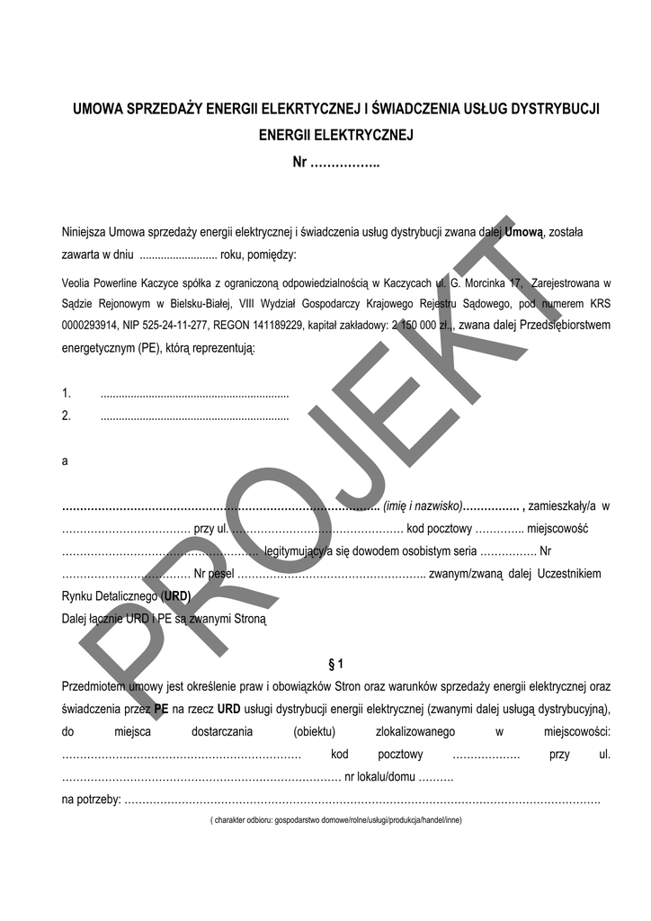 UMOWA SPRZEDAŻY ENERGII ELEKRTYCZNEJ I ŚWIADCZENIA USŁUG DYSTRYBUCJI ENERGII ELEKTRYCZNEJ Nr …………….. Niniejsza Umowa sprzedaży energii elektrycznej i świadczenia usług dystrybucji zwana dalej Umową, została zawarta w dniu .......................... roku, pomiędzy: Veolia Powerline Kaczyce spółka z ograniczoną odpowiedzialnością w Kaczycach ul. G. Morcinka 17, Zarejestrowana w Sądzie Rejonowym w Bielsku-Białej, VIII Wydział Gospodarczy Krajowego Rejestru Sądowego, pod numerem KRS 0000293914, NIP 525-24-11-277, REGON 141189229, kapitał zakładowy: 2 150 000 zł.,, zwana dalej Przedsiębiorstwem energetycznym (PE), którą reprezentują: 1. ............................................................... 2. ............................................................... a …………………………………………………………………………….. (imię i nazwisko)……………. , zamieszkały/a w ……………………………… przy ul. ………………………………………… kod pocztowy ………….. miejscowość ………………………………………………. legitymujący/a się dowodem osobistym seria ……………. Nr ……………………………… Nr pesel …………………………………………….. zwanym/zwaną dalej Uczestnikiem Rynku Detalicznego (URD) Dalej łącznie URD i PE są zwanymi Stroną §1 Przedmiotem umowy jest określenie praw i obowiązków Stron oraz warunków sprzedaży energii elektrycznej oraz świadczenia przez PE na rzecz URD usługi dystrybucji energii elektrycznej (zwanymi dalej usługą dystrybucyjną), do miejsca dostarczania (obiektu) ……………….………………………………………… kod zlokalizowanego pocztowy w ………………. miejscowości: przy ul. …………………………………………………………………… nr lokalu/domu ………. na potrzeby: ……………………………………………………………………………………………………………………. ( charakter odbioru: gospodarstwo domowe/rolne/usługi/produkcja/handel/inne) §2 PE nadaje URD następujący kod identyfikacyjny: …………………………… §3 URD oświadcza, że na dzień podpisania Umowy posiada aktualny tytuł prawny do obiektu o którym mowa w §1 Umowy w postaci ……………………………………………………………………………………………….. (odpis KW, akt własności, umowa najmu, dzierżawy itp.) §4 URD oświadcza, ze otrzymał oraz zapoznał się z treścią ,,Ogólne warunki umowy o świadczenie usług dystrybucji energii elektrycznej Veolia Powerline Kaczyce spółka z ograniczoną odpowiedzialnością. §5 Usługa dystrybucyjna jest realizowana na podstawie warunków przyłączenia nr………………….. oraz umowy przyłączeniowej nr……………………. z dnia ……………… roku. 1. Moc przyłączeniowa ………………kW, 2. Grupa przyłączeniowa ………. ….. 3. Zabezpieczenie przedlicznikowe …………………….. 4. Moc umowna …………kW 5. Grupa Taryfowa: … Usługa dystrybucji jest realizowana przy zachowanym przez URD współczynniku Tgφ niewiększym niż 0,4, w układzie ………….. fazowym na niskim napięciu (nN). Dostarczanie energii elektrycznej odbywa się poprzez przyłącze ………………….., ze stacji nr ……………… z obwodu …………………… i nr złącza/słupa……………. §6 Ustala się następujące granice stron: ……………………………………………………………………………………………………………………… §7 Dane układu pomiarowo-rozliczeniowego: 1. Rodzaj układu pomiarowo-rozliczeniowego ………………….……………. (bezpośredni/pośredni/przedpłatowy) 2. Mnożna układu pomiarowo-rozliczeniowego ………………. ____________________________________________________________________________ Strona 2 z 4 3. Miejsce zabudowania układu pomiarowo-rozliczeniowego ………………………………………..…………… …………………………………………………………………………………………………………………………… 4. Własność układu pomiarowo-rozliczeniowego – PE §8 1. Rozliczenia za sprzedaną energię elektryczną będą odbywać się według zasad, cen i stawek opłat w Taryfie dla energii elektrycznej. 2. Rozliczenia za świadczone usługi dystrybucyjne będą odbywać się według zasad, cen i stawek opłat w Taryfie dla usług dystrybucji energii elektrycznej. 3. Okres rozliczeniowy wynosi ……………….. 4. Płatności będą regulowane w terminie 14 dni od daty wystawienia faktury na konto PE: …………………………………………………………………………………………………………………………… §9 1. Umowa wchodzi w życie z dniem ………… r. i obowiązuje do ……………… (lub na czas nieokreślony). 2. Dzień wejścia w życie Umowy jest dniem rozpoczynającym świadczenie usługi dystrybucji przez PE. § 10 Integralną część Umowy stanowią następujące załączniki: a) załącznik ,,Ogólne warunki umowy o świadczenie usług dystrybucji energii elektrycznej Veolia Powerline Kaczyce spółka z ograniczoną odpowiedzialnością”, b) kserokopia dokumentu stwierdzającego tytuł prawny do obiektu Umowa niniejsza została sporządzona w dwóch jednobrzmiących egzemplarzach, po jednym dla każdej ze Stron. PE ………………………………….. URD ………………………………….. ____________________________________________________________________________ Strona 3 z 4 Na podstawie art. 24 ust. 1 ustawy z dnia 29 sierpnia 1997 r. o ochronie danych osobowych (tekst jednolity Dz. U. z 2002 roku, Nr 101, poz. 926, z późn. zm.) informuję Pana/Panią, że administratorem danych przetwarzającym Pana/Pani dane osobow