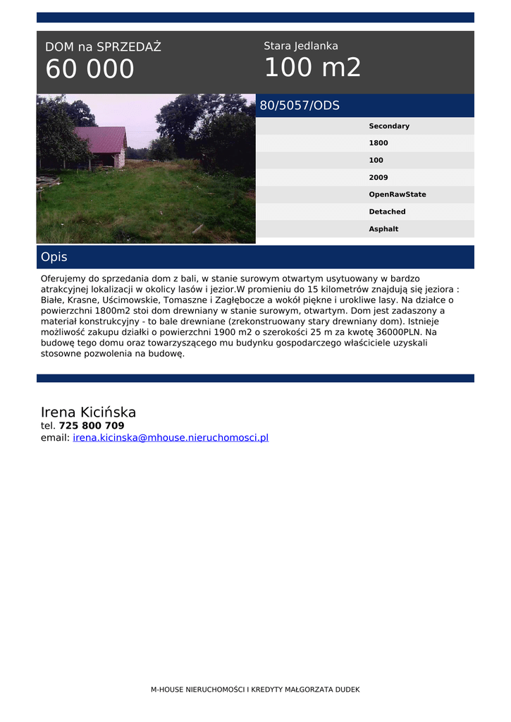 DOM na SPRZEDAŻ 60 000 Stara Jedlanka 100 m2 80/5057/ODS Secondary 1800 100 2009 OpenRawState Detached Asphalt Opis Oferujemy do sprzedania dom z bali, w stanie surowym otwartym usytuowany w bardzo atrakcyjnej lokalizacji w okolicy lasów i jezior.W promieniu do 15 kilometrów znajdują się jeziora : Białe, Krasne, Uścimowskie, Tomaszne i Zagłębocze a wokół piękne i urokliwe lasy. Na działce o powierzchni 1800m2 stoi dom drewniany w stanie surowym, otwartym. Dom jest zadaszony a materiał konstrukcyjny - to bale drewniane (zrekonstruowany stary drewniany dom). Istnieje możliwość zakupu działki o powierzchni 1900 m2 o szerokości 25 m za kwotę 36000PLN. Na budowę tego domu oraz towarzyszącego mu budynku gospodarczego właściciele uzyskali stosowne pozwolenia na budowę. Irena Kicińska tel. 725 800 709 email: [email protected] M-HOUSE NIERUCHOMOŚCI I KREDYTY MAŁGORZATA DUDEK Powered by TCPDF (www.tcpdf.org)