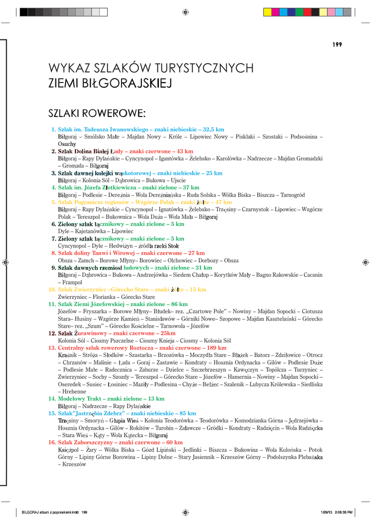 199 WYKAZ SZLAKÓW TURYSTYCZNYCH ZIEMI BI GORAJSKIEJ SZLAKI ROWEROWE: 1. Szlak im. Tadeusza Iwanowskiego znaki niebieskie 32,5 km Bi goraj Smólsko Ma e Majdan Nowy Króle Lipowiec Nowy Pisklaki Szostaki Podso nina Osuchy 2. Szlak Dolina Bia ej ady znaki czerwone 43 km Bi goraj Rapy Dyla skie Cyncynopol Igantówka elebsko Karolówka Nadrzecze Majdan Gromadzki Gromada Bi goraj 3. Szlak dawnej kolejki w skotorowej znaki niebieskie 25 km Bi goraj Kolonia Sól D browica Bukowa Ujscie 4. Szlak im. Józefa Z otkiewicza znaki zielone 37 km Bi goraj Podlesie Dere nia Wola Dere nia ska Ruda Solska Wólka Biska Biszcza Tarnogród 5. Szlak Pogranicze regionów Wzgórze Polak znaki ó te 47 km Bi goraj Rapy Dyla skie Cyncynopol Ignatówka elebsko Trz siny Czarnystok Lipowiec Wzgórze Polak Tereszpol Bukownica Wola Du a Wola Ma a Bi goraj 6. Zielony szlak cznikowy znaki zielone 5 km Dyle Kajetanówka Lipowiec 7. Zielony szlak cznikowy znaki zielone 5 km Cyncynopol Dyle Hedwi yn ród a rzeki Stok 8. Szlak doliny Tanwi i Wirowej znaki czerwone 27 km Obsza Zamch Borowe M yny Borowiec Olchowiec Dorbozy Obsza 9. Szlak dawnych rzemios ludowych znaki zielone 31 km Bi goraj D browica Bukowa Andrzejówka Siedem Cha up Korytków Ma y Bagno Rakowskie Cacanin Frampol 10. Szlak Zwierzyniec Górecko Stare znaki ó te 15 km Zwierzyniec Florianka Górecko Stare 11. Szlak Ziemi Józefowskiej znaki zielone 86 km Józefów Fryszarka Borowe M yny B udek rez. Czartowe Pole Nowiny Majdan Sopocki Ciotusza Stara Husiny Wzgórze Kamie Stanis awów Górniki Nowe Szopowe Majdan Kasztela ski Górecko Stare rez. Szum Górecko Ko cielne Tarnowola Józefów 12. Szlak urawinowy znaki czerwone 25km Kolonia Sól Ciosmy Pszczelne Ciosmy Knieja Ciosmy Kolonia Sól 13. Centralny szlak rowerowy Roztocza znaki czerwone 189 km Kra nik Stró a S odków Szastarka Brzozówka Moczyd a Stare B a ek Batorz Zdzi owice Otrocz Chrzanów Malinie ada Goraj Zastawie Kondraty Hosznia Ordynacka Gilów Podlesie Du e Podlesie Ma e Radecznica Zaburze Dzielce Szczebrzeszyn Kaw czyn Topólcza Turzyniec Zwierzyniec Sochy Szozdy Tereszpol Górecko Stare Józefów Hamernia Nowiny Majdan Sopocki Oseredek Susiec osiniec Mazi y Podlesina Chy e Be ec Szalenik Lubycza Królewska Siedliska Hrebenne 14. Modelowy Trakt znaki zielone 13 km Bi goraj Nadrzecze Rapy Dyla skie 15. SzlakJastrz bia Zdebrz znaki niebieskie 85 km Trz siny Smory G upia Wie Kolonia Teodorówka Teodorówka Komodzianka Górna J drzejówka Hosznia Ordynacka Gilów Rokitów Turobin Za awcze Gródki Kondraty Radzi cin Wola Radzi cka Stara Wie K ty Wola K tecka Bi goraj 16. Szlak Zaborszczyzny znaki czerwone 60 km Ksi pol ary Wólka Biska Gózd Lipi ski Jedlinki Biszcza Bukowina Wola Kulo ska Potok Górny Lipiny Górne Borowina Lipiny Dolne Stary Jasiennik Krzeszów Górny Podolszynka Pleba ska Krzeszów BILGORAJ album z poprawkami.indd 199 1/29/13 2:08:38 PM 200 17. Bobrowy Trakt znaki czerwone 29 km Korytków Du y Siedem Cha up Cybulne Góry kamienna droga Go ciniec Janowski Andrzejówka Bukowa Go ciniec Solski Korytków Du y 18. Szlak im. Dymitra Gorajskiego znaki zielone 40 km Goraj Hosznia Abramowska Ch opków Zaburze Kaw czynek Lipowiec SZLAKI PIESZE: 1. Szlak walk partyzanckich znaki czarne 100 km /75 km w granicy powiatu/ Bidaczów Stary Budziarze Zanie Majdan Stary Majdan Nowy Lipowiec Stary Aleksandrów Górecko Ko cielne Sig a Kozaki Osuchowskie Osuchy Fryszarka Borowe M yny rez. Nad Tanwi Susiec Wólka osiniecka osiniec Siwa Dolina Tomaszów Lubelski 2. Szlak Roztocza ski Znaki ó te 54 km /46 km w granicy powiatu/ Bidaczów Stary Bidaczów Nowy Ruda Zagrody Wola Dere nia ska Dere nia Zagrody Kolonia Sól Bi goraj Wola Ma a Wola Du a Hedwi yn Kajetanówka elebsko Trz siny Lipowiec Wzgórze Polak Zwierzyniec 3. Szlak Puszczy Solskiej znaki niebieskie 27 km Bi goraj Ro nówka Edwardów Górecko Ko cielne 4. Szlak Ziemi Józefowskiej znaki zielone 42 km Józefów Fryszarka Osuchy Uroczysko Maziarze rez. Czartowe Pole Nowiny Siedliska D ugi K t 5. Szlak im. Aleksandry Wachniewskiej znaki zielone 67 km /18 km w granicy powiatu/ Zwierzyniec Rudka Skaraszów Szewnia Dolna Wojda Bli ów Bondyrz Lasowce Potok Senderki Stara Huta Majdan Kasztela ski Brzeziny Górecko Ko cielne Tereszpol Jurydyga Florianka 6. Szlak kraw dziowy znaki czerwone 52 km /28 km w granicy powiatu/ Zwierzyniec Sochy Florianka Górecko Stare /75 km w granicy powiatu/ Górecko Ko cielne Tarnowola Józefów Pardysówka Hamernia rez. Czartowe Pole Nowiny B udek Oseredek Susiec 7. Szlak centralny znaki niebieskie 137 km /30 km w granicy powiatu/ Szastarka Brzozówka Moczyd a Stare B a ek Batorz Otrocz Huta Turobi ska Gródki Fort IV Radecznica S siadka Kaw czynek Lipowiec Zwierzyniec Obrocz Lasowce Potok Senderki Wzgórze Kamie Husiny Ró a Ulów Pasieki Rabinówka Chy e Be ec 8. Szlak walk partyzanckich znaki czerwone 63 km /10 km w granicy powiatu/ Lipa widry Gwizdów ek Ordynacki Szklarnia Porytowe Wzgórze Uj cie Szeliga Ciosmy Bidaczów Stary 9. Szlak cznikowy znaki czarne 10 km Józefów Majdan Nepryski Szopowe Górniki Stare Potok Senderki 10. Szlak cznikowy znaki czarne 3 km Edwardów Brodziaki Wielkie Bagno 11. Szlak cznikowy znaki czarne 12 km Lipowiec Wyw oczka Bagno Zwierzyniec PROPOZYCJE TRAS SAMOCHODOWYCH: 1. Szlakiem przenikania kultur i religii 186 km Bi goraj Korczów Majdan Ksi polski Ksi pol Biszcza Gózd Lipi ski Harasiuki Derylaki Huta Krzeszowska Gózd Kurzyna D browica Ulanów Bieliny Krzeszów Stary Jasiennik Lipiny Dolne Potok Górny Zagródki Luchów Górny Tarnogród Ró aniec Obsza Zamch Babice ukowa Chmielek Rakówka Bi goraj 2. Szlakiem krain geogra cznych: Równiny Bi gorajskiej, Roztocza Zachodniego i Wy yny Lubelskiej 104 km Bi goraj Frampol Goraj Tarnawa Turobin Czerni cin Gilów Hosznia Ordynacka Wólka Abramowska Abramów Radzi cin Wola Radzi cka Wola K tecka Dyle Hedwi yn Bi goraj BILGORAJ album z poprawkami.indd 200 1/29/13 2:08:39 PM