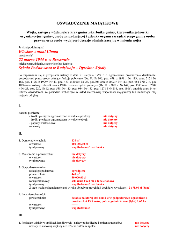 OŚWIADCZENIE MAJĄTKOWE Wójta, zastępcy wójta, sekretarza gminy, skarbnika gminy, kierownika jednostki organizacyjnej gminy, osoby zarządzającej i członka organu zarządzającego gminą osobą prawną oraz osoby wydającej decyzje administracyjne w imieniu wójta Ja niżej podpisany/a/: Wiesław Antoni Ulman urodzony/a/: 22 marca 1954 r. w Rzeszowie miejsce zatrudnienia, stanowisko lub funkcja: Szkoła Podstawowa w Budziwoju – Dyrektor Szkoły Po zapoznaniu się z przepisami ustawy z dnia 21 sierpnia 1997 r. o ograniczeniu prowadzenia działalności gospodarczej przez osoby pełniące funkcje publiczne (Dz. U. Nr 106, poz. 679, z 1998 r. Nr 113, poza. 715 i Nr 162, poz. 1126, z 1999r. Nr 49, poz. 483, z 2000r. Nr 26, poz.306 oraz z 2002 r. Nr 113, poz. 984 i Nr 214, poz 1806) oraz ustawy z dnia 8 marca 1990 r. o samorządzie gminnym (Dz. U. z 2001 r. Nr 142, poz. 1591 oraz z 2002 r. Nr 23, poz. 220, Nr 62, poz. 558, Nr 113, poz. 984, Nr 153, poz. 1271 i Nr 214, poz. 1806), zgodnie z art 24 tej ustawy oświadczam, że posiadam wchodzące w skład małżeńskiej wspólności majątkowej lub stanowiące mój majątek odrębny: I. Zasoby pieniężne: - środki pieniężne zgromadzone w walucie polskiej: - środki pieniężne zgromadzone w walucie obcej: - papiery wartościowe: na kwotę nie dotyczy nie dotyczy nie dotyczy nie dotyczy II. 1. Dom o powierzchni: o wartości tytuł prawny: 120 m2 200 000,00 zł współwłasność małżeńska 2. Mieszkanie o powierzchni: o wartości: tytuł prawny: nie dotyczy nie dotyczy nie dotyczy 3. Gospodarstwo rolne: rodzaj gospodarstwa: ogrodnicze powierzchnia: 440 m2 o wartości: 50 000,00 zł rodzaj zabudowy: szklarnia 6x22 m; 2 tunele foliowe tytuł prawny: współwłasność małżeńska Z tego tytułu osiągnąłem (ęłam) w roku ubiegłym przychód i dochód w wysokości: 2 175,00 zł (żona) 4. Inne nieruchomości: powierzchnia: o wartości: tytuł prawny: działka na której stoi dom i w/w godpodarstwo ogrodnicze o powierzchni 15,5 arów; pole w gminie krasne (łąka) 1,62 ha -----współwłasność III. 1. Posiadam udziały w spółkach handlowych - należy podąć liczbę i emitenta udziałów: udziały te stanowią większy niż 10% udziałów w spółce: nie dotyczy nie dotyczy z tego tytułu osiągnąłem (ęłam) w roku ubiegłym dochód w wysokości: 2. Posiadam udziały w innych spółkach handlowych - należy podąć liczbę i emitenta udziałów: z tego tytułu osiągnąłem (ęłam) w roku ubiegłym dochód w wysokości: nie dotyczy nie dotyczy nie dotyczy IV. 1. Posiadam akcje w spółkach handlowych - należy podać liczbę i emitenta akcji: akcje te stanowią pakiet większy niż 10% akcji w spółce: Z tego tytułu osiągnąłem (ęłam) w roku ubiegłym dochód w wysokości: 2. Posiadam udziały w innych spółkach handlowych - należy podąć liczbę i emitenta udziałów: Z tego tytułu osiągnąłem (ęłam) w roku ubiegłym dochód w wysokości: nie dotyczy nie dotyczy nie dotyczy nie dotyczy nie dotyczy V. Nabyłem(am) (nabył mój małżonek, z wyłączeniem mienia przynależnego do jego majątku odrębnego) od Skarbu Państwa, innej państwowej osoby prawnej, jednostek samorządu terytorialnego, ich związków lub od komunalnej osoby prawnej następujące mienie, które podlegało zbyciu w drodze przetargu - należy podać opis mienia i datę nabycia, od kogo: nie dotyczy VI. 1. Prowadzę działalność gospodarczą (należy podać formę prawną i przedmiot działalności): - osobiście: - wspólnie z innymi osobami: Z tego tytułu osiągnąłem (ęłam) w roku ubiegłym przychód i dochód w wysokości: nie dotyczy nie dotyczy nie dotyczy nie dotyczy 2. Zarządzam działalnością gospodarczą lub jestem przedstawicielem, pełnomocnikiem takiej działalności (należy - podać formę prawną i przedmiot działalności): nie dotyczy - osobiście: nie dotyczy - wspólnie z innymi osobami: nie dotyczy Z tego tytułu osiągnąłem (ęłam) w roku ubiegłym dochód w wysokości: nie dotyczy VII. 1. W spółkach handlowych (nazwa, siedziba spółki): - jestem członkiem zarządu (od kiedy): - jestem członkiem rady nadzorczej (od kiedy): - jestem członkiem komisji rewizyjnej (od kiedy): Z tego tytułu osiągnąłem (ęłam) w roku ubiegłym dochód w wysokości: 2. W spółdzielniach: - jestem członkiem zarządu (od kiedy): - jestem członkiem rady nadzorczej (od kiedy): - jestem członkiem komisji rewizyjnej (od kiedy): Z tego tytułu osiągnąłem (ęłam) w roku ubiegłym dochód w wysokości: 3. W fundacjach prowadzących działalność gospodarczą - jestem członkiem zarządu (od kiedy): - jestem członkiem rady nadzorczej (od kiedy): - jestem członkiem komisji rewizyjnej (od kiedy): Z tego tytułu osiągnąłem (ęłam) w roku ubiegłym dochód w wysokości: nie dotyczy nie dotyczy nie dotyczy nie dotyczy nie dotyczy nie dotyczy nie dotyczy nie dotyczy nie dotyczy nie dotyczy nie dotyczy nie dotyczy nie dotyczy nie dotyczy nie dotyczy VIII. Inne dochody osiągane z tytułu zatrudnienia lub innej działalności zarobkowej lub zajęć, z podaniem kwot uzyskiwanych z każdego tytułu: Wynagrodzenie za pracę: 49 905,83 zł Z tytułu prowadzonej działalności: 2 175,00 zł IX. Składniki mienia ruchomego o wartości powyżej 10 000 złotych ( w przypadku pojazdów mechanicznych należy podać markę, model i rok produkcji): Mercedes Vito 1997 r. X. Zobowiązania pieniężne o wartości powyżej 10 000 złotych, w tym zaciągnięte kredyty i pożyczki oraz warunki, na jakich zostały udzielone (wobec kogo, w związku z jakim zdarzeniem, w jakiej wysokości) PKO BP – kredyt 22 000 zł na zakup sadzonek do gosp. Ogrodniczego żony Powyższe oświadczenie składam świadomy(a), iż na podstawie art. 233 §1 Kodeksu Karnego za podanie nieprawdy lub zatajenie prawdy grozi kara pozbawienia wolności.