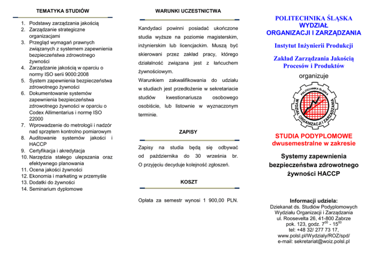 TEMATYKA STUDIÓW 1. Podstawy zarządzania jakością 2. Zarządzanie strategiczne organizacjami 3. Przegląd wymagań prawnych związanych z systemem zapewnienia bezpieczeństwa zdrowotnego żywności 4. Zarządzanie jakością w oparciu o normy ISO serii 9000:2008 5. System zapewnienia bezpieczeństwa zdrowotnego żywności 6. Dokumentowanie systemów zapewnienia bezpieczeństwa zdrowotnego żywności w oparciu o Codex Allimentarius i normę ISO 22000 7. Wprowadzenie do metrologii i nadzór nad sprzętem kontrolno pomiarowym 8. Auditowanie systemów jakości i HACCP 9. Certyfikacja i akredytacja 10. Narzędzia stałego ulepszania oraz efektywnego planowania 11. Ocena jakości żywności 12. Ekonomia i marketing w przemyśle 13. Dodatki do żywności 14. Seminarium dyplomowe WARUNKI UCZESTNICTWA Kandydaci powinni posiadać ukończone studia wyższe na poziomie magisterskim, inżynierskim lub licencjackim. Muszą być skierowani przez zakład pracy, którego działalność związana jest z łańcuchem żywnościowym. Warunkiem zakwalifikowania do udziału POLITECHNIKA ŚLĄSKA WYDZIAŁ ORGANIZACJI I ZARZĄDZANIA Instytut Inżynierii Produkcji Zakład Zarządzania Jakością Procesów i Produktów organizuje w studiach jest przedłożenie w sekretariacie studiów kwestionariusza osobowego osobiście, lub listownie w wyznaczonym terminie. ZAPISY Zapisy od na studia października będą do 30 się odbywać września br. O przyjęciu decyduje kolejność zgłoszeń. STUDIA PODYPLOMOWE dwusemestralne w zakresie Systemy zapewnienia bezpieczeństwa zdrowotnego żywności HACCP KOSZT Opłata za semestr wynosi 1 900,00 PLN. Informacji udziela: Dziekanat ds. Studiów Podyplomowych Wydziału Organizacji i Zarządzania ul. Roosevelta 26, 41-800 Zabrze pok. 123, godz. 700 - 1500 tel: +48 32/ 277 73 17, www.polsl.pl/Wydzialy/ROZ/spd/ e-mail: [email protected] CELE I ZADANIA STUDIÓW PODYPLOMOWYCH Studia mają na celu przekazanie praktycznej wiedzy w zakresie zarządzania bezpieczeństwem zdrowotnym żywności w przedsiębiorstwach wytwórczych, usługowych i handlowych oraz zakładach przetwarzających żywność. Uczestnicy po ukończeniu studiów nabędą niezbędną wiedzę teoretyczną i praktyczną pozwalającą na budowę i doskonalenie indywidualnych systemów zapewnienia bezpieczeństwa żywności zgodnego z wymaganiami ustawy z dnia 11 maja 2001r o warunkach zdrowotnych żywności i żywienia opartych o wymagania zawarte w normie ISO 22000:2006 oraz Codex Alimentarius. Uczestnicy posiądą również wiedzę na temat wymagań zawartych w International Food Standard (IFS) i British Retail Consortium (BRC) Szczególnego znaczenia nabierają systemy zapewnienia bezpieczeństwa zdrowotnego żywności w odniesieniu do małych i średnich firm, których działalność musi być dostosowana do wymogów sanitarnych obowiązujących w UE. Obserwuje się duże zainteresowanie w tym zakresie, zważywszy, że jedynie kilka z polskich uczelni prowadzi studia obejmujące zagadnienia zarządzania bezpieczeństwem żywności. Studia mają przygotować uczestników do budowy, wdrażania, oceny i utrzymywania systemów zapewnienia bezpieczeństwa zdrowotnego w odniesieniu do żywności (HACCP) wg. międzynarodowych standardów. UCZESTNICY STUDIÓW Studia podyplomowe kierowane są dla kadry kierowniczej oraz wszystkich osób, odpowiedzialnych w przedsiębiorstwach za procesy związane z bezpiecznym wytwarzaniem i dystrybucją żywności. DODATKOWE KWALIFIKACJE Absolwenci poza Świadectwem Ukończenia Studiów Podyplomowych mogą uzyskać certyfikat Auditora wewnętrznego systemu zapewnienia bezpieczeństwa zdrowotnego żywności lub zintegrowanego systemu zarządzania jakością i bezpieczeństwa zdrowotnego żywności HACCP wydane przez SGS Polska Sp. z o.o. Warunkiem jest zdanie egzaminu, wniesienie opłaty za egzamin i spełnienie wymagań jednostki certyfikującej. ORGANIZACJA STUDIÓW Studia trwają 2 semestry i obejmują 220 godzin dydaktycznych. Zajęcia odbywają się dwa razy w miesiącu, w piątki (od 16.00 do 20.00) i soboty (od 9 do 17.00) oraz wybrane niedziele (od 9 do 17.00) na Wydziale Organizacji i Zarządzania w Zabrzu. RADA PROGRAMOWA Dr hab. Paweł Szewczyk prof. zw. w Pol. Śląskiej, Dr inż. Jerzy Ścierski Politechnika Śląska, i Zarządzania Wydz. Organizacji Dr inż. Mariusz Ligarski Politechnika Śląska, Wydz. i Zarządzania Organizacji KIEROWNIK STUDIÓW Dr inż. Jerzy Ścierski Politechnika Śląska, Wydz. Organizacji i Zarządzania.