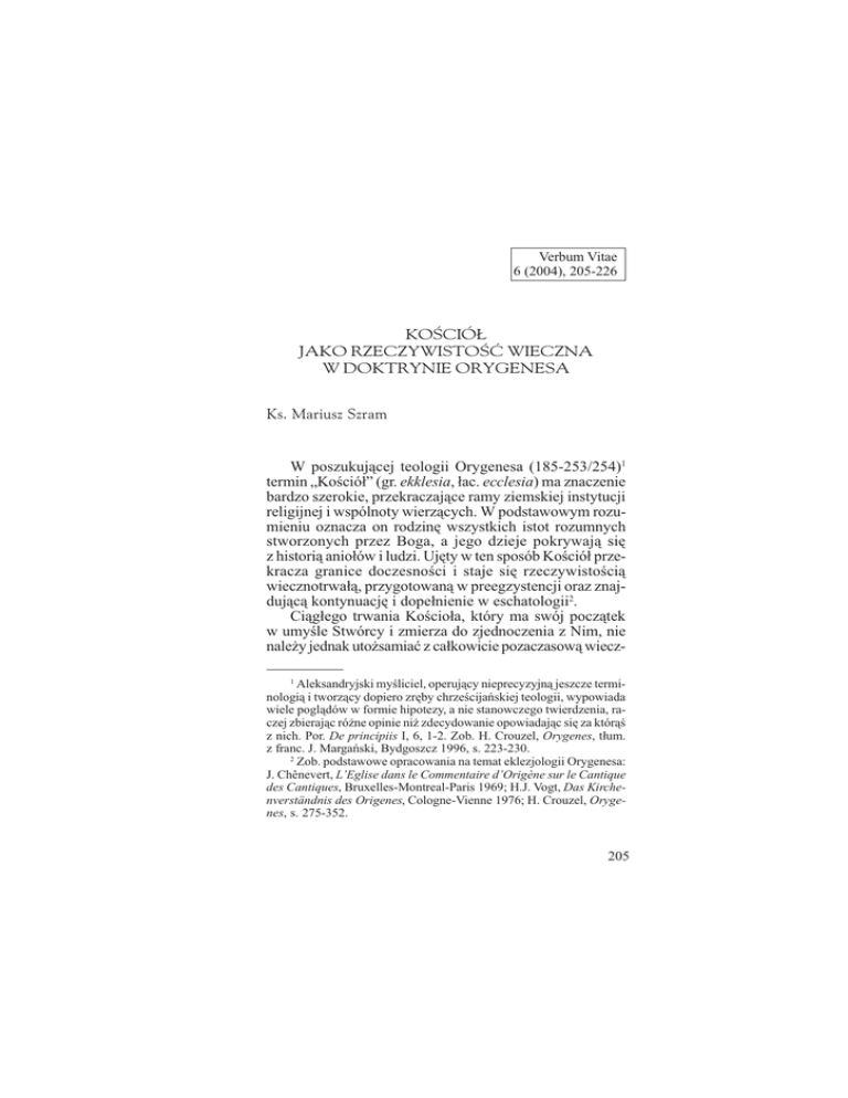 Verbum Vitae 6 (2004), 205-226 KOCIÓ£ JAKO RZECZYWISTOÆ WIECZNA W DOKTRYNIE ORYGENESA Ks. Mariusz Szram W poszukuj¹cej teologii Orygenesa (185-253/254)1 termin Koció³ (gr. ekklesia, ³ac. ecclesia) ma znaczenie bardzo szerokie, przekraczaj¹ce ramy ziemskiej instytucji religijnej i wspólnoty wierz¹cych. W podstawowym rozumieniu oznacza on rodzinê wszystkich istot rozumnych stworzonych przez Boga, a jego dzieje pokrywaj¹ siê z histori¹ anio³ów i ludzi. Ujêty w ten sposób Koció³ przekracza granice doczesnoci i staje siê rzeczywistoci¹ wiecznotrwa³¹, przygotowan¹ w preegzystencji oraz znajduj¹c¹ kontynuacjê i dope³nienie w eschatologii2. Ci¹g³ego trwania Kocio³a, który ma swój pocz¹tek w umyle Stwórcy i zmierza do zjednoczenia z Nim, nie nale¿y jednak uto¿samiaæ z ca³kowicie pozaczasow¹ wiecz1 Aleksandryjski myliciel, operuj¹cy nieprecyzyjn¹ jeszcze terminologi¹ i tworz¹cy dopiero zrêby chrzecijañskiej teologii, wypowiada wiele pogl¹dów w formie hipotezy, a nie stanowczego twierdzenia, raczej zbieraj¹c ró¿ne opinie ni¿ zdecydowanie opowiadaj¹c siê za któr¹ z nich. Por. De principiis I, 6, 1-2. Zob. H. Crouzel, Orygenes, t³um. z franc. J. Margañski, Bydgoszcz 1996, s. 223-230. 2 Zob. podstawowe opracowania na temat eklezjologii Orygenesa: J. Chênevert, L’Eglise dans le Commentaire d’Origène sur le Cantique des Cantiques, Bruxelles-Montreal-Paris 1969; H.J. Vogt, Das Kirchenverständnis des Origenes, Cologne-Vienne 1976; H. Crouzel, Orygenes, s. 275-352. 205 noci¹ (sempiternum, aeternum), przys³uguj¹c¹ samemu Bogu, któr¹ charakteryzuje brak pocz¹tku i niemo¿liwoæ przerwania istnienia3. Aleksandryjczyk uwa¿a nawet, ¿e równie¿ pojêcie wiecznoci mo¿e zak³adaæ pewn¹ czasowoæ, w zwi¹zku z czym to, co mówimy o Ojcu, Synu i Duchu wiêtym, nale¿y rozumieæ w sensie przekraczaj¹cym wszelki czas, wszystkie wieki i ca³¹ wiecznoæ4. Greckie s³owo aión (jego ³aciñski odpowiednik to aeternitas), wystêpuj¹ce w Pimie wiêtym5 oraz komentowane w zachowanych tekstach Aleksandryjczyka6, jest bowiem wieloznaczne i mo¿e oznaczaæ nie tylko absolutn¹ wiecznoæ, lecz tak¿e bardzo d³ugi, ale w jaki sposób ograniczony, czas trwania. O ró¿nych desygnatach tego terminu Orygenes pisze w nastêpuj¹cy sposób, nawi¹zuj¹c do stoickiej teorii nastêpuj¹cych po sobie wiatów: Pismo czasem mówi o wiecznoci, gdy nieznany jest koniec, czasem natomiast mówi o niej wtedy, gdy koñca nie ma w obecnym wieku, ale nastêpuje on w wieku przysz³ym. Czasem wiecznoci¹ nazywany bywa okres jakiego czasu albo nawet d³ugoæ ¿ycia jednego cz³owieka [... albo] wiecznoæ oznacza czas obecnego wieku7. Odnosz¹c te rozwa¿ania Aleksandryjczyka do pojêcia Kocio³a, mo¿na stwierdziæ, ¿e w jego rozumieniu jest on wieczny nie w sposób absolutny, w³aciwy jedynie Bogu, ale w sensie d³ugiego trwania, które mia³o pocz¹tek, ale nie ma koñca. Ta przekraczaj¹ca czas i przestrzeñ doczesnego wiata Origenes, De principiis I, 2, 11. Tam¿e, IV, 4, 1. 5 Por. Mt 12,32; Mk 10,30; £k 1,70; J 4,14; Hbr 1,2; Ap 1,6. Pe³ny wykaz miejsc wystêpowania terminów aión i aiónios w Nowym Testamencie podaje R. Popowski, Wielki s³ownik grecko-polski Nowego Testamentu, Warszawa 1995, s. 16. 6 Por. Origenes, De principiis I, 2, 11; ten¿e, Commentarium in Epistulam ad Romanos VI, 5; ten¿e, Commentarium in Evangelium Ioannis XXVIII, VIII, 63; ten¿e, Commentarium in Evangelium Matthaei XVII, 24. 7 Ten¿e, Commentarium in Epistulam ad Romanos VI, 5. 3 4 206 egzystencja Kocio³a dzieli siê, wed³ug Orygenesa, na kilka etapów, które zostan¹ kolejno omówione. 1. IDEA KOCIO£A W UMYLE BOGA Zgodnie z zasad¹ platoñskiego egzemplaryzmu, przejêt¹ przez Orygenesa za porednictwem Filona Aleksandryjskiego8, w rozumnej m¹droci (lógos = sofia) Boga, Stwórcy wszystkiego, istnieje odwiecznie przez Niego pomylany, inteligibilny zbiór pocz¹tków, zasad i form ca³ego stworzenia (universae creaturae vel initia vel rationes vel species), po³¹czony z moc¹ kszta³towania przysz³ego stworzenia (virtus ac deformatio futurae creaturae)9. Uwarunkowana danymi biblijnymi modyfikacja Aleksandryjczyka w stosunku do koncepcji Platona polega na osobowym charakterze Boskiego Rozumu, to¿samego z Jego Synem oraz na immanentnym tkwieniu owego zbioru wzorczych wobec stworzenia idei w Bogu jako Tym, który je zawsze myli, podczas gdy zgodnie z nauk¹ platoñskich dialogów idee istnia³y poza czy nawet ponad demiurgiem twórc¹ wiata. W De principiis czytamy: Jeli wszystko zosta³o uczynione w m¹droci [Bo¿ej = Synu Bo¿ym], a m¹droæ [= Syn Bo¿y] istnia³a zawsze, to stosownie do uprzedniego uformowania i ukszta³towania (secundum praefigurationem et praeformationem), zawsze (semper) by³o w m¹droci to, co nastêpnie zosta³o stworzone substancjalnie (quae protinus ... substantialiter facta sunt)10. Zbiór idei, zawartych w Synu, czyli w M¹droci-Rozumie-S³owie, tworzy, zdaniem Orygenesa, duchowy wiat (kósmos noetós), bêd¹cy 8 Por. H.A. Wolfson, Philo. Foundations of Religious Philosophy in Judaism, Christianity and Islam, Cambridge-Massachusetts 1948, I, s. 258; H. Crouzel, Idées platoniciennes et raisons stoïciennes dans la théologie dOrigène, Studia Patristica 18/3(1989)365-383. 9 Origenes, De principiis I, 2, 2. 10 Tam¿e, I, 4, 5. Por. M. Szram, Chrystus M¹droæ Bo¿a wed³ug Orygenesa, Lublin 1997, s. 253-255. 207 projektem, wzorem, zapowiedzi¹ wiata maj¹cego zaistnieæ poza Bogiem. Ten duchowy, inteligibilny wiat to, wed³ug Aleksandryjczyka, Koció³ zaplanowany i pomylany, czyli ca³a ludzkoæ, która ma powstaæ i za któr¹, bez wyj¹tku, ma umrzeæ w przysz³oci Chrystus, pos³any na wiat Syn Bo¿y, bêd¹cy równoczenie doskona³ym Cz³owiekiem, zjednoczonym z Bogiem. Argumentacjê za istnieniem idei Kocio³a w umyle Boga jeszcze przed powstaniem wiata znajduje Orygenes nie tylko w platoñskiej filozofii, ale tak¿e w Pimie wiêtym, które