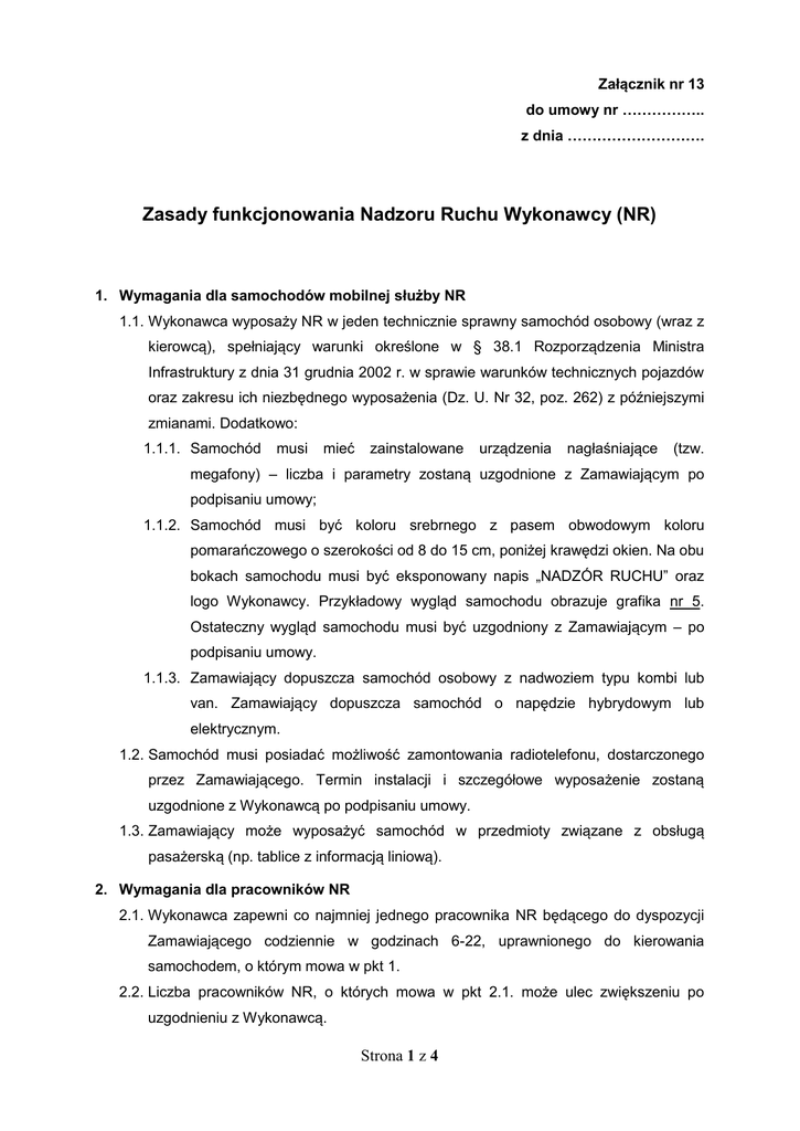 Załącznik nr 13 do umowy nr …………….. z dnia ………………………. Zasady funkcjonowania Nadzoru Ruchu Wykonawcy (NR) 1. Wymagania dla samochodów mobilnej służby NR 1.1. Wykonawca wyposaży NR w jeden technicznie sprawny samochód osobowy (wraz z kierowcą), spełniający warunki określone w § 38.1 Rozporządzenia Ministra Infrastruktury z dnia 31 grudnia 2002 r. w sprawie warunków technicznych pojazdów oraz zakresu ich niezbędnego wyposażenia (Dz. U. Nr 32, poz. 262) z późniejszymi zmianami. Dodatkowo: 1.1.1. Samochód musi mieć zainstalowane urządzenia nagłaśniające (tzw. megafony) – liczba i parametry zostaną uzgodnione z Zamawiającym po podpisaniu umowy; 1.1.2. Samochód musi być koloru srebrnego z pasem obwodowym koloru pomarańczowego o szerokości od 8 do 15 cm, poniżej krawędzi okien. Na obu bokach samochodu musi być eksponowany napis „NADZÓR RUCHU” oraz logo Wykonawcy. Przykładowy wygląd samochodu obrazuje grafika nr 5. Ostateczny wygląd samochodu musi być uzgodniony z Zamawiającym – po podpisaniu umowy. 1.1.3. Zamawiający dopuszcza samochód osobowy z nadwoziem typu kombi lub van. Zamawiający dopuszcza samochód o napędzie hybrydowym lub elektrycznym. 1.2. Samochód musi posiadać możliwość zamontowania radiotelefonu, dostarczonego przez Zamawiającego. Termin instalacji i szczegółowe wyposażenie zostaną uzgodnione z Wykonawcą po podpisaniu umowy. 1.3. Zamawiający może wyposażyć samochód w przedmioty związane z obsługą pasażerską (np. tablice z informacją liniową). 2. Wymagania dla pracowników NR 2.1. Wykonawca zapewni co najmniej jednego pracownika NR będącego do dyspozycji Zamawiającego codziennie w godzinach 6-22, uprawnionego do kierowania samochodem, o którym mowa w pkt 1. 2.2. Liczba pracowników NR, o których mowa w pkt 2.1. może ulec zwiększeniu po uzgodnieniu z Wykonawcą. Strona 1 z 4 2.3. Pracownicy NR, o którym mowa w pkt 2.1., muszą: 2.3.1. odbyć szkolenie z zakresu kierowania ruchem i posiadać aktualne zaświadczenie o jego odbyciu; 2.3.2. odbyć szkolenie w zakresie udzielania pierwszej pomocy i powtarzać cyklicznie takie szkolenie, jeżeli jest wymagane; 2.3.3. być do dyspozycji Zamawiającego codziennie w godzinach 6-22; w warunkach szczególnych (np. imprezy masowe, klęski żywiołowe itp.) zakres godzin może ulec zmianie – po uzgodnieniu z Wykonawcą; 2.3.4. przebywać wraz ze samochodem w miejscach wskazanych przez CR i wykonywać polecenia CR w zakresie: 2.3.4.1. kierowania ruchem drogowym, 2.3.4.2. ekspediowania pojazdów komunikacji miejskiej organizowanej przez Zamawiającego (TSB), 2.3.4.3. udzielania informacji pasażerom, 2.3.4.4. udzielania pomocy pasażerom niepełnosprawnym przy wsiadaniu i wysiadaniu z pojazdu komunikacji miejskiej, 2.3.4.5. umieszczania komunikatów na przystankach, 2.3.4.6. raportowania zakłóceń w funkcjonowaniu komunikacji miejskiej; szczegółowy zakres obowiązków i instrukcje zostaną przekazane Wykonawcy po podpisaniu umowy; 2.3.5. pełnić służbę w umundurowaniu, składającym się z: 2.3.5.1. koszuli jednobarwnej koloru białego lub granatowego z naszytym logo Wykonawcy, 2.3.5.2. bluzy jednobarwnej koloru granatowego typu „olimpijka” lub marynarki jednobarwnej koloru granatowego z naszytym logo Wykonawcy (w miejscu uzgodnionym z Zamawiającym), 2.3.5.3. spodni długich jednobarwnych koloru granatowego, 2.3.5.4. krawata jednobarwnego koloru granatowego, przy czym nakłada się obowiązek noszenia krawata przez cały rok, 2.3.5.5. kamizelki odblaskowej koloru pomarańczowego z odblaskowym napisem „NADZÓR RUCHU” z tyłu oraz logo (lub nazwą) Wykonawcy z przodu po lewej stronie, 2.3.5.6. czapkę stosowanego przez Zamawiającego wzoru, 2.3.5.7. obuwia i kurtki stosowanego przez Zamawiającego wzoru; dokładną wizualizację umundurowania Zamawiający przekaże Wykonawcy po podpisaniu umowy; koszt wyposażenia pracownika NR w umundurowanie pokrywa Wykonawca; Strona 2 z 4 2.3.6. znać język polski co najmniej w stopniu średniozaawansowanym (B1) w skali Rady Europy (ang. Common European Framework of Reference); 2.3.7. dokładnie znać zasady taryfowe, przepisy porządkowe, układ komunikacyjny Zamawiającego, kultury obsługi pasażera, jakości usług przewozowych; 2.3.8. dokładnie znać przepisy ustawy Prawo o ruchu drogowym. Strona 3 z 4 Grafika nr 5 ZAMAWIAJĄCY WYKONAWCA Strona 4 z 4