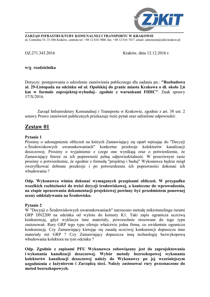 ZARZĄD INFRASTRUKTURY KOMUNALNEJ I TRANSPORTU W KRAKOWIE ul. Centralna 53, 31-586 Kraków, centrala tel. +48 12 616 7000, fax: +48 12 616 7417 ,email: [email protected] OZ.271.343.2016 Kraków, dnia 12.12.2016 r. w/g rozdzielnika Dotyczy: postępowania o udzielenie zamówienia publicznego dla zadania pn.: "Rozbudowa al. 29-Listopada na odcinku od ul. Opolskiej do granic miasta Krakowa o dł. około 2,6 km w formule zaprojektuj-wybuduj– zgodnie z warunkami FIDIC”. Znak sprawy 17/X/2016. Zarząd Infrastruktury Komunalnej i Transportu w Krakowie, zgodnie z art. 38 ust. 2 ustawy Prawo zamówień publicznych przekazuje treść pytań oraz udzielone odpowiedzi: Zestaw 01 Pytanie 1 Prosimy o udostępnienie obliczeń na których Zamawiający się oparł wpisując do "Decyzji o Środowiskowych uwarunkowaniach" konkretne przekroje kolektorów kanalizacji deszczowej. Prosimy o wyjaśnienie z czego one wynikają oraz o potwierdzenie, że Zamawiający bierze za ich poprawność pełną odpowiedzialność. W przeciwnym razie prosimy o potwierdzenie, że zgodnie z formułą "projektuj i buduj" Wykonawca będzie mógł zweryfikować dobrane przekroje i po potwierdzeniu ich poprawności dokonać ich wbudowania ? Odp. Wykonawca winien dokonać wymaganych przepisami obliczeń. W przypadku wszelkich rozbieżności do treści decyzji środowiskowej, a konieczne do wprowadzenia, na etapie opracowania dokumentacji projektowej powinny być przedmiotem ponownej oceny oddziaływania na Środowisko. Pytanie 2 W "Decyzji o Środowiskowych uwarunkowaniach" narzucono metodę mikrotunelingu rurami GRP DN2200 na odcinku od wylotu do komory K1. Taki zapis ogranicza uczciwą konkurencję, gdyż wyklucza inne materiały, powszechnie stosowane do tego typu zastosowań. Rury GRP tego typu oferuje właściwie jedna firma, co ewidentnie ogranicza konkurencję. Czy Zamawiający kierując się zasadą uczciwej konkurencji dopuszcza inne materiały niż GRP ? Czy Zamawiający dopuszcza inną technologię bezwykopową wbudowania kolektora na tym odcinku ? Odp. Zgodnie z zapisami PFU Wykonawca zobowiązany jest do zaprojektowania i wykonania kanalizacji deszczowej. Wybór metody bezrozkopowej wykonania kolektorów kanalizacji deszczowej należy do Wykonawcy po jej wcześniejszym uzgodnieniu z Inżynierem i Zarządcą sieci. Należy zastosować rury przeznaczone do metod bezrozkopowych. Pytanie 3 Czy w związku z realizacją zadania wg formuły "projektuj i buduj" ewentualne odstępstwa (wynikłe na etapie realizacji zadania) od szczegółowo rozpisanych rozwiązań w "Decyzji o Środowiskowych uwarunkowaniach" nie spowodują unieważnienia tejże decyzji ? Odp. W przypadku wystąpienia konieczności zastosowania rozwiązań innych niż pisane w DUŚ Wykonawca zobowiązany będzie przeprowadzić ponowną ocenę. Zestaw 02 Pytanie 1 Czy Zamawiający wystawi pełnomocnictwo dla przedstawiciela Oferenta do uzyskania decyzji ZRID z rygorem natychmiastowej wykonalności? Odp.Tak. Pytanie 2 Czy Zamawiający poda informację na temat parametrów zlewni pętli tramwajowej która ma być włączona do kanalizacji w ul. 29 listopada. Odp. Wykonawca powinien przyjąć wielkość zlewni na podstawie ogólnodostępnych materiałów (np. koncepcja). Pytanie 3 Czy Zamawiający uwzględni w terminie realizacji zadania konsekwencje wynikające z planowej zmiany ustawy z dnia 7 lipca 1994 r. - Prawo budowlane? Odp. Wykonawca zobowiązany jest do realizacji zgodnie z obowiązującymi przepisami prawa. Pytanie 4 Czy Zamawiający dopuści likwidację zjazdu w km 658+590, który koliduje wysokościowo i lokalizacyjnie z uzgodnionym rozwiązaniem koncepcji przebudowy ul. 29 listopada? Odp. Ostateczny zakres wykonywanych robót zostanie określony przez Wykonawcę w ramach opracowanej dokumentacji. Kontrakt realizowany jest w formule „projektuj i buduj”. Opracowana własnym kosztem i staraniem przez Wykonawcę dokumentacja, musi posiadać wszelkie niezbędne uzgodnienia, decyzje/zezwolenia, zostać uzgodniona i zatwierdzona przez Inżyniera i Zamawiającego, zgodnie z zapisami PFU gdzie zostały przedstawione wymagania minimalne. Wszelkie rozwiązania zaproponowane przez Wykonawcę mają być zgodne z DUŚ oraz obowiązującymi przepisami. Odp. Ewentualna konieczność stosowania zbiorników wynikać będzie z warunków technicznych uzyskanych od Zarządcy sieci oraz od obliczeń hydraulicznohydrologicznych, na podstawie których Wykonawca winien określić możliwości Strona 2 Pytanie 5 Czy w ramach przedmiotowego zadania należy wykonać zbiorniki retencyjne dla kanalizacji opadowej? Czy tylko pozostawić rezerwę terenową w rejonie km 659+850? przejęcia wód opadowych przez odbiorniki. Do Powyższego Wykonawca został zobowiązany zapisami PFU. Pytanie 6 Czy w ramach przedmiotowego zadania należy uwzględnić przeniesienie budynku „Jatka mięsna" wraz z jego renowacją? Odp.Tak Pytanie 7 Czy Zamawiający potwierdza konieczność rozbudowy wiaduktu kolejowego na trasie linii nr 95 w związku z budową trasy Galicyjskiej? Jeśli tak to prosimy o określenie warunków przebiegu projektowanej trasy Galicyjskiej i wynikających z nich parametrów obiektu mostowego. Odp. Ostateczny zakres wykonywanych robót zostanie określony przez Wykonawcę w ramach opracowanej dokumentacji. Kontrakt realizowany jest w formule „projektuj i buduj”. Opracowana własnym kosztem i staraniem przez Wykonawcę dokumentacja, musi posiadać wszelkie niezbędne uzgodnienia, decyzje/zezwolenia, zostać uzgodniona i zatwierdzona przez Inżyniera i Zamawiającego, zgodnie z zapisami PFU gdzie zostały przedstawione wymagania minimalne. Wszelkie rozwiązania zaproponowane przez Wykonawcę mają być zgodne z DUŚ oraz obowiązującymi przepisami. Zestaw 03 Pytanie 1 Zgodnie z Zapisami DŚ, str. 2 punkt 2.5 w ramach inwestycji należy odtworzyć zabytkowy obiekt budowlany „Jatka mięsna” – prosimy o wskazanie dokładnej lokalizacji jego odtworzenia. Pytanie 2 Z