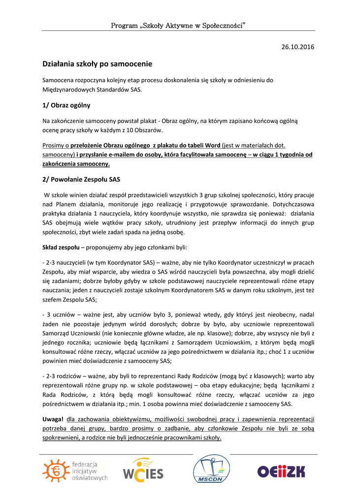 Program „Szkoły Aktywne w Społeczności” 26.10.2016 Działania szkoły po samoocenie Samoocena rozpoczyna kolejny etap procesu doskonalenia się szkoły w odniesieniu do Międzynarodowych Standardów SAS. 1/ Obraz ogólny Na zakończenie samooceny powstał plakat - Obraz ogólny, na którym zapisano końcową ogólną ocenę pracy szkoły w każdym z 10 Obszarów. Prosimy o przełożenie Obrazu ogólnego z plakatu do tabeli Word (jest w materiałach dot. samooceny) i przysłanie e-mailem do osoby, która facylitowała samoocenę – w ciągu 1 tygodnia od zakończenia samooceny. 2/ Powołanie Zespołu SAS W szkole winien działać zespół przedstawicieli wszystkich 3 grup szkolnej społeczności, który pracuje nad Planem działania, monitoruje jego realizację i przygotowuje sprawozdanie. Dotychczasowa praktyka działania 1 nauczyciela, który koordynuje wszystko, nie sprawdza się ponieważ: działania SAS obejmują wiele wątków pracy szkoły, utrudniony jest przepływ informacji do innych grup społeczności, zbyt wiele zadań spada na jedną osobę. Skład zespołu – proponujemy aby jego członkami byli: - 2-3 nauczycieli (w tym Koordynator SAS) – ważne, aby nie tylko Koordynator uczestniczył w pracach Zespołu, aby miał wsparcie, aby wiedza o SAS wśród nauczycieli była powszechna, aby mogli dzielić się zadaniami; dobrze byłoby gdyby w szkole podstawowej nauczyciele reprezentowali różne etapy nauczania; jeden z nauczycieli zostaje szkolnym Koordynatorem SAS w danym roku szkolnym, jest też szefem Zespolu SAS; - 3 uczniów – ważne jest, aby uczniów było 3, ponieważ wtedy, gdy któryś jest nieobecny, nadal żaden nie pozostaje jedynym wśród dorosłych; dobrze by było, aby uczniowie reprezentowali Samorząd Uczniowski (nie koniecznie główne władze, ale np. klasowe); dobrze, aby wszyscy nie byli z jednego rocznika; uczniowie będą łącznikami z Samorządem Uczniowskim, z którym będą mogli konsultować różne rzeczy, włączać uczniów za jego pośrednictwem w działania itp.; choć 1 z uczniów powinien mieć doświadczenie z samooceny SAS; - 2-3 rodziców – ważne, aby byli to reprezentanci Rady Rodziców (mogą być z klasowych); warto aby reprezentowali różne grupy np. w szkole podstawowej – oba etapy edukacyjne; będą łącznikami z Rada Rodziców, z którą będą mogli konsultować różne rzeczy, włączać uczniów za jego pośrednictwem w działania itp.; min. 1 osoba powinna mieć doświadczenie z samooceny SAS. Uwaga! dla zachowania obiektywizmu, możliwości swobodnej pracy i zapewnienia reprezentacji potrzeba danej grupy, bardzo prosimy o zadbanie, aby członkowie Zespołu nie byli ze sobą spokrewnieni, a rodzice nie byli jednocześnie pracownikami szkoły. Program „Szkoły Aktywne w Społeczności” Sposób pracy Zespołu Zespół SAS winien już na początku ustalić daty regularnych spotkań np. co 1,5-2 miesiące. Będą one poświęcone rozmowie o tym jak realizowany jest Plan działań i czy standardy i wskaźniki opisujące Obszary pracy SAS są w działaniach uwzględniane. Z każdego spotkania powinna powstać notatka, w której zapisane są najważniejsze spostrzeżenia i wnioski. Prosimy o przesłanie do osoby, która facylitowała samoocenę nazwiska i kontaktu (mail i telefon) do szkolnego Koordynatora SAS - w ciągu 1 tygodnia po zakończeniu samooceny. 3/ Ustalenie priorytetów na dany rok szkolny i praca nad Planem działania Plan działania powstaje w tabeli wg udostępnionego na platformie Moodle wzoru i jest tworzony przez Zespół SAS przy współpracy dyrektora szkoły i reszty społeczności szkolnej - wg uznania i potrzeb. Plan działań jest przyjmowany uchwałą rady Pedagogicznej i decyzjami SU i RR, podpisywany i dosyłany facylitatorowi - w 1 miesiąc po zakończeniu samooceny.