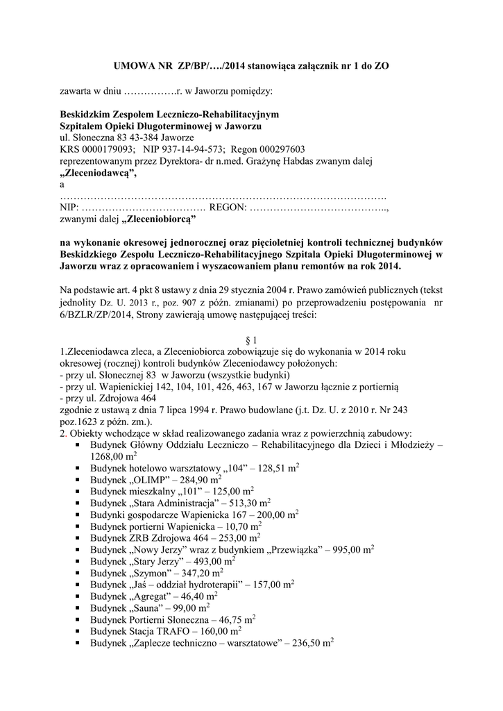 UMOWA NR ZP/BP/…./2014 stanowiąca załącznik nr 1 do ZO zawarta w dniu …………….r. w Jaworzu pomiędzy: Beskidzkim Zespołem Leczniczo-Rehabilitacyjnym Szpitalem Opieki Długoterminowej w Jaworzu ul. Słoneczna 83 43-384 Jaworze KRS 0000179093; NIP 937-14-94-573; Regon 000297603 reprezentowanym przez Dyrektora- dr n.med. Grażynę Habdas zwanym dalej „Zleceniodawcą”, a ……………………………………………………………………………………. NIP: ………………………………. REGON: ………………………………….., zwanymi dalej „Zleceniobiorcą” na wykonanie okresowej jednorocznej oraz pięcioletniej kontroli technicznej budynków Beskidzkiego Zespołu Leczniczo-Rehabilitacyjnego Szpitala Opieki Długoterminowej w Jaworzu wraz z opracowaniem i wyszacowaniem planu remontów na rok 2014. Na podstawie art. 4 pkt 8 ustawy z dnia 29 stycznia 2004 r. Prawo zamówień publicznych (tekst jednolity Dz. U. 2013 r., poz. 907 z późn. zmianami) po przeprowadzeniu postępowania nr 6/BZLR/ZP/2014, Strony zawierają umowę następującej treści: §1 1.Zleceniodawca zleca, a Zleceniobiorca zobowiązuje się do wykonania w 2014 roku okresowej (rocznej) kontroli budynków Zleceniodawcy położonych: - przy ul. Słonecznej 83 w Jaworzu (wszystkie budynki) - przy ul. Wapienickiej 142, 104, 101, 426, 463, 167 w Jaworzu łącznie z portiernią - przy ul. Zdrojowa 464 zgodnie z ustawą z dnia 7 lipca 1994 r. Prawo budowlane (j.t. Dz. U. z 2010 r. Nr 243 poz.1623 z późn. zm.). 2. Obiekty wchodzące w skład realizowanego zadania wraz z powierzchnią zabudowy: Budynek Główny Oddziału Leczniczo – Rehabilitacyjnego dla Dzieci i Młodzieży – 1268,00 m2 Budynek hotelowo warsztatowy „104” – 128,51 m2 Budynek „OLIMP” – 284,90 m2 Budynek mieszkalny „101” – 125,00 m2 Budynek „Stara Administracja” – 513,30 m2 Budynki gospodarcze Wapienicka 167 – 200,00 m2 Budynek portierni Wapienicka – 10,70 m2 Budynek ZRB Zdrojowa 464 – 253,00 m2 Budynek „Nowy Jerzy” wraz z budynkiem „Przewiązka” – 995,00 m2 Budynek „Stary Jerzy” – 493,00 m2 Budynek „Szymon” – 347,20 m2 Budynek „Jaś – oddział hydroterapii” – 157,00 m2 Budynek „Agregat” – 46,40 m2 Budynek „Sauna” – 99,00 m2 Budynek Portierni Słoneczna – 46,75 m2 Budynek Stacja TRAFO – 160,00 m2 Budynek „Zaplecze techniczno – warsztatowe” – 236,50 m2 ■ Budynek „Maria” – 380,00 m2 3. Szczegółowy zakres zamówienia: a).przegląd budynków, b).sporządzenie protokołów kontroli rocznej stanu technicznego budynków – odrębne protokoły dla każdego z budynków, c).zakres planu remontów na rok 2014 sporządzony na podstawie usterek i wad oraz wyników kontroli (plan musi zawierać zakres zadań oraz szacunkowe koszty), 4. Kontrola, o której mowa w §1 ust. 1, będzie obejmowała sprawdzenie stanu technicznego: a)elementów budynków, budowli i instalacji narażonych na szkodliwe wpływy atmosferyczne i niszczące działania czynników występujących podczas użytkowania obiektu, b) instalacji i urządzeń służących ochronie środowiska, c) instalacji gazowych oraz przewodów kominowych (dymowych, spalinowych i wentylacyjnych). 5.Wykonanie kontroli okresowej pięcioletniej wyżej wskazanych budynków – zgodnie z Prawem Budowlanym. 6. Zakres przeglądu instalacji elektrycznych oraz odgromowych: ■ Budynek „Stara Administracja” – pełne pomiary instalacji elektrycznych, odgromowych i uziomów ■ Budynek gospodarczy Wapienicka 167 – pełne pomiary instalacji elektrycznych, odgromowych i uziomów ■ Budynek portierni Wapienicka – pełne pomiary instalacji elektrycznych i odgromowych ■ Budynek „Stary Jerzy” – Badanie stanu instalacji odgromowej i uziomów ■ Budynek „Nowy Jerzy” - (TN-S) Badanie rezystancji izolacji obwodów, Badanie stanu instalacji odgromowej i uziomów ■ Budynek „Przewiązka” – (TN-C, TN-S) Badanie ochrony przed porażeniem przez samoczynne wyłączenie , Parametry zabezpieczeń różnicowoprądowych, (TN-S) Badanie rezystancji izolacji obwodów ■ Budynek „Szymon” – (TN-S) badanie rezystancji izolacji obwodów ■ Budynek „Jaś – oddział hydroterapii” – (TN-C, TN-S) Badanie ochrony przed porażeniem przez samoczynne wyłączenie, Parametry zabezpieczeń różnicowoprądowych, (TN-S) badanie rezystancji izolacji obwodów, Badanie stanu izolacji kabli, Badanie stanu instalacji odgromowej i uziomów ■ Budynek Stacja TRAFO – pełne pomiary instalacji elektrycznych i odgromowych ■ Budynek „Zaplecze techniczno – warsztatowe” – przy Oddziale dla Dzieci i Młodzieży – pełne pomiary instalacji elektrycznych i odgromowych ■ Kuchnia „F” - (TN-C, TN-S) Badanie ochrony przed porażeniem przez samoczynne wyłączenie, Parametry zabezpieczeń różnicowoprądowych,(TN-C) Badanie rezystancji izolacji obwodów, (TN-S) Badanie rezystancji izolacji obwodów, Badanie stanu izolacji kabli, Badanie stanu instalacji odgromowej i uziomów ■ Budynek Stacji Uzdatniania Wody - (TT) Badanie ochrony przed porażeniem przez samoczynne wyłączenie, Parametry zabezpieczeń różnicoprądowych, Badanie ciągłości PE i małych rezystancji §2 1.Strony ustalają, że po stronie Zleceniobiorcy leży sporządzenie protokołów w ilości 2 sztuki z przeprowadzonych przeglądów okresowych i kontroli technicznej budynków określonych w § 1 wraz z opracowaniem i wyszacowaniem planu remontów. 2.Zleceniobiorca zobowiązuje się wykonać przedmiot umowy bez udziału podwykonawców, z zastrzeżeniem postanowień § 9. §3 Umowa niniejsza będzie realizowana do 21 dni od dnia zawarcia umowy §4 1.W przypadku nienależytego wykonywania umowy (w tym opóźnienia w wykonywaniu obowiązków umownych) lub niewykonania umowy, Zleceniobiorca zobowiązany jest do zapłaty na rzecz Zleceniodawcy kary umownej w wysokości 10% całkowitego wynagrodzenia umownego brutto, z