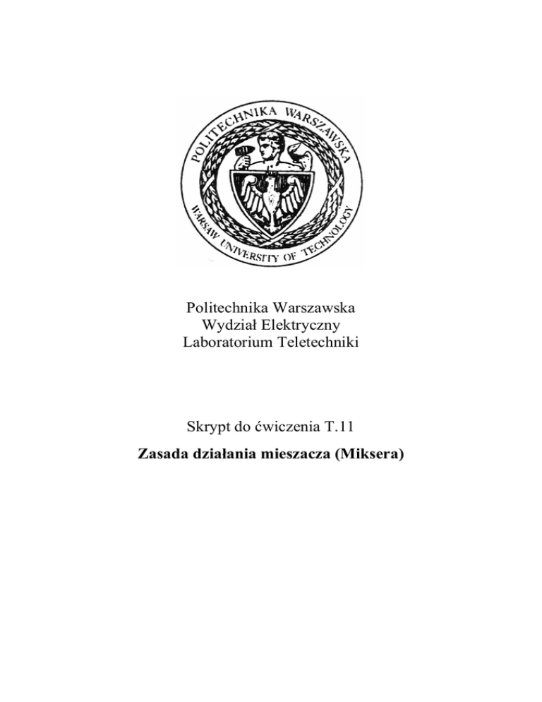 Politechnika Warszawska Wydział Elektryczny Laboratorium Teletechniki Skrypt do ćwiczenia T.11 Zasada działania mieszacza (Miksera) 1. Zasada działania mieszacza (Miksera) Ćwiczenie to ma na celu poznanie roli mieszacza w odbiorniku superheterodynowym. 1.1. Część teoretyczna Rolą miksera jest połączenie stopnia RF ze stopniem IF oraz wykonanie niezbędnych operacji do przekształcenia (lub przesunięcia) sygnału RF do stałej częstotliwości pośredniej. Teoretycznie sygnał wyjściowy miksera składa się z sumy i różnicy dwóch częstotliwości sygnałów wejściowych. Jednakże wyjścia rzeczywistych mieszaczy, często zawierają składowe częstotliwości odpowiadające sygnałom wejściowym. Rysunek 1.1 przedstawia taki przykład dla nośnej o częstotliwości 950 kHz modulowanej falą sinusoidalną o częstotliwości 5 kHz. Ponieważ sygnał wejściowy RF doprowadzony do wejścia miksera składa się z trzech częstotliwości składowych, sygnał wyjściowy miksera będzie składał się z sumy i różnicy częstotliwości dla trzech składowych RF. Prowadzi to w sumie do 4 grup częstotliwości składowych. MIKSER WYJŚCIE RF STOPIEŃ RF FILTR IF 945 950 955 1405 450 455 460 945 950 955 1405 2350 2355 2360 455 kHz DO DEMODULATORA 450 455 460 LOKALNY OSCYLATOR Rysunek 1.1. Składniki częstotliwości na wyjściu miksera. Ogólnie, obecność tych dodatkowych częstotliwości nie wywiera niekorzystnego wpływu na działanie odbiornika. Dzieje się tak ponieważ wyjściowy sygnał miksera przechodzi przez układ filtrów i wzmacniaczy w stopniu IF, gdzie jest dostrajany do stałej częstotliwości IF wynoszącej dla większości odbiorników 455 kHz. 1.2. Część praktyczna Opis ćwiczenia Celem wykonania ćwiczenia jest poznanie roli jaką pełni w odbiorniku superheterodynowym mieszacz. Zadaniem mieszaczy jest wykonanie niezbędnych operacji służących przemianie sygnału RF do stałej częstotliwości pośredniej. Przemianą częstotliwości nazywa się proces polegający na przetworzeniu częstotliwości zmodulowanego przebiegu nośnego na inną częstotliwość, zwaną częstotliwością pośrednią z zachowaniem zawartej w niej informacji. A więc otrzymany w wyniku przemiany sygnał o częstotliwości pośredniej ma taką samą obwiednię modulacji jak odbierany sygnał wielkiej częstotliwości. Celem przemiany częstotliwości jest uzyskanie optymalnych warunków wzmocnienia i filtracji przetwarzanych przebiegów elektrycznych oraz łatwiejszego strojenia układu. Przemiana częstotliwości jest stosowana w odbiornikach zwanych odbiornikami superheterodynowymi. Sygnał z anteny po wybraniu przez układy wejściowe i wzmocnieniu jest doprowadzony do układu mieszającego. Do tego samego układu mieszającego (zwanego również układem przemiany) jest doprowadzany sygnał z lokalnego generatora zwanego heterodyną. W odbiornikach superheterodynowych przy zmianie odbieranej radiostacji przestraja się tylko obwód wejściowy i obwód generatora (heterodyny). Otrzymana w wyniku przemiany częstotliwość jest następnie wzmacniana w kilku stopniach wzmacniaczy w.cz. zestrojonych dokładnie na częstotliwość pośrednią. Dzięki temu odbiornik ten odznacza się dużą czułością i selektywnością. Czynnikiem sprzyjającym zwiększeniu selektywności w porównaniu z innymi odbiornikami jest stałość częstotliwości pośredniej, która umożliwia zastosowanie wielu sprzężonych ze sobą obwodów rezonansowych (filtrów pasmowych) zestrojonych na jedną częstotliwość pośrednią. Na Rysunku 1.2 zostały pokazane urządzenia wykorzystywane w ćwiczeniu. Składają się na nie: - Zasilacz / Dwukanałowy wzmacniacz audio (ang. Power supply / Dual audio amplifier) - Dwukanałowy generator funkcji (ang. Dual function generator) - Licznik częstotliwości (ang. Frequency counter) - Analizator Widma (ang. Spectrum analyzer) - Generator AM / DSB / SSB (ang. AM / DSB / SSB generator) - Odbiornik AM / DSB (ang. AM / DSB receiver) - Oscyloskop (ang. Oscilloscope) Dwukanałowy Generator Funkcji Wyjście A Wejście audio Generator AM/DSB/SSB Wyjście AM/DSB/SSB Wejście RF Odbiornik AM/DSB Wyjście OSC Analizator Widma Wejście Rysunek 1.2. Schemat ideowy przedstawiający połączenia pomiędzy urządzeniami wykorzystywanymi w ćwiczeniu.