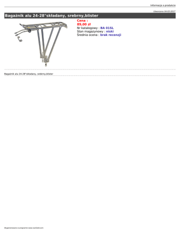 Informacje o produkcie Utworzono 04-03-2017 Bagażnik alu 24-28"składany, srebrny,blister Cena : 89,00 zł Nr katalogowy : BA 01SL Stan magazynowy : niski Średnia ocena : brak recenzji Bagażnik alu 24-28"składany, srebrny,blister Wygenerowano w programie www.oscGold.com