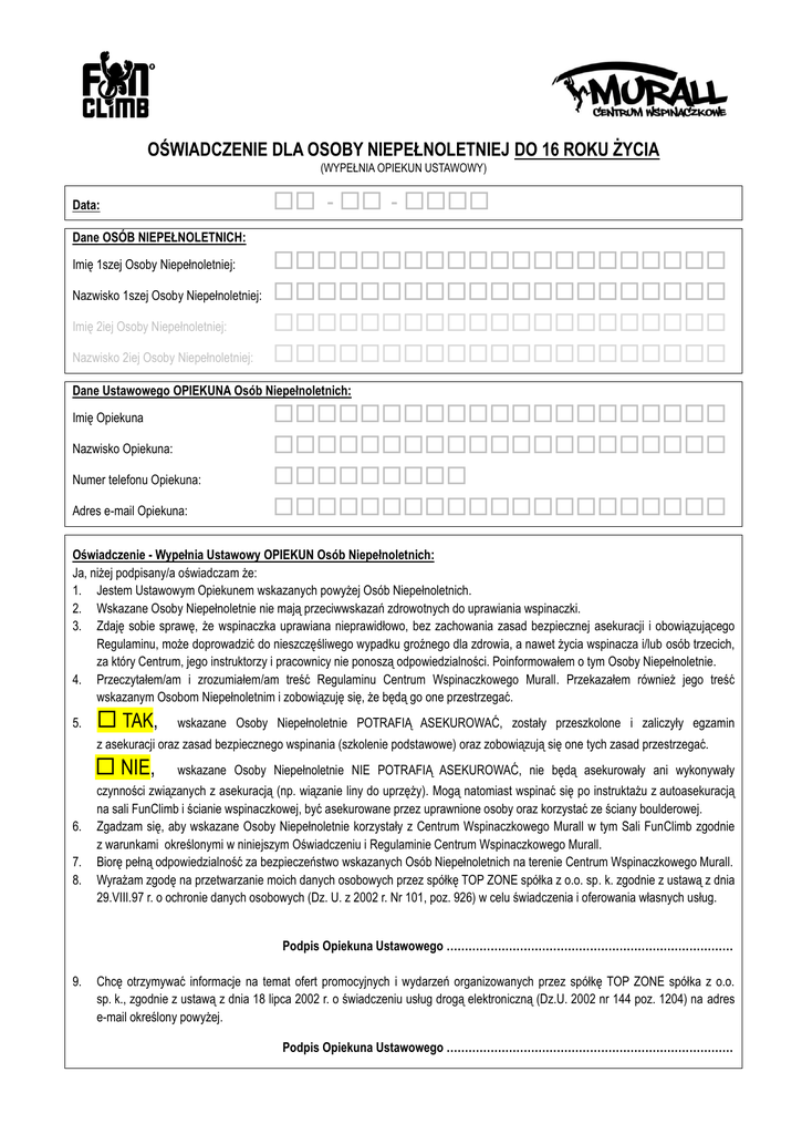 OŚWIADCZENIE DLA OSOBY NIEPEŁNOLETNIEJ DO 16 ROKU ŻYCIA (WYPEŁNIA OPIEKUN USTAWOWY) - - Data: Dane OSÓB NIEPEŁNOLETNICH: Imię 1szej Osoby Niepełnoletniej: Nazwisko 1szej Osoby Niepełnoletniej: Imię 2iej Osoby Niepełnoletniej: Nazwisko 2iej Osoby Niepełnoletniej: Dane Ustawowego OPIEKUNA Osób Niepełnoletnich: Imię Opiekuna Nazwisko Opiekuna: Numer telefonu Opiekuna: Adres e-mail Opiekuna: Oświadczenie - Wypełnia Ustawowy OPIEKUN Osób Niepełnoletnich: Ja, niżej podpisany/a oświadczam że: 1. Jestem Ustawowym Opiekunem wskazanych powyżej Osób Niepełnoletnich. 2. Wskazane Osoby Niepełnoletnie nie mają przeciwwskazań zdrowotnych do uprawiania wspinaczki. 3. Zdaję sobie sprawę, że wspinaczka uprawiana nieprawidłowo, bez zachowania zasad bezpiecznej asekuracji i obowiązującego Regulaminu, może doprowadzić do nieszczęśliwego wypadku groźnego dla zdrowia, a nawet życia wspinacza i/lub osób trzecich, za który Centrum, jego instruktorzy i pracownicy nie ponoszą odpowiedzialności. Poinformowałem o tym Osoby Niepełnoletnie. 4. Przeczytałem/am i zrozumiałem/am treść Regulaminu Centrum Wspinaczkowego Murall. Przekazałem również jego treść wskazanym Osobom Niepełnoletnim i zobowiązuję się, że będą go one przestrzegać. 5. TAK, wskazane Osoby Niepełnoletnie POTRAFIĄ ASEKUROWAĆ, zostały przeszkolone i zaliczyły egzamin z asekuracji oraz zasad bezpiecznego wspinania (szkolenie podstawowe) oraz zobowiązują się one tych zasad przestrzegać. NIE, 6. 7. 8. wskazane Osoby Niepełnoletnie NIE POTRAFIĄ ASEKUROWAĆ, nie będą asekurowały ani wykonywały czynności związanych z asekuracją (np. wiązanie liny do uprzęży). Mogą natomiast wspinać się po instruktażu z autoasekuracją na sali FunClimb i ścianie wspinaczkowej, być asekurowane przez uprawnione osoby oraz korzystać ze ściany boulderowej. Zgadzam się, aby wskazane Osoby Niepełnoletnie korzystały z Centrum Wspinaczkowego Murall w tym Sali FunClimb zgodnie z warunkami określonymi w niniejszym Oświadczeniu i Regulaminie Centrum Wspinaczkowego Murall. Biorę pełną odpowiedzialność za bezpieczeństwo wskazanych Osób Niepełnoletnich na terenie Centrum Wspinaczkowego Murall. Wyrażam zgodę na przetwarzanie moich danych osobowych przez spółkę TOP ZONE spółka z o.o. sp. k. zgodnie z ustawą z dnia 29.VIII.97 r. o ochronie danych osobowych (Dz. U. z 2002 r. Nr 101, poz. 926) w celu świadczenia i oferowania własnych usług. Podpis Opiekuna Ustawowego …………………………………………………………………… 9. Chcę otrzymywać informacje na temat ofert promocyjnych i wydarzeń organizowanych przez spółkę TOP ZONE spółka z o.o. sp. k., zgodnie z ustawą z dnia 18 lipca 2002 r. o świadczeniu usług drogą elektroniczną (Dz.U. 2002 nr 144 poz. 1204) na adres e-mail określony powyżej. Podpis Opiekuna Ustawowego ……………………………………………………………………
