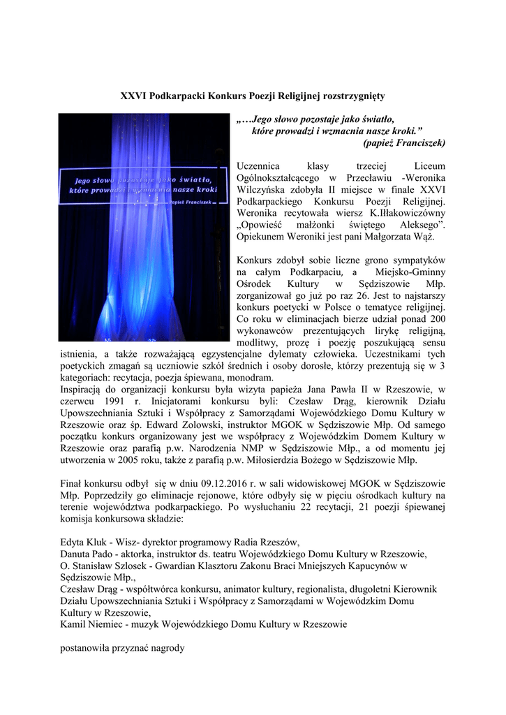 XXVI Podkarpacki Konkurs Poezji Religijnej rozstrzygnięty „…Jego słowo pozostaje jako światło, które prowadzi i wzmacnia nasze kroki.” (papież Franciszek) Uczennica klasy trzeciej Liceum Ogólnokształcącego w Przecławiu -Weronika Wilczyńska zdobyła II miejsce w finale XXVI Podkarpackiego Konkursu Poezji Religijnej. Weronika recytowała wiersz K.Iłłakowiczówny „Opowieść małżonki świętego Aleksego”. Opiekunem Weroniki jest pani Małgorzata Wąż. Konkurs zdobył sobie liczne grono sympatyków na całym Podkarpaciu, a Miejsko-Gminny Ośrodek Kultury w Sędziszowie Młp. zorganizował go już po raz 26. Jest to najstarszy konkurs poetycki w Polsce o tematyce religijnej. Co roku w eliminacjach bierze udział ponad 200 wykonawców prezentujących lirykę religijną, modlitwy, prozę i poezję poszukującą sensu istnienia, a także rozważającą egzystencjalne dylematy człowieka. Uczestnikami tych poetyckich zmagań są uczniowie szkół średnich i osoby dorosłe, którzy prezentują się w 3 kategoriach: recytacja, poezja śpiewana, monodram. Inspiracją do organizacji konkursu była wizyta papieża Jana Pawła II w Rzeszowie, w czerwcu 1991 r. Inicjatorami konkursu byli: Czesław Drąg, kierownik Działu Upowszechniania Sztuki i Współpracy z Samorządami Wojewódzkiego Domu Kultury w Rzeszowie oraz śp. Edward Zolowski, instruktor MGOK w Sędziszowie Młp. Od samego początku konkurs organizowany jest we współpracy z Wojewódzkim Domem Kultury w Rzeszowie oraz parafią p.w. Narodzenia NMP w Sędziszowie Młp., a od momentu jej utworzenia w 2005 roku, także z parafią p.w. Miłosierdzia Bożego w Sędziszowie Młp. Finał konkursu odbył się w dniu 09.12.2016 r. w sali widowiskowej MGOK w Sędziszowie Młp. Poprzedziły go eliminacje rejonowe, które odbyły się w pięciu ośrodkach kultury na terenie województwa podkarpackiego. Po wysłuchaniu 22 recytacji, 21 poezji śpiewanej komisja konkursowa składzie: Edyta Kluk - Wisz- dyrektor programowy Radia Rzeszów, Danuta Pado - aktorka, instruktor ds. teatru Wojewódzkiego Domu Kultury w Rzeszowie, O. Stanisław Szlosek - Gwardian Klasztoru Zakonu Braci Mniejszych Kapucynów w Sędziszowie Młp., Czesław Drąg - współtwórca konkursu, animator kultury, regionalista, długoletni Kierownik Działu Upowszechniania Sztuki i Współpracy z Samorządami w Wojewódzkim Domu Kultury w Rzeszowie, Kamil Niemiec - muzyk Wojewódzkiego Domu Kultury w Rzeszowie postanowiła przyznać nagrody W kategorii recytacja (młodzież): I miejsce – Jakub Skupień- Miejski Ośrodek Kultury „Śnieżka” w Dębicy 400zł - nagroda ufundowana przez MGOK Sędziszów Młp. II miejsce – Weronika Wilczyńska – Zespół Szkół w Przecławiu - 300zł nagroda ufundowana przez MGOK Sędziszów Młp. III miejsce -Szymon Dorak- MGOK Sędziszów Młp - 200zł nagroda ufundowana przez MGOK Sędziszów 200zł Młp. III miejsce - Małgorzata Stopyra- Miejski Dom Kultury w Lubaczowie- 200zł- nagroda ufundowana przez MGOK Sędziszów Młp. Wyróżnienia: Jakub Daraż - II Liceum Ogólnokształcące w Przemyślu, Adrianna JaworskaZespół Szkół Budowlanych i Ogólnokształcących w Jarosławiu W kategorii recytacja (dorośli): I miejsce – Magdalena Maruszak – Miejskie Centrum Kultury w Leżajsku 400zł- nagroda ufundowana przez MGOK Sędziszów Młp. W kategorii poezja śpiewana (młodzież): I miejsce – Aleksandra Stawarz-III Liceum Ogólnokształcące w Rzeszowie- 400zł -nagroda ufundowana przez dyrektora WDK w Rzeszowie I miejsce – Maria Socha- I Liceum Ogólnokształcące – Dębica-400zł -nagroda ufundowana przez dyrektora WDK w Rzeszowie II miejsce – Aleksandra Sienkowska- Liceum Ogólnokształcące w Strzyżowie- 300zł nagroda ufundowana przez dyrektora WDK w Rzeszowie II miejsce –Izabela Skrzypek- Zespół Szkół Technicznych i Ogólnokształcących w Jarosławiu-300zł nagroda ufundowana przez dyrektora WDK w Rzeszowie III miejsce - Anna Starzyk –Zespół Szkół Ekonomicznych w Mielcu200zł nagroda ufundowana przez dyrektora WDK w Rzeszowie III miejsce – Aleksandra Wajda –Zespół Szkół Ogólnokształcących i Zawodowych w Przeworsku-200zł nagroda ufundowana przez dyrektora WDK w Rzeszowie III miejsce – Klaudia Bochno- Zespół Szkół Budowlanych i Ogólnokształcących w Jarosławiu 200zl nagroda ufundowana przez dyrektora WDK w Rzeszowie W kategorii poezja śpiewana (dorośli): I miejsce-Natalia Bednarz-Niemiec- Centrum Kultury w Kamieniu- 300zlł nagroda ufundowana przez dyrektora WDK w Rzeszowie II miejsce Dominika Sanecka –Wydział Muzyki Uniwersytetu Rzeszowskiego -200 zł nagroda ufundowana przez dyrektora WDK w Rzeszowie Wyróżnienia: Monika Witkoś i Aleksandra Lidwin - Zespół PonadgimnazjalnychNr5 w Krośnie MW GALERIA