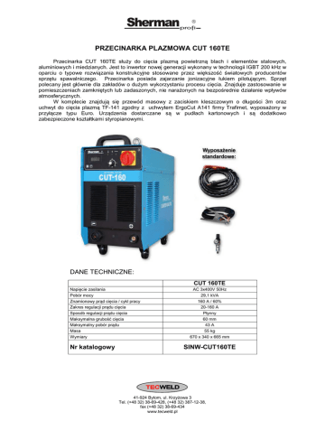 PRZECINARKA PLAZMOWA CUT 160TE Przecinarka CUT 160TE służy do cięcia plazmą powietrzną blach i elementów stalowych, aluminiowych i miedzianych. Jest to inwertor nowej generacji wykonany w technologii IGBT 200 kHz w oparciu o typowe rozwiązania konstrukcyjne stosowane przez większość światowych producentów sprzętu spawalniczego. Przecinarka posiada zajarzanie jonizacyjne łukiem pilotującym. Sprzęt polecany jest głównie dla zakładów o dużym wykorzystaniu procesu cięcia. Znajduje zastosowanie w pomieszczeniach zamkniętych lub zadaszonych, nie narażonych na bezpośrednie działanie wpływów atmosferycznych. W komplecie znajdują się przewód masowy z zaciskiem kleszczowym o długości 3m oraz uchwyt do cięcia plazmą TF-141 zgodny z uchwytem ErgoCut A141 firmy Trafimet, wyposażony w przyłącze typu Euro. Urządzenia dostarczane są w pudłach kartonowych i są dodatkowo zabezpieczone kształtkami styropianowymi. DANE TECHNICZNE: CUT 160TE Napięcie zasilania Pobór mocy Znamionowy prąd cięcia / cykl pracy Zakres regulacji prądu cięcia Sposób regulacji prądu cięcia Maksymalna grubość cięcia Maksymalny pobór prądu Masa Wymiary Nr katalogowy AC 3x400V 50Hz 29,1 kVA 160 A / 60% 20-160 A Płynny 60 mm 43 A 55 kg 670 x 340 x 665 mm SINW-CUT160TE 41-924 Bytom, ul. Krzyżowa 3 Tel. (+48 32) 38-69-428, (+48 32) 387-12-38, fax (+48 32) 38-69-434 www.tecweld.pl