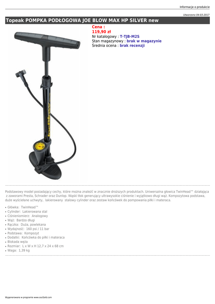 Informacje o produkcie Utworzono 04-03-2017 Topeak POMPKA PODŁOGOWA JOE BLOW MAX HP SILVER new Cena : 119,90 zł Nr katalogowy : T-TJB-M2S Stan magazynowy : brak w magazynie Średnia ocena : brak recenzji Podstawowy model posiadający cechy, które można znaleźć w znacznie droższych produktach. Uniwersalna głowica TwinHead™ działająca z zaworami Presta, Schrader oraz Dunlop. Wąski tłok generujący ultrawysokie ciśnienie i wyjątkowo długi wąż. Kompozytowa podstawa, duże wyściełane uchwyty, lakierowany stalowy cylinder oraz zestaw końcówek do pompowania piłki i materaca. ● ● ● ● ● ● ● ● ● ● ● Główka: TwinHead™ Cylinder: Lakierowana stal Ciśnieniomierz: Analogowy Wąż: Bardzo długi Rączka: Duża, powlekana Wydajność: 160 psi / 11 bar Podstawa: Kompozyt Dodatki: Końcówka do piłki i materaca Blokada węża Rozmiar: L x W x H 12,7 x 24 x 68 cm Waga: 1,39 kg Wygenerowano w programie www.oscGold.com