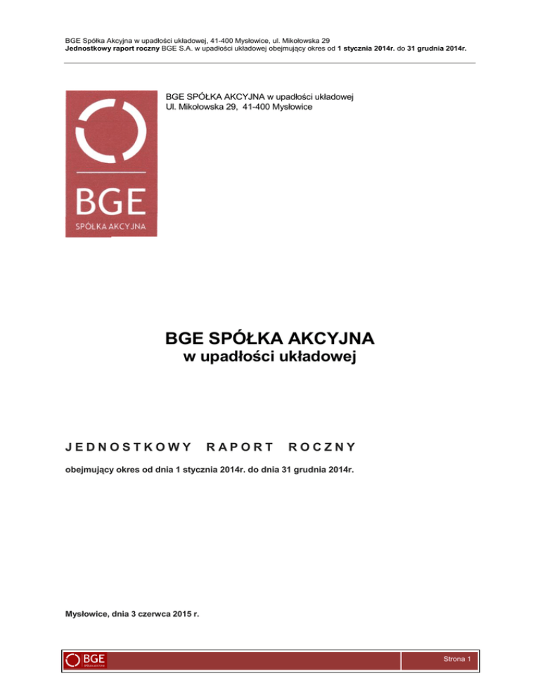 BGE Spółka Akcyjna w upadłości układowej, 41-400 Mysłowice, ul. Mikołowska 29 Jednostkowy raport roczny BGE S.A. w upadłości układowej obejmujący okres od 1 stycznia 2014r. do 31 grudnia 2014r. BGE SPÓŁKA AKCYJNA w upadłości układowej Ul. Mikołowska 29, 41-400 Mysłowice BGE SPÓŁKA AKCYJNA w upadłości układowej JEDNOSTKOWY RAPORT ROCZNY obejmujący okres od dnia 1 stycznia 2014r. do dnia 31 grudnia 2014r. Mysłowice, dnia 3 czerwca 2015 r. Strona 1 BGE Spółka Akcyjna w upadłości układowej, 41-400 Mysłowice, ul. Mikołowska 29 Jednostkowy raport roczny BGE S.A. w upadłości układowej obejmujący okres od 1 stycznia 2014r. do 31 grudnia 2014r. Jednostkowy raport roczny BGE S.A. w upadłości układowej zawiera: 1. PODSTAWOWE INFORMACJE O EMITENCIE 2. PISMO ZARZĄDU OMAWIAJĄCE, W ZWIĘZŁY SPOSÓB, NAJWAŻNIEJSZE DOKONANIA / NIEPOWODZENIA EMITENTA W DANYM ROK OBROTOWYM I PERSPEKTYWY ROZWOJU DZIAŁALNOŚCI EMITENTA NA NAJBLIŻSZY ROK OBROTOWY 3. WYBRANE DANE FINANSOWE ZAWIERAJĄCE PODSTAWOWE POZYCJE SPRAWOZDANIA FINANSOWEGO ZA 2014 ROK (PRZELICZONE NA EURO) 4. ROCZNE SPRAWOZDANIE FINANSOWE WRAZ ZE STANOWISKIEM NIEZALEŻNEGO BIEGŁEGO REWIDENTA Z BADANIA SPRAWOZDANIA FINANSOWEGO ZA 2014 ROK 5. SPRAWOZDANIE ZARZĄDU Z DZIAŁALNOŚCI SPÓŁKI ZA 2014 ROK 6. OŚWIADCZENIE ZARZĄDU W SPRAWIE RZETELNOŚCI SPRAWOZDANIA FINANSOWEGO 7. OŚWIADCZENIE ZARZĄDU W SPRAWIE PODMIOTU DOKONUJĄCEGO BADANIA SPRAWOZDANIA FINANSOWEGO 8. INFORMACJE NA TEMAT STOSOWANIA ŁADU KORPORACYJNEGO Strona 2 BGE Spółka Akcyjna w upadłości układowej, 41-400 Mysłowice, ul. Mikołowska 29 Jednostkowy raport roczny BGE S.A. w upadłości układowej obejmujący okres od 1 stycznia 2014r. do 31 grudnia 2014r. 1. PODSTAWOWE INFORMACJE O EMITENCIE BGE Spółka Akcyjna w upadłości układowej 41-400 Mysłowice, ul. Mikołowska 29 tel./fax: +48 32 204 49 12 / + 48 32 204 41 23 e-mail: [email protected] www: bgesa.pl Nr KRS 0000362603 Nr REGON 241611346 Nr NIP 6342755147 Kapitał zakładowy: 995.123,30 zł Zarząd: Dariusz Konstanty Prezes Zarządu Rada Nadzorcza (stan na dzień sporządzenia raportu): Maciej Grzymała-Sojecki Wiceprzewodniczący Rady Nadzorczej Bogusław Bączyk Członek Rady Nadzorczej Zbigniew Bułka Członek Rady Nadzorczej Janusz Drozdowski Członek Rady Nadzorczej Paweł Kania Członek Rady Nadzorczej Paweł Klimka Członek Rady Nadzorczej Henryk Korpusik Członek Rady Nadzorczej Zbigniew Piątek Członek Rady Nadzorczej Radosław Polowy Członek Rady Nadzorczej Strona 3 BGE Spółka Akcyjna w upadłości układowej, 41-400 Mysłowice, ul. Mikołowska 29 Jednostkowy raport roczny BGE S.A. w upadłości układowej obejmujący okres od 1 stycznia 2014r. do 31 grudnia 2014r. 2. PISMO ZARZĄDU OMAWIAJĄCE, W ZWIĘZŁY SPOSÓB, NAJWAŻNIEJSZE DOKONANIA / NIEPOWODZENIA EMITENTA W DANYM ROK OBROTOWYM I PERSPEKTYWY ROZWOJU DZIAŁALNOŚCI EMITENTA NA NAJBLIŻSZY ROK OBROTOWY Szanowni Akcjonariusze, Partnerzy, Pracownicy BGE S.A. w upadłości układowej Zarządu Spółki BGE S.A. w upadłości układowej przekazuje Państwu „Jednostkowy raport roczny za 2014 rok”, zawierający miedzy innymi sprawozdanie finansowe, sprawozdanie Zarządu oraz stanowisko niezależnego biegłego rewidenta z badania sprawozdania finansowego za 2014 rok. Po otrzymaniu przez Spółkę w dniu 20.11.2013r. postanowienia Sądu o ogłoszeniu upadłości z możliwością zawarcia układu z wierzycielami rozpoczął się proces objęty procedurą upadłości układowej. Z początkiem 2014 roku trwały wspólnie z Nadzorcą Sądowym prace nad weryfikacją zgłaszanych wierzytelności oraz prowadzone były przez Zarząd negocjacje z Wierzycielami Spółki w celu uzyskania akceptacji złożonych propozycji układowych. W konsekwencji pod koniec 2014 roku została złożona Sędziemu Komisarzowi lista wierzytelności. Na dzień 06.05.2015r. zostało wyznaczone zgromadzenie wierzycieli, którego przedmiotem obrad miało być głosowania nad układem. Sędzia Komisarz posiadając informację o toczących się rokowaniach pomiędzy inwestorem strategicznym, a kluczowymi wierzycielami Spółki, odroczyła termin głosowania nad układem na dzień 23.06.2015r. Toczący się proces restrukturyzacji Spółki został podjęty w celu jej reorganizacji i dostosowania do aktualnej sytuacji formalnoprawnej i rynkowej, obniżenia kosztów działalności i zabezpieczenia przyszłych przychodów i kontraktów. Zgodnie z nową strategią rozwoju i działania całej Grupy Kapitałowej BGE S.A., Spółka BGE S.A. w upadłości układowej przyjęła rolę Spółki właścicielsko - inwestycyjnej. Z chwilą zamknięcia postępowania upadłościowego z możliwością zawarcia układu Spółka BGE S.A. w upadłości układowej zapewni finansowanie, a przez to dalszy rozwój Grupy Kapitałowej BGE S.A wykorzystując giełdowe instrumenty finansowe. Zarząd Emitenta zakłada dalsze kontynuowanie działalności gospodarczej zgodnie z przyjętą nową strategią biznesową. Spółka zakłada uzyskiwanie przychodów z działalności produkcyjnej, handlowej oraz usługowej, za pośrednictwem Spółek obiektowych i Spółek współpracujących. Kontynuowanie przez Spółkę i Grupę Kapitałową BGE S.A. działalności gospodarczej, poprzez wykorzystanie doświadczenia, kontaktów i potencjału pracowników Grupy umożliwi uzyskanie przez Spółkę i Grupę BGE S.A. przychodów pokrywających bieżące koszty prowadzenia działalności, koszty postępowania upadłościowego oraz pozwolą osiągnąć zysk. Zarząd Spółki dziękuje wszystkim Akcjonariuszom, Radzie Nadzorczej, Pracownikom za współpracę i okazałe wsparcie. Z poważaniem DARIUSZ KONSTANTY ........................................................... PREZES ZARZĄDU Strona 4 BGE Spółka Akcyjna w upadłości układowej, 41-400 Mysłowice, ul. Mikołowska 29 Jednostkowy raport roczny BGE S.A. w upadłości układowej obejmujący okres od 1 stycznia 2014r. do 31 grudnia 2014r.