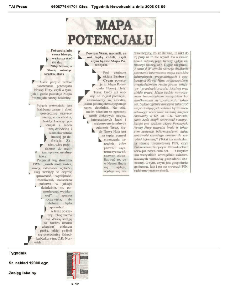 TAI Press 060677641701 Głos - Tygodnik Nowohucki z dnia 2006-06-09 MAPA POTENCJAŁU r Potencjalnie rzecz biorąc, k wykorzystać się da. Niby Nowa, a Stara, mówiąc krótko, Huta f Słów parę o próbie okiełznania potencjału Nowej Huty, czyli o tym, jak i gdzie powstaje Mapa Potencjału naszej dzielnicy. Pojęcie potencjału jest każdemu znane i choć teoretycznie wszyscy wiemy, o co chodzi, każdy kojarzy po^ tencjał z nieco inną dziedziną i konsekwentnie inaczej go definiuje. Żarn nim, więc przejdziemy do merir tum sprawy, ustalmy fakty. Potencjał wg słownika PWN: „zasób możliwości, mocy, zdolności wytwórczej tkwiący w czymś; sprawność, wydajność, możliwość, zwłaszcza państwa w jakiejś dziedzinie, np. gospodarczej, wojskowej", sprawa k oczywista, ale dobrze było k sprawdzić. * A teraz do rzeczy. Chcę zwrócić Waszą uwagę na bardzo (moim zdaniem) ciekawą próbę, jakiej podjęli się pracownicy Ośrodka Kultury im. C.K. Norwida. r r Tygodnik Śr. nakład 12000egz. Zasięg lokalny s. 12 Powiem Warn, moi mili, co oni będą robili, czyli . czym będzie Mapa Po^. tencjału. ^ Pod czujnym okiem Barbary Cygan powstam je tu Mapa Potencjału Nowej Huty. Teraz, kiedy już wiemy, co to jest potencjał, zastanówmy się chwilkę, jakim potencjałem dysponuje nasza dzielnica. No cóż, moim zdaniem to ogromny k zasób ciekawych miejsc, interesujących ludzi i ^ niekonwencjonalnych k zdarzeń. Teraz, kie^ dy Nowa Huta jest na topie, pomysł ^ stworzenia narzędzia, które pozwoli usystematyzować, nazwać i zlokalizować to, co w Nowej Hucie się znajduje, wydaje się tak V rewelacyjny, że aż dziwne, iż nikt do tej pory na to nie wpadł. Co o swoim dziele mówią jego twórcy (gdyż zaznaczyć należy, że p. Cygan nie pracuje sama)? W wyniku naszego działania powstanie internetowa mapa zasobów kulturalnych, przyrodniczych i społecznych Nowej Huty, :e szczególnym uwzględnieniem rynku pracy, inicjatyw i przedsiębiorczości lokalnej oraz giełda pracy. Mapa będzie nowoczesnym innowacyjnym narzędziem komunikowania się społeczności lokalnej, będzie ogólnie dostępna (dla osób nie posiadających w domu łącza internetowego stworzone zostaną miejsca chociażby w OK im. C.K. Nor\vida, gdzie będą mogli skorzystać z mapy). Dzięki tym cechom Mapa Potencjału Nowej Huty uzupełni braki w lokalnym systemie informacyjnym, dając możliwość szybkiego dostępu do szerokiej informacji. (Tekst ten znalazłam na stronie internetowej PIN, czyli Partnerstwa Inicjatyw Nowohuckich www.pin.nowa-huta.net. Odsyłam tam wszystkich szczególnie zainteresowanych tematyką gospodarki społecznej. O tym, czym jest gospodarka społeczna, kto i po co stworzył PIN, będziemy jeszcze pisać). TAI Press 060677641702 Głos - Tygodnik Nowohucki z dnia 2006-06-09 Jak to się stało, że im się chciało? Czyli kto za to wszystko płaci? Pomysł być może rewelacyjny, ale powszechnie wiadomo, że ludzie do pracy potrzebują motywacji. No i niestety w dzisiejszych czasach najsilniej na ludzi działa motywacja finansowa. Podstawowe pytanie brzmi: kto płaci za naszą mapę? „Pan płaci, i pan płaci". Ja nie, na szczęście tym razem nie, ani nie pan, ani nie ja, ani nie wy. Każda inicjatywa społeczna budzi lęk, to na pewno z pieniędzy podatników: zamiast wydać je na coś rozsądnego zajmują się piiiiiii. I tu przyjemna niespodzianka: na swoją inicjatywę twórcy Mapy uzyskali fundusze unijne (pomysł realizowany jest w ramach programu Eąual i znów zainteresowanych odsyłam do ww. strony), to już nastraja nas optymistycznie. Skoro za unijne pieniądze powstanie Mapa Potencjału Nowej Huty, z której nie dość, że wszyscy będziemy mogli korzystać, to jeszcze dzięki niej być może jakiś inwestor szukający miejsca na rozkręcenie interesu trafi do Huty albo jakaś osoba chcąca ciekawie spędzić czas wyląduje właśnie w naszej dzielnicy... Rewelacyjna reklama... Nie pozostaje nic innego, jak powiedzieć: brawo, tak trzymać. Automatycznie rodzą się pytania: Kiedy będzie można skorzystać z mapy. Jakie dokładnie informacje będą się tam znajdowały? Jak to będzie działać? Powolutku, spokojnie, o tym wszystkim napiszemy jeszcze w te wakacje. Na razie to tyle do Was, tylko mała prośba: napiszcie, co sądzicie o samym pomyśle, jakie Waszym zdaniem informacje powinny się znaleźć na takiej Mapie Potencjału Nowej Huty. Czyli co Waszym zdaniem stanowi o prawdziwej sile naszej dzielnicy, co stanowi jej potencjał. Przypominam nasz adres [email protected]. Aga Tygodnik Śr. nakład 12000egz. Zasięg lokalny s. 12