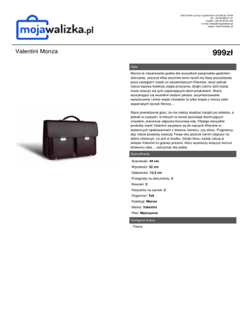 Call Center czynny w godzinach od 8:00 do 16:00 tel. +48 58 668 01 31 mobile: +48 50 50 50 164 e-mail: [email protected] skype: valentinisklep_pl 999zł Valentini Monza Opis Monza to niesamowita gratka dla wszystkich pasjonatów galanterii skórzanej. Jeszcze kilka sezonów temu teczki tej klasy pozostawały poza zasięgiem nawet co zasobniejszych Klientów, teraz jednak nasza topowa kolekcja uległa przecenie, dzięki czemu dziś każdy może cieszyć się tymi zapierającymi dech produktami. Skóra wymykająca się wszelkim skalom jakości, arcymistrzowskie wykończenie i silnie męski charakter to tylko kropla z morza zalet wspaniałych teczek Monza… Stare powiedzenie głosi, że nie należy osądzać książki po okładce, a jednak w czasach, w których to wzrok pozostaje dominującym zmysłem, prezencja odgrywa kluczową rolę. Dlatego wszystkie produkty marki Valentini wysyłane są do naszych Klientów w wytwornych opakowaniach z drewna, kartonu, czy skóry. Pragniemy, aby nasze produkty cieszyły Twoje oko jeszcze zanim zdążysz na dobre zobaczyć, co jest w środku. Dzięki temu, każdy zakup w sklepie Valentini to gotowy prezent, który wystarczy wręczyć komuś bliskiemu albo… zatrzymać dla siebie. Specyfikacja Szerokość: 44 cm Wysokość: 32 cm Głębokość: 13,5 cm Przegrody na dokumenty: 3 Kieszeń: 2 Kieszenie na zamek: 2 Organizer: Tak Kolekcja: Monza Marka: Valentini Płeć: Mężczyzna Dostępne kolory - Tmoro Powered by TCPDF (www.tcpdf.org)