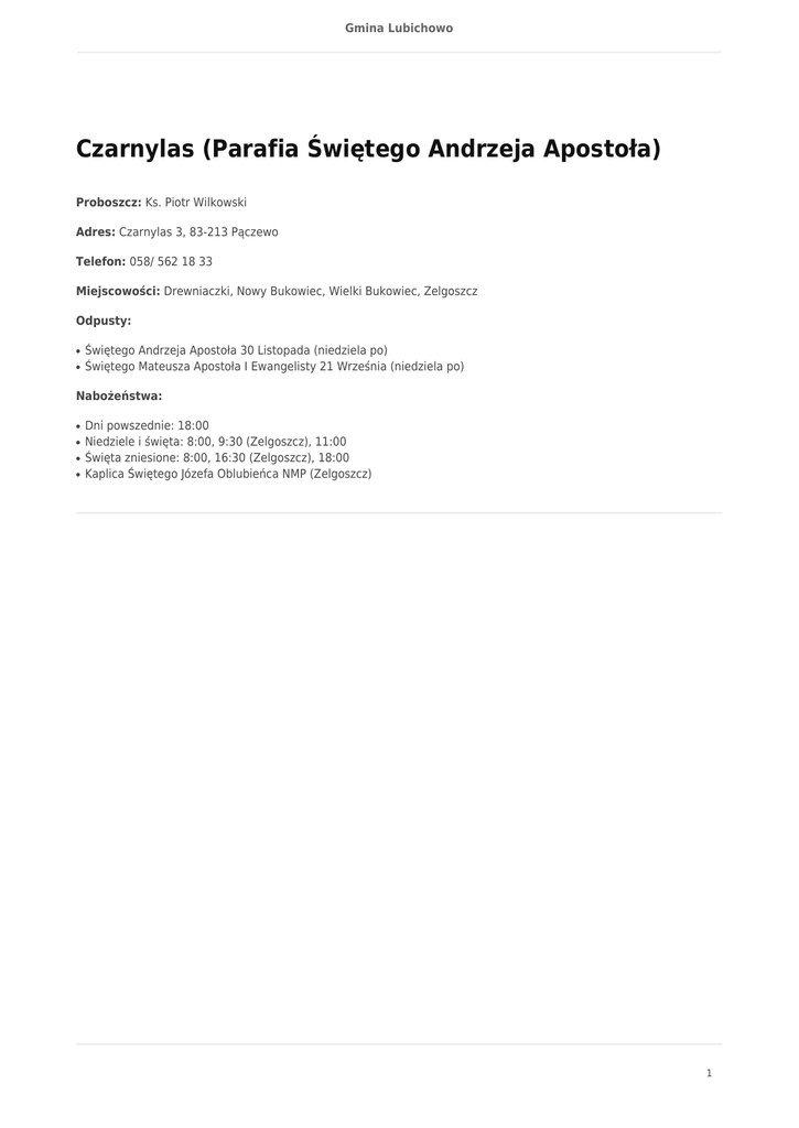 Gmina Lubichowo Czarnylas (Parafia Świętego Andrzeja Apostoła) Proboszcz: Ks. Piotr Wilkowski Adres: Czarnylas 3, 83-213 Pączewo Telefon: 058/ 562 18 33 Miejscowości: Drewniaczki, Nowy Bukowiec, Wielki Bukowiec, Zelgoszcz Odpusty: ● ● Świętego Andrzeja Apostoła 30 Listopada (niedziela po) Świętego Mateusza Apostoła I Ewangelisty 21 Września (niedziela po) Nabożeństwa: ● ● ● ● Dni powszednie: 18:00 Niedziele i święta: 8:00, 9:30 (Zelgoszcz), 11:00 Święta zniesione: 8:00, 16:30 (Zelgoszcz), 18:00 Kaplica Świętego Józefa Oblubieńca NMP (Zelgoszcz) 1