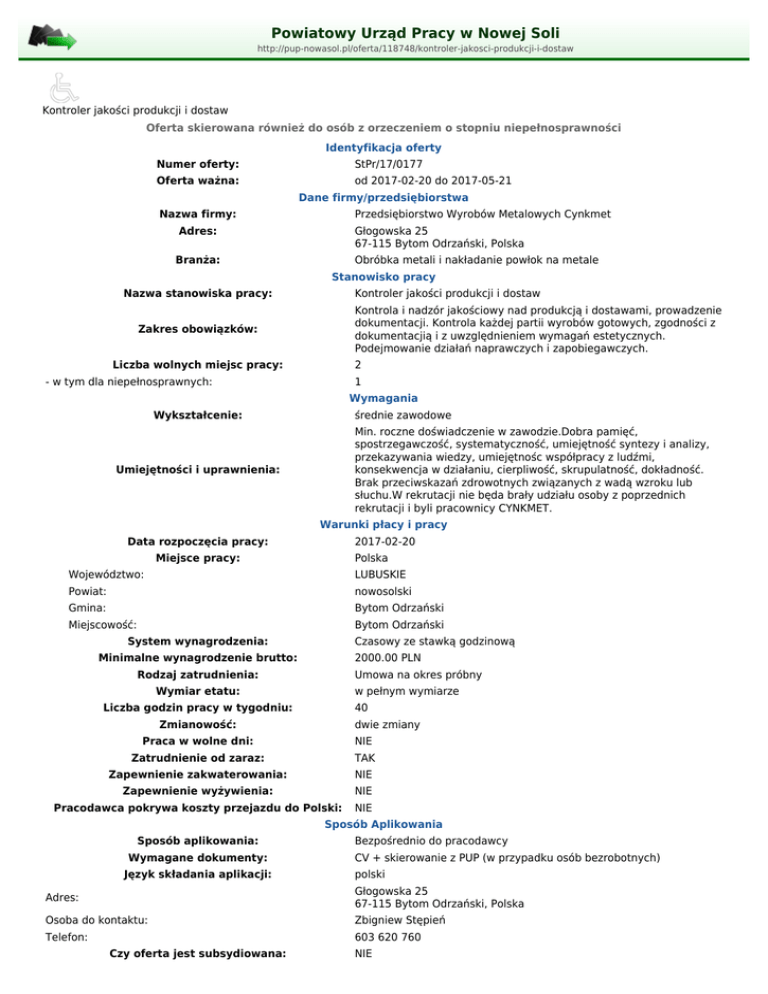 Powiatowy Urząd Pracy w Nowej Soli http://pup-nowasol.pl/oferta/118748/kontroler-jakosci-produkcji-i-dostaw Kontroler jakości produkcji i dostaw Oferta skierowana również do osób z orzeczeniem o stopniu niepełnosprawności Identyfikacja oferty Numer oferty: StPr/17/0177 Oferta ważna: od 2017-02-20 do 2017-05-21 Dane firmy/przedsiębiorstwa Nazwa firmy: Przedsiębiorstwo Wyrobów Metalowych Cynkmet Adres: Głogowska 25 67-115 Bytom Odrzański, Polska Branża: Obróbka metali i nakładanie powłok na metale Stanowisko pracy Nazwa stanowiska pracy: Kontroler jakości produkcji i dostaw Kontrola i nadzór jakościowy nad produkcją i dostawami, prowadzenie dokumentacji. Kontrola każdej partii wyrobów gotowych, zgodności z dokumentacjią i z uwzględnieniem wymagań estetycznych. Podejmowanie działań naprawczych i zapobiegawczych. Zakres obowiązków: Liczba wolnych miejsc pracy: 2 - w tym dla niepełnosprawnych: 1 Wymagania Wykształcenie: średnie zawodowe Min. roczne doświadczenie w zawodzie.Dobra pamięć, spostrzegawczość, systematyczność, umiejętność syntezy i analizy, przekazywania wiedzy, umiejętnośc współpracy z ludźmi, konsekwencja w działaniu, cierpliwość, skrupulatność, dokładność. Brak przeciwskazań zdrowotnych związanych z wadą wzroku lub słuchu.W rekrutacji nie będa brały udziału osoby z poprzednich rekrutacji i byli pracownicy CYNKMET. Umiejętności i uprawnienia: Warunki płacy i pracy Data rozpoczęcia pracy: 2017-02-20 Miejsce pracy: Polska Województwo: LUBUSKIE Powiat: nowosolski Gmina: Bytom Odrzański Miejscowość: Bytom Odrzański System wynagrodzenia: Czasowy ze stawką godzinową Minimalne wynagrodzenie brutto: 2000.00 PLN Rodzaj zatrudnienia: Umowa na okres próbny Wymiar etatu: w pełnym wymiarze Liczba godzin pracy w tygodniu: 40 Zmianowość: dwie zmiany Praca w wolne dni: NIE Zatrudnienie od zaraz: TAK Zapewnienie zakwaterowania: NIE Zapewnienie wyżywienia: NIE Pracodawca pokrywa koszty przejazdu do Polski: NIE Sposób Aplikowania Sposób aplikowania: Wymagane dokumenty: Język składania aplikacji: Bezpośrednio do pracodawcy CV + skierowanie z PUP (w przypadku osób bezrobotnych) polski Adres: Głogowska 25 67-115 Bytom Odrzański, Polska Osoba do kontaktu: Zbigniew Stępień Telefon: 603 620 760 Czy oferta jest subsydiowana: NIE Czy oferta jest finansowana z PFRON: NIE Upowszechnienie krajowej oferty pracy na terenie NIE państw EOG: