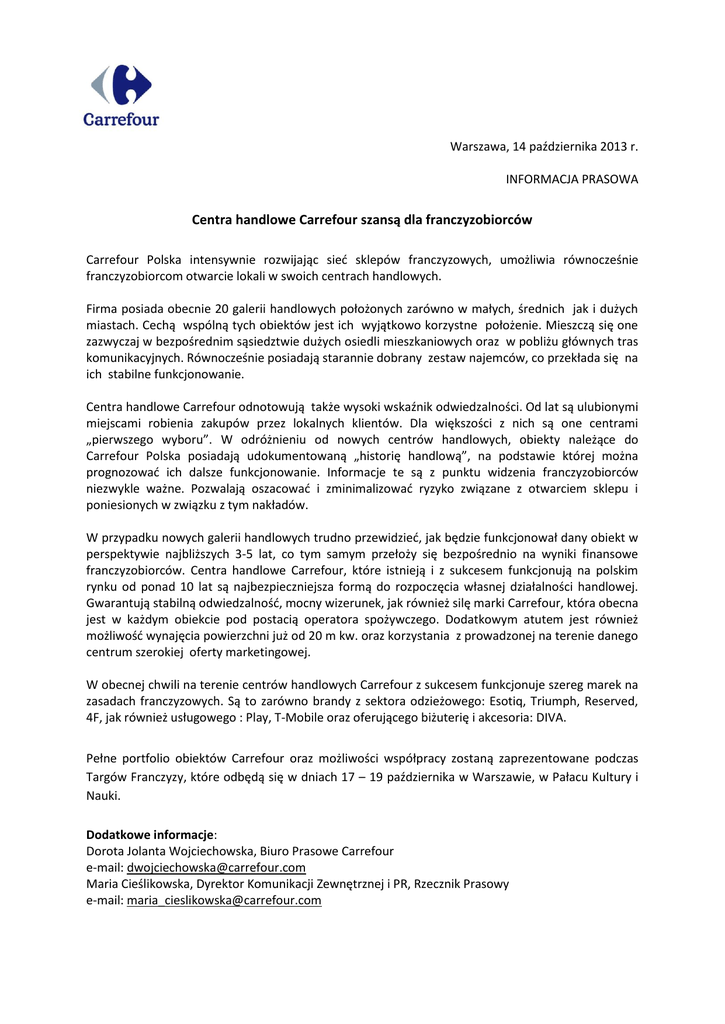 Warszawa, 14 października 2013 r. INFORMACJA PRASOWA Centra handlowe Carrefour szansą dla franczyzobiorców Carrefour Polska intensywnie rozwijając sieć sklepów franczyzowych, umożliwia równocześnie franczyzobiorcom otwarcie lokali w swoich centrach handlowych. Firma posiada obecnie 20 galerii handlowych położonych zarówno w małych, średnich jak i dużych miastach. Cechą wspólną tych obiektów jest ich wyjątkowo korzystne położenie. Mieszczą się one zazwyczaj w bezpośrednim sąsiedztwie dużych osiedli mieszkaniowych oraz w pobliżu głównych tras komunikacyjnych. Równocześnie posiadają starannie dobrany zestaw najemców, co przekłada się na ich stabilne funkcjonowanie. Centra handlowe Carrefour odnotowują także wysoki wskaźnik odwiedzalności. Od lat są ulubionymi miejscami robienia zakupów przez lokalnych klientów. Dla większości z nich są one centrami „pierwszego wyboru”. W odróżnieniu od nowych centrów handlowych, obiekty należące do Carrefour Polska posiadają udokumentowaną „historię handlową”, na podstawie której można prognozować ich dalsze funkcjonowanie. Informacje te są z punktu widzenia franczyzobiorców niezwykle ważne. Pozwalają oszacować i zminimalizować ryzyko związane z otwarciem sklepu i poniesionych w związku z tym nakładów. W przypadku nowych galerii handlowych trudno przewidzieć, jak będzie funkcjonował dany obiekt w perspektywie najbliższych 3-5 lat, co tym samym przełoży się bezpośrednio na wyniki finansowe franczyzobiorców. Centra handlowe Carrefour, które istnieją i z sukcesem funkcjonują na polskim rynku od ponad 10 lat są najbezpieczniejsza formą do rozpoczęcia własnej działalności handlowej. Gwarantują stabilną odwiedzalność, mocny wizerunek, jak również silę marki Carrefour, która obecna jest w każdym obiekcie pod postacią operatora spożywczego. Dodatkowym atutem jest również możliwość wynajęcia powierzchni już od 20 m kw. oraz korzystania z prowadzonej na terenie danego centrum szerokiej oferty marketingowej. W obecnej chwili na terenie centrów handlowych Carrefour z sukcesem funkcjonuje szereg marek na zasadach franczyzowych. Są to zarówno brandy z sektora odzieżowego: Esotiq, Triumph, Reserved, 4F, jak również usługowego : Play, T-Mobile oraz oferującego biżuterię i akcesoria: DIVA. Pełne portfolio obiektów Carrefour oraz możliwości współpracy zostaną zaprezentowane podczas Targów Franczyzy, które odbędą się w dniach 17 – 19 października w Warszawie, w Pałacu Kultury i Nauki. Dodatkowe informacje: Dorota Jolanta Wojciechowska, Biuro Prasowe Carrefour e-mail: [email protected] Maria Cieślikowska, Dyrektor Komunikacji Zewnętrznej i PR, Rzecznik Prasowy e-mail: [email protected]