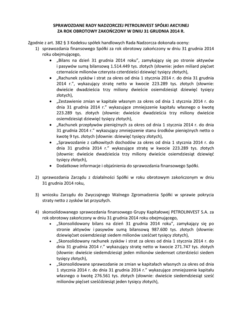 SPRAWOZDANE RADY NADZORCZEJ PETROLINVEST SPÓŁKI AKCYJNEJ ZA ROK OBROTOWY ZAKOŃCZONY W DNIU 31 GRUDNIA 2014 R. Zgodnie z art. 382 § 3 Kodeksu spółek handlowych Rada Nadzorcza dokonała oceny: 1) sprawozdania finansowego Spółki za rok obrotowy zakończony w dniu 31 grudnia 2014 roku obejmującego, „Bilans na dzień 31 grudnia 2014 roku”, zamykający się po stronie aktywów i pasywów sumą bilansową 1.514.449 tys. złotych (słownie: jeden miliard pięćset czternaście milionów czterysta czterdzieści dziewięć tysięcy złotych), „Rachunek zysków i strat za okres od dnia 1 stycznia 2014 r. do dnia 31 grudnia 2014 r.”, wykazujący stratę netto w kwocie 223.289 tys. złotych (słownie: dwieście dwadzieścia trzy miliony dwieście osiemdziesiąt dziewięć tysięcy złotych), „Zestawienie zmian w kapitale własnym za okres od dnia 1 stycznia 2014 r. do dnia 31 grudnia 2014 r.” wykazujące zmniejszenie kapitału własnego o kwotę 223.289 tys. złotych (słownie: dwieście dwadzieścia trzy miliony dwieście osiemdziesiąt dziewięć tysięcy złotych), „Rachunek przepływów pieniężnych za okres od dnia 1 stycznia 2014 r. do dnia 31 grudnia 2014 r.” wykazujący zmniejszenie stanu środków pieniężnych netto o kwotę 9 tys. złotych (słownie: dziewięć tysięcy złotych), „Sprawozdanie z całkowitych dochodów za okres od dnia 1 stycznia 2014 r. do dnia 31 grudnia 2014 r.” wykazujące stratę w kwocie 223.289 tys. złotych (słownie: dwieście dwadzieścia trzy miliony dwieście osiemdziesiąt dziewięć tysięcy złotych), Dodatkowe informacje i objaśnienia do sprawozdania finansowego Spółki. 2) sprawozdania Zarządu z działalności Spółki w roku obrotowym zakończonym w dniu 31 grudnia 2014 roku, 3) wniosku Zarządu do Zwyczajnego Walnego Zgromadzenia Spółki w sprawie pokrycia straty netto z zysków lat przyszłych. 4) skonsolidowanego sprawozdania finansowego Grupy Kapitałowej PETROLINVEST S.A. za rok obrotowy zakończony w dniu 31 grudnia 2014 roku obejmującego, „Skonsolidowany bilans na dzień 31 grudnia 2014 roku”, zamykający się po stronie aktywów i pasywów sumą bilansową 987.600 tys. złotych (słownie: dziewięćset osiemdziesiąt siedem milionów sześćset tysięcy złotych), „Skonsolidowany rachunek zysków i strat za okres od dnia 1 stycznia 2014 r. do dnia 31 grudnia 2014 r.” wykazujący stratę netto w kwocie 271.747 tys. złotych (słownie: dwieście siedemdziesiąt jeden milionów siedemset czterdzieści siedem tysięcy złotych), „Skonsolidowane sprawozdanie ze zmian w kapitałach własnych za okres od dnia 1 stycznia 2014 r. do dnia 31 grudnia 2014 r.” wykazujące zmniejszenie kapitału własnego o kwotę 276.561 tys. złotych (słownie: dwieście siedemdziesiąt sześć milionów pięćset sześćdziesiąt jeden tysięcy złotych), „Skonsolidowany rachunek przepływów pieniężnych za okres od dnia 1 stycznia 2014 r. do dnia 31 grudnia 2014 r.” wykazujący zwiększenie stanu środków pieniężnych netto o kwotę 227 tys. złotych (słownie: dwieście dwadzieścia siedem tysięcy złotych), „Skonsolidowane sprawozdanie z całkowitych dochodów za okres od dnia 1 stycznia 2014 r. do dnia 31 grudnia 2014 r.” wykazujące całkowitą stratę w kwocie 276.561 tys. złotych (słownie: dwieście siedemdziesiąt sześć milionów pięćset sześćdziesiąt jeden tysięcy złotych), Dodatkowe informacje i objaśnienia do skonsolidowanego sprawozdania finansowego Grupy Kapitałowej PETROLINVEST S.A. 5) sprawozdania Zarządu z działalności Grupy Kapitałowej PETROLINVEST S.A. w roku obrotowym zakończonym w dniu 31 grudnia 2014 roku. Dokonując oceny sprawozdań oraz wniosku, o których mowa powyżej, Rada Nadzorcza korzystała w szczególności ze stanowiska biegłego rewidenta wyznaczonego do badania sprawozdania finansowego Spółki i Grupy Kapitałowej PETROLINVEST S.A. za rok 2014 (zwanej dalej „Biegłym Rewidentem”). Badanie Biegłego Rewidenta obejmowało sprawdzenie poprawności zastosowanych przez Spółkę zasad rachunkowości i znaczących szacunków, sprawdzenie dowodów księgowych, z których wynikają liczby i informacje zawarte w sprawozdaniu finansowym, jak i całościową ocenę sprawozdania finansowego. Biegły Rewident, po zapoznaniu się ze zidentyfikowanymi przez Zarząd w sprawozdaniach finansowych czynnikami stwarzającymi potencjalne zagrożenia kontynuacji działalności oraz podjętymi przez Zarząd działaniami mającymi na celu ich eliminację, uznał, że przedstawione przez Zarząd dowody dotyczące możliwości spłaty, bądź restrukturyzacji przeterminowanego zadłużenia Spółki i Grupy Kapitałowej oraz planów pozyskania finansowania, są niewystarczające do stwierdzenia możliwości kontynuacji działalności i tym samym wydania opinii o badanych sprawozdaniach finansowych Spółki i Grupy za rok 2014. Rada Nadzorcza zwraca uwagę, że Biegły Rewident w wydanym stanowisku z przeprowadzonego badania zwrócił uwagę na następujące kwestie: 1) Na dzień wydania stanowiska Spółka nie dysponowała zawartymi umowami potwierdzającymi możliwość uzyskania znaczącego finansowania zewnętrznego, które pozwoli na prowadzenie dalszej działalności poszukiwawczej oraz wypełnienie zobowiązań koncesyjnych. Zarząd Spółki wskazał, że jest w trakcie (i) zamknięcia i rozliczenia sprzedaży udziałów w TOO Emba Jug Nieft, z której to transakcji wpływy, zgodnie z zawartymi z nabywcą umowami oraz uzgodnieniem z instytucjami finansowymi, stanowić mają częściowe źródło spłaty kredytów, (ii negocjacji w celu uzgodnienia nowego harmonogramu spłaty kredytów oraz (iii) prowadzenia rozmów z potencjalnymi inwestorami mającymi na celu podjęcie współpracy przy realizacji projektu poszukiwawczo – wydobywczego na Kontrakcie OTG. Zobowiązanie krótkoterminowe Spółki przekraczają wartość aktywów krótkoterminowych o kwotę 346.678 tys. złotych na