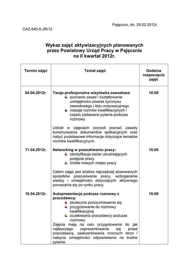 Pajęczno, dn. 29.02.2012r. CAZ-540-5-JR/12 Wykaz zajęć aktywizacyjnych planowanych przez Powiatowy Urząd Pracy w Pajęcznie na II kwartał 2012r. Termin zajęć 04.04.2012r. Temat zajęć Twoja profesjonalna wizytówka zawodowa: poznanie zasad i kształtowanie umiejętności pisania życiorysu zawodowego i listu motywacyjnego rodzaje rozmów kwalifikacyjnych i często zadawane pytania podczas rozmowy Godzina rozpoczęcia zajęć 10:00 Udział w zajęciach pozwoli poznać zasady konstruowania dokumentów aplikacyjnych oraz nabyć podstawowe informacje dotyczące tematów rozmów kwalifikacyjnych. 11.04.2012r. Networking w poszukiwaniu pracy: identyfikacja barier utrudniających podjęcie pracy źródła nowych miejsc pracy 10:00 Celem zajęć jest analiza najczęściej stosowanych sposobów poszukiwania pracy, wzbogacenie wiedzy i umiejętności dotyczących aktywnego poruszania się po rynku pracy. 18.04.2012r. Autoprezentacja podczas rozmowy z pracodawcą: skuteczne porozumiewanie się przygotowanie do rozmowy kwalifikacyjnej oczekiwania pracodawcy podczas rozmowy Zajęcia mają na celu przygotowanie do jak najlepszego zaprezentowania się przed pracodawcą, zaakcentowania mocnych stron i nabycia umiejętności odpowiadania na trudne pytania. 10:00 25.04.2012r. Metody aktywnego działania na rynku pracy – poszukuję zatrudnienia: metody poszukiwania pracy analiza lokalnego rynku pracy plan działań w zakresie poszukiwania pracy 10:00 Uczestnicy zajęć poznają metody poszukiwania zatrudnienia oraz uzyskają informacje o tym jak dotrzeć do informacji o wolnych miejscach pracy. 09.05.2012r. Twoja profesjonalna wizytówka zawodowa: poznanie zasad i kształtowanie umiejętności pisania życiorysu zawodowego i listu motywacyjnego rodzaje rozmów kwalifikacyjnych i często zadawane pytania podczas rozmowy 10:00 Udział w zajęciach pozwoli poznać zasady konstruowania dokumentów aplikacyjnych oraz nabyć podstawowe informacje dotyczące tematów rozmów kwalifikacyjnych. 16.05.2012r. Aktywny i efektywny poszukujący pracy: poszukiwanie pracy jako zaplanowany proces postawa aktywna w poszukiwaniu pracy 10:00 Uczestnicy nauczą się technik znajdowania ofert pracy oraz uświadomią sobie fakt zastąpienia postawy biernej, aktywnością i samodzielnością. 23.05.2012r. Pokonać trudności: identyfikacja trudnych sytuacji oraz sposoby jak je pokonać czym jest stres , metody walki z nim Udział w zajęciach pozwoli zidentyfikować reakcje na trudne sytuacje, zmienić sposób myślenia o sytuacji utraty pracy oraz określi sposób radzenia sobie w trudnych sytuacjach życiowych. 10:00 30.05.2012r. Kompetencja i aktywność w poruszaniu się po rynku pracy: jak skutecznie poruszać się po rynku pracy metody poszukiwania pracy zasady skutecznego dialogu z pracodawcą 10:00 Zajęcia maja na celu przygotowanie uczestników do aktywnego poruszania się po współczesnym rynku pracy oraz do rozmowy kwalifikacyjnej. 06.06.2012r. Twoja profesjonalna wizytówka zawodowa: poznanie zasad i kształtowanie umiejętności pisania życiorysu zawodowego i listu motywacyjnego rodzaje rozmów kwalifikacyjnych i często zadawane pytania podczas rozmowy 10:00 Udział w zajęciach pozwoli poznać zasady konstruowania dokumentów aplikacyjnych oraz nabyć podstawowe informacje na temat rozmów kwalifikacyjnych. 13.06.2012r. Poznanie zasad komunikacji werbalnej i niewerbalnej podczas rozmowy kwalifikacyjnej: komunikacja werbalna i niewerbalna bariery w komunikowaniu się unikanie niepowodzeń w kontaktach interpersonalnych 10:00 Zajęcia mają na celu poszerzenie wiedzy dotyczącej komunikacji werbalnej i niewerbalnej. Uczestnicy zostaną przygotowani do prezentowania własnych umiejętności, możliwości i wiedzy. Osoby zainteresowane udziałem w poszczególnych zajęciach proszone są o zgłaszanie się najpóźniej 7 dni przed planowanym terminem zajęć do lidera Klubu Pracy osobiście w pokoju numer 107 w siedzibie Powiatowego Urzędu Pracy w Pajęcznie.