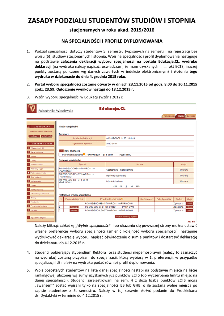 ZASADY PODZIAŁU STUDENTÓW STUDIÓW I STOPNIA stacjonarnych w roku akad. 2015/2016 NA SPECJALNOŚCI I PROFILE DYPLOMOWANIA 1. Podział specjalności dotyczy studentów 5. semestru [wpisanych na semestr i na rejestracji bez wpisu (5)] studiów stacjonarnych I stopnia. Wpis na specjalność i profil dyplomowania następuje na podstawie założenia deklaracji wyboru specjalności na portalu Edukacja.CL, wydruku deklaracji (na wydruku należy napisać: oświadczam, że mam uzyskanych …….. pkt ECTS, inaczej punkty zostaną policzone wg danych zawartych w indeksie elektronicznym) i złożenia tego wydruku w dziekanacie do dnia 4. grudnia 2015 roku. 2. Portal wyboru specjalności zostanie otwarty w dniach 23.11.2015 od godz. 8.00 do 30.11.2015 godz. 23.59. Ogłoszenie wyników nastąpi do 18.12.2015 r. 3. Wzór wyboru specjalności w Edukacji (wzór z 2012): Należy kliknąć zakładkę „Wybór specjalności” i po ukazaniu się powyższej strony można ustawić własne preferencje wyboru specjalności (zmienić kolejność wyboru specjalności), następnie wydrukować deklarację wyboru, napisać oświadczenie o sumie punktów i dostarczyć deklarację do dziekanatu do 4.12.2015 r. 4. Studenci pobierający stypendium Rektora oraz studenci niepełnosprawni (należy to zaznaczyć na wydruku) zostaną przypisani do specjalizacji, którą wybiorą w 1. preferencji, w przypadku specjalizacji ILB należy na wydruku podać również profil dyplomowania. 5. Wpis pozostałych studentów na listę danej specjalności nastąpi na podstawie miejsca na liście rankingowej ułożonej wg sumy uzyskanych już punktów ECTS (do wyczerpania limitu miejsc na danej specjalności). Studenci zarejestrowani na sem. 4 z dużą liczbą punktów ECTS mogą „awansem” zostać wpisani tylko na specjalności ILB lub GHB, o ile zostaną wolne miejsca po zapisie studentów z 5. semestru. Należy w tej sprawie złożyć podanie do Prodziekana ds. Dydaktyki w terminie do 4.12.2015 r. 6. Przy braku miejsc na podanych przez studenta preferencjach z 1-ej lub 2-ej kolejności wyboru, Dziekan może wpisać studenta „ z urzędu” na specjalność , na której są wolne miejsca. 7. Przed rozpoczęciem zapisów na zajęcia semestru letniego studenci zostaną przypięci do właściwej wiązki – przedmiotu kształcenia (planu studiów) w systemie EDUKACJA.CL. Studenci, zarejestrowani na sem. 5, którzy nie złożą w dziekanacie wydruku wniosku wyboru specjalności mogą być wpisani na specjalność przez Dziekana „z urzędu”, tam gdzie będą wolne miejsca. 8. Dla specjalności Inżynieria Lądowa (ILB) podział na profile dyplomowania następuje poprzez zapis na właściwy przedmiot wybieralny (zajęcia projektowe oraz wykład): – profil dyplomowania Inżynieria miejska i budownictwo podziemne (IM) ILB004616W Budownictwo podziemne – profil dyplomowania Drogi (D) ILB003816W Technologia budowy dróg – profil dyplomowania Mosty (M) ILB004816W Technologia budowy mostów – profil dyplomowania Drogi kolejowe (DK) ILB004016W Koleje miejskie Student rozpoczynając zapisy na tej specjalności powinien zapisać się najpierw na jeden z podanych powyżej przedmiotów (wykład i projekt/laboratorium), ustalając tym samym profil dyplomowania (gdy na projekcie/laboratorium z danego przedmiotu nie ma już miejsc należy wybrać inny profil dyplomowania), a dopiero później na inne przedmioty wspólne dla całego kierunku (Fizyka budowli, Organizacja produkcji budowlanej i kierowanie procesami inwestycyjnymi, Ekonomika budownictwa, Instalacje elektryczne, Instalacje sanitarne) oraz na pozostałe przedmioty dla danej specjalności (na specjalności IBB należy wybrać jeden z przedmiotów wybieralnych, gdy na nim już brak miejsc to należy wybrać inny przedmiot, na którym są wolne miejsca). Studenci pobierający stypendia Rektora i studenci niepełnosprawni ze specjalności ILB zostaną wpisani na przedmiot profilujący administracyjnie przed otwarciem zapisów internetowych (na wydruku podać profil np. ILB/IM) – na pozostałe przedmioty muszą zapisać się sami. 9. W roku akademickim 2015/2016 planowana liczba miejsc na specjalnościach/profilach dyplomowania wynosi łącznie 320. Podział tej liczby na specjalności i profile dyplomowania jest następujący: - Inżynieria budowlana 150 miejsc - Geotechnika i Hydrotechnika 50 miejsc - Inżynieria Lądowa 120 miejsc (po 30 na każdym profilu dyplomowania) Studenci, którzy są na rejestracji bez wpisu (5) i wybierali już specjalność w ubiegłym roku oraz mają ją przypisaną w Edukacji.CL nie dokonują już wyboru specjalności . 10. Zaleca się studentom przed wyborem specjalności zapoznanie się z zasadami blokowania przedmiotów na danej specjalności, aby później nie tłumaczyli się, że nie wiedzieli, że będą mieli zablokowany wpis na przedmioty specjalnościowe (dotyczy zwłaszcza spec. IBB). Prodziekan ds. Dydaktyki dr inż. Andrzej Batog 7.11.2015