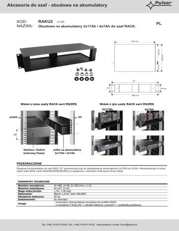 Pulsar Akcesoria do szaf - obudowa na akumulatory KOD: NAZWA: RAKU2 v1.0/I PL Obudowa na akumulatory 2x17Ah / 4x7Ah do szaf RACK. 120 mm 60 mm 180 mm 430 mm 19" 2U 90 mm 485 mm Widok z boku szafy RACK serii RS/ZRS Widok z tyłu szafy RACK serii RS/ZRS 2x17Ah 4x7Ah tył przód 2U Zasilacz / Switch buforowy Pulsar półka na akumulatory 2x17Ah / 4x7Ah PRZEZNACZENIE Obudowa na akumulatory do szaf RACK 19" przeznaczona jest do zainstalowania akumulatorów 2x17Ah lub 4x7Ah. Montowana jest w tylnej części szafy RACK (seria RWA/RW/RWD/RS/ZRS) za zasilaczami i switchami buforowymi firmy Pulsar. PARAMETRY TECHNICZNE Wymiary zewnętrzne: Wymiary montażowe: Waga netto/brutto: Wykonanie: Obciążenie statyczne: Zastosowanie: Uwagi: W=485, H=90, D=180 [mm, +/-2] W=19’’, H=2U 1,76 / 1,90 [kg] Blacha 1,2mm kolor RAL9004 60 kg do wewnątrz - mocowanie czteropunktowe doczołowe do profilów RACK - w komplecie 4 śruby M6 + nakrętki klatkowe („koszyki”) + podkładka plastikowa Tel. (+48) 14-610-19-40, Fax. (+48) 14-610-19-50, www.pulsar.pl, e-mail: [email protected] ®
