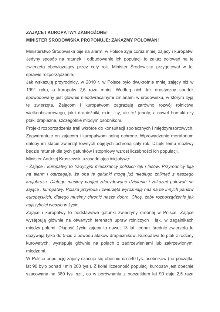 ZAJĄCE I KUROPATWY ZAGROŻONE! MINISTER ŚRODOWISKA PROPONUJE: ZAKAŻMY POLOWAŃ! Ministerstwo Środowiska bije na alarm: w Polsce żyje coraz mniej zajęcy i kuropatw! Jedyny sposób na ratunek i odbudowanie ich populacji to zakaz polowań na te zwierzęta obowiązujący przez cały rok. Minister Środowiska przygotował w tej sprawie rozporządzenie. Jak wskazują przyrodnicy, w 2010 r. w Polsce było dwukrotnie mniej zajęcy niż w 1991 roku, a kuropatw 2,5 raza mniej! Według nich tak drastyczny spadek spowodowany jest głównie nieodwracalnymi zmianami w środowisku, w którym żyją te zwierzęta. Zającom i kuropatwom zagrażają zarówno rozwój rolnictwa wielkoobszarowego, jak i drapieżniki, m.in. lisy, ale też jenoty, a nawet borsuki czy ptaki drapieżne, szczególnie młodym osobnikom. Projekt rozporządzenia trafi wkrótce do konsultacji społecznych i międzyresortowych. Zagwarantuje on zającom i kuropatwom pełną ochronę. Wprowadzenie moratorium dałoby im status zwierząt łownych objętych ochroną cały rok. Dzięki temu możliwy będzie ratunek dla tych gatunków i stopniowy wzrost liczebności ich populacji. Minister Andrzej Kraszewski uzasadniając inicjatywę: - Zające i kuropatwy to tradycyjni mieszkańcy polskich łąk i lasów. Przyrodnicy biją na alarm i ostrzegają, że oba te gatunki mogą już niedługo zniknąć z naszego krajobrazu. Dlatego musimy podjąć zdecydowane działania i zakazać polowań na zające i kuropatwy. Polska przyroda i zwierzęta wyróżniają nas na tle innych państw europejskich, dlatego musimy chronić nasze dobro. Chcę, żeby rozporządzenie jak najszybciej weszło w życie. Zające i kuropatwy to podstawowe gatunki zwierzyny drobnej w Polsce. Zające występują głównie na otwartych terenach upraw rolniczych i łąk, w zagajnikach między polami. Długość życia zająca to nawet 13 lat, jednak średnio zwierzęta te dożywają tylko do 5-ciu z powodu ataków drapieżników. Kuropatwa to ptak z rodziny kurowatych, występuje głównie na polach z zadrzewieniami lub zakrzewionymi miedzami. W Polsce populację zajęcy szacuje się obecnie na 540 tys. osobników (na początku lat 90 było ponad 1mln 200 tys.). Z kolei liczebność populacji kuropatw jest obecnie szacowana na 380 tys. szt., co w porównaniu z początkiem lat 90 daje 2,5 raza mniejszą liczbę osobników. W 2009 r. myśliwi pozyskali 19 tys. zajęcy i 11 tys. kuropatw. Dotychczas podejmowane działania, polegające m.in. na próbach ograniczenia liczebności populacji lisa, co doprowadziłoby do zwiększenia liczebności zajęcy i kuropatw, nie przyniosły spodziewanych rezultatów. Kiedy zającom i kuropatwom grozi całkowite zniknięcie z polskich lasów i łąk, ich śmiertelny wróg: lis, ma się coraz lepiej. Liczebność tego gatunku regularnie wzrasta. Zgodnie z rocznikiem statystycznym GUS „Leśnictwo 2008” liczebność populacji lisów w Polsce w 2000 r. wynosiła 145 tys. szt., a w 2008 r. ich liczba wzrosła już do 209 tys. szt. Do takiego stanu rzeczy przyczyniło się m.in. masowe zwalczanie wścieklizny, które spowodowało prawdziwą eksplozję liczebności tego gatunku. Nowe rozporządzenie zmieniłoby obowiązujące na mocy rozporządzenia Ministra Środowiska z 16 marca 2005 r. w sprawie określenia okresów polowań na zwierzęta łowne (Dz. U. Nr 48, poz. 459 i Nr 163, poz. 1303) przepisy o dozwolonym polowaniu na zające i kuropatwy. Minister środowiska, działając w porozumieniu z ministrem właściwym do spraw rolnictwa jest uprawniony do określenia w drodze rozporządzenia okresów polowań na zwierzęta łowne (po zasięgnięciu opinii Państwowej Rady Ochrony Przyrody oraz Polskiego Związku Łowieckiego) na podstawie Prawa łowieckiego (art. 44 ust.1 ustawy z 13 października 1995 r. Prawo łowieckie, Dz. U. z 2005 r. Nr 127, poz. 1066, z późn. zm). W Polsce jest 31 gatunków zwierząt łownych. Moratorium na polowania obowiązuje w odniesieniu do łosia. Źródło: mos.gov.pl