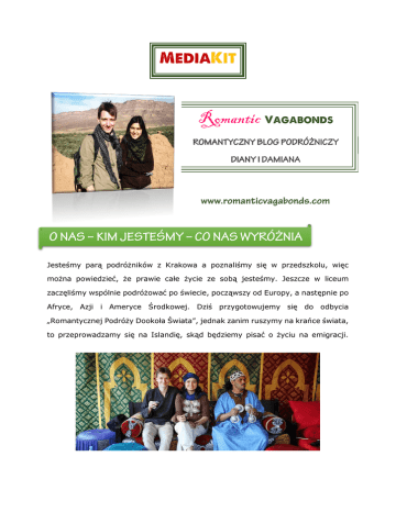Romantic Jesteśmy parą podróżników z Krakowa a poznaliśmy się w przedszkolu, więc można powiedzieć, że prawie całe życie ze sobą jesteśmy. Jeszcze w liceum zaczęliśmy wspólnie podróżować po świecie, począwszy od Europy, a następnie po Afryce, Azji i Ameryce Środkowej. Dziś przygotowujemy się do odbycia „Romantycznej Podróży Dookoła Świata”, jednak zanim ruszymy na krańce świata, to przeprowadzamy się na Islandię, skąd będziemy pisać o życiu na emigracji. DIANA DEMI MARSZEWSKA – podróżniczka, wokalistka muzyki świata i tancerka. Vlogerka podróżniczo-lifestylowa oraz prowadząca kanał Nauka Japońskiego na YouTube, na którym uczy języka Kraju Kwitnącej Wiśni oraz opowiada o Japonii. Absolwentka Turystyki Uzdrowiskowej na AGH w Krakowie. DAMIAN CH. KURACIŃSKI – złota rączka do wszystkiego. Lubi rozkładać każdą rzecz na czynniki pierwsze – umysł ścisły. Zafascynowany chemią, marzy o własnym laboratorium, ale prawdopodobnie i tak będzie pracować jako informatyk i człowiek od zadań specjalnych. Jego największym marzeniem jest odbycie podróży wokół globu śladami wielkich podróżników i odkrywców. RomanticVagabonds.com to romantyczny blog przygodowy, na którym relacjonujemy nasze podróże z dużą dawką dobrej fotografii oraz filmów. Piszemy o podróżach niskobudżetowych, samodzielnych z plecakiem, blisko ludzi i z szacunkiem do przyrody. Nasz blog powstał w styczniu 2016 roku a został on przekształcony z wcześniejszego bloga podróżniczego, którego prowadziła Diana od roku 2009. Został on wyróżniony, w kategorii najlepszych polskich blogów prowadzonych przez niezwykłe kobiety. Oprócz bloga prowadzimy również kanał podróżniczy na YouTube, który z dnia na dzień cieszy się coraz większą popularnością. Wrzucamy vlogi z podróży, filmy poradnikowe, a od sierpnia 2016 roku również emigracyjne z Islandii. zrecenzowanie produktu Twojej firmy w formie wpisu na blogu i/lub filmu na YouTube oraz jego promocja w mediach społecznościowych napisanie artykułu do gazety, magazynu, portalu internetowego lub na bloga (tematyka podróżnicza i podróżniczo-lifestylowa) nawiązanie współpracy partnerskiej z organizacjami turystycznymi, hotelami, restauracjami, itp. poprowadzenie eventu podróżniczego przygotowanie prezentacji z naszych podróży lub na dowolny temat związany z podróżami, kulturą, religią, tradycjami, muzyką, itp. zorganizowanie konkursu przeprowadzenie sesji zdjęciowej Najlepszym sposobem na kontakt z nami jest napisanie do nas maila na adres: Odpowiemy najszybciej, jak to możliwe a na pewno nie będzie to później niż do tygodnia. Stan: kwiecień 2016