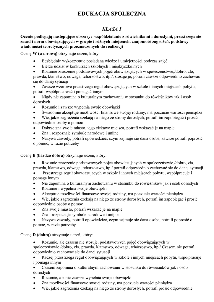 EDUKACJA SPOŁECZNA KLASA I Ocenie podlegają następujące obszary: współdziałanie z rówieśnikami i dorosłymi, przestrzeganie zasad i norm obowiązujących w grupie i różnych miejscach, znajomość zagrożeń, podstawy wiadomości teoretycznych przeznaczonych do realizacji Ocenę W (wzorową) otrzymuje uczeń, który: · Bezbłędnie wykorzystuje posiadaną wiedzę i umiejętności podczas zajęć · Bierze udział w konkursach szkolnych i międzyszkolnych · Rozumie znaczenie podstawowych pojęć obowiązujących w społeczeństwie,/dobro, zło, prawda, kłamstwo, odwaga, tchórzostwo, itp./, stosuje je, potrafi zawsze odpowiednio zachować się do danej sytuacji · Zawsze wzorowo przestrzega reguł obowiązujących w szkole i innych miejscach pobytu, potrafi współpracować i pomagać innym · Nigdy nie zapomina o kulturalnym zachowaniu w stosunku do rówieśników jak i osób dorosłych · Rozumie i zawsze wypełnia swoje obowiązki · Świadomie akceptuje możliwości finansowe swojej rodziny, ma poczucie wartości pieniądza · Wie, jakie zagrożenia czekają na niego ze strony dorosłych, potrafi im zapobiegać i prosić odpowiednie osoby o pomoc · Dobrze zna swoje miasto, jego ciekawe miejsca, potrafi wskazać je na mapie · Zna i rozpoznaje symbole narodowe i unijne · Nazywa zawody, potrafi opowiedzieć, czym zajmuje się dana osoba, zawsze potrafi poprosić o pomoc, w razie potrzeby Ocenę B (bardzo dobra) otrzymuje uczeń, który: · Rozumie znaczenie podstawowych pojęć obowiązujących w społeczeństwie,/dobro, zło, prawda, kłamstwo, odwaga, tchórzostwo, itp./ potrafi odpowiednio zachować się do danej sytuacji · Przestrzega reguł obowiązujących w szkole i innych miejscach pobytu, współpracuje i pomaga innym · Nie zapomina o kulturalnym zachowaniu w stosunku do rówieśników jak i osób dorosłych · Rozumie i wypełnia swoje obowiązki · Akceptuje możliwości finansowe swojej rodziny, ma poczucie wartości pieniądza · Wie, jakie zagrożenia czekają na niego ze strony dorosłych, potrafi im zapobiegać i prosić odpowiednie osoby o pomoc · Zna swoje miasto, potrafi wskazać je na mapie · Zna i rozpoznaje symbole narodowe i unijne · Nazywa zawody, potrafi opowiedzieć, czym zajmuje się dana osoba, potrafi poprosić o pomoc, w razie potrzeby Ocenę D (dobrą) otrzymuje uczeń, który: · Rozumie, ale czasem nie stosuje, podstawowych pojęć obowiązujących w społeczeństwie,/dobro, zło, prawda, kłamstwo, odwaga, tchórzostwo, itp./ Czasem nie potrafi odpowiednio zachować się do danej sytuacji · Raczej przestrzega reguł obowiązujących w szkole i innych miejscach pobytu, współpracuje i pomaga innym · Czasem zapomina o kulturalnym zachowaniu w stosunku do rówieśników jak i osób dorosłych · Rozumie, ale nie zawsze wypełnia swoje obowiązki · Zna możliwości finansowe swojej rodziny, ma poczucie wartości pieniądza · Wie, jakie zagrożenia czekają na niego ze strony dorosłych, potrafi prosić odpowiednie osoby o pomoc · Zna, że jego miejscowość to miasto, potrafi z pomocą wskazać je na mapie · Zna i rozpoznaje symbole narodowe i niektóre unijne · Nazywa zawody, potrafi opowiedzieć, czym zajmuje się dana osoba, potrafi poprosić o pomoc niektóre osoby, w razie potrzeby Ocenę P (przeciętną) otrzymuje uczeń, który: · Rozumie, ale rzadko stosuje, podstawowych pojęcia obowiązujące w społeczeństwie,/dobro, zło, prawda, kłamstwo, odwaga, tchórzostwo, itp./ Często nie potrafi odpowiednio zachować się w danej sytuacji · Raczej przestrzega reguł obowiązujących w szkole i innych miejscach pobytu, współpracuje i pomaga innym · Zapomina o kulturalnym zachowaniu w stosunku do rówieśników jak i osób dorosłych · Rozumie, ale nie zawsze wypełnia swoje obowiązki · Zna możliwości finansowe swojej rodziny, wie ile kosztują niektóre produkty · Zna niektóre zagrożenia ze strony dorosłych, czasem potrafi prosić odpowiednie osoby o pomoc · Zna, nazwę swojego miasta, orientuje się, gdzie leży · Zna i rozpoznaje niektóre symbole narodowe · Nazywa najczęściej spotykane zawody, potrafi opowiedzieć, czym zajmuje się dana osoba, Ocenę S (słabą) otrzymuje uczeń, który: · Rzadko stosuje, podstawowe pojęcia obowiązujące w społeczeństwie,/dobro, zło, prawda, kłamstwo, odwaga, tchórzostwo, itp./ Często nie potrafi odpowiednio zachować się w danej sytuacji · Rzadko przestrzega reguł obowiązujących w szkole i innych miejscach pobytu, niechętnie współpracuje i pomaga innym · Jego zachowaniu w stosunku do rówieśników jak i osób dorosłych jest mało kulturalne · Zna możliwości finansowe swojej rodziny, wie ile kosztują niektóre produkty · Nie zna zagrożenia ze strony dorosłych, czasem potrafi prosić odpowiednie osoby o pomoc · Wie, że mieszka w mieście · Rozpoznaje niektóre symbole narodowe · Nazywa niektóre zawody Ocenę N (negatywną) otrzymuje uczeń, który: · Nie opanował podstawowych wiadomości i umiejętności określonych programem nauczania · Nie bierze udziału w lekcjach · Nie wykonuje poleceń nauczyciela.