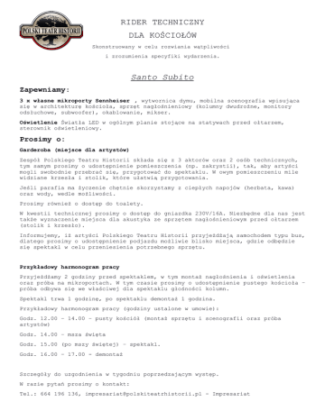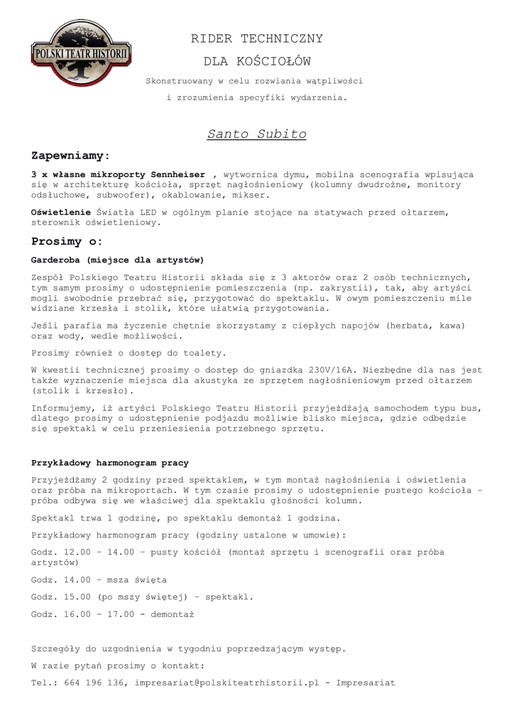 RIDER TECHNICZNY DLA KOŚCIOŁÓW Skonstruowany w celu rozwiania wątpliwości i zrozumienia specyfiki wydarzenia. Santo Subito Zapewniamy: 3 x własne mikroporty Sennheiser , wytwornica dymu, mobilna scenografia wpisująca się w architekturę kościoła, sprzęt nagłośnieniowy (kolumny dwudrożne, monitory odsłuchowe, subwoofer), okablowanie, mikser. Oświetlenie Światła LED w ogólnym planie stojące na statywach przed ołtarzem, sterownik oświetleniowy. Prosimy o: Garderoba (miejsce dla artystów) Zespół Polskiego Teatru Historii składa się z 3 aktorów oraz 2 osób technicznych, tym samym prosimy o udostępnienie pomieszczenia (np. zakrystii), tak, aby artyści mogli swobodnie przebrać się, przygotować do spektaklu. W owym pomieszczeniu mile widziane krzesła i stolik, które ułatwią przygotowania. Jeśli parafia ma życzenie chętnie skorzystamy z ciepłych napojów (herbata, kawa) oraz wody, wedle możliwości. Prosimy również o dostęp do toalety. W kwestii technicznej prosimy o dostęp do gniazdka 230V/16A. Niezbędne dla nas jest także wyznaczenie miejsca dla akustyka ze sprzętem nagłośnieniowym przed ołtarzem (stolik i krzesło). Informujemy, iż artyści Polskiego Teatru Historii przyjeżdżają samochodem typu bus, dlatego prosimy o udostępnienie podjazdu możliwie blisko miejsca, gdzie odbędzie się spektakl w celu przeniesienia potrzebnego sprzętu. Przykładowy harmonogram pracy Przyjeżdżamy 2 godziny przed spektaklem, w tym montaż nagłośnienia i oświetlenia oraz próba na mikroportach. W tym czasie prosimy o udostępnienie pustego kościoła – próba odbywa się we właściwej dla spektaklu głośności kolumn. Spektakl trwa 1 godzinę, po spektaklu demontaż 1 godzina. Przykładowy harmonogram pracy (godziny ustalone w umowie): Godz. 12.00 – 14.00 – pusty kościół (montaż sprzętu i scenografii oraz próba artystów) Godz. 14.00 – msza święta Godz. 15.00 (po mszy świętej) – spektakl. Godz. 16.00 – 17.00 - demontaż Szczegóły do uzgodnienia w tygodniu poprzedzającym występ. W razie pytań prosimy o kontakt: Tel.: 664 196 136, [email protected] - Impresariat