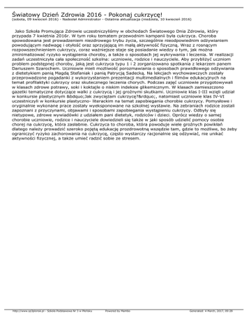 Światowy Dzień Zdrowia 2016 - Pokonaj cukrzycę! (sobota, 09 kwiecień 2016) - Nadesłał Administrator - Ostatnia aktualizacja (niedziela, 10 kwiecień 2016) Jako Szkoła Promująca Zdrowie uczestniczyliśmy w obchodach Światowego Dnia Zdrowia, który przypada 7 kwietnia 2016r. W tym roku tematem przewodnim kampanii była cukrzyca. Choroba spowodowana jest prowadzeniem niezdrowego trybu życia, szczególnie nieodpowiednim odżywianiem powodującym nadwagę i otyłość oraz sprzyjającą im małą aktywność fizyczną. Wraz z rosnącym rozpowszechnieniem cukrzycy, coraz ważniejsze staje się posiadanie wiedzy o tym, jak można zminimalizować ryzyko wystąpienia choroby, a także o sposobach jej wykrywania i leczenia. W realizacji zadań uczestniczyła cała społeczność szkolna: uczniowie, rodzice i nauczyciele. Aby przybliżyć uczniom problem podstępnej choroby, jaką jest cukrzyca typu 1 i 2 zorganizowano spotkania z lekarzem panem Dariuszem Szarochem. Uczniowie mieli możliwość porozmawiania o sposobach prawidłowego odżywiania z dietetykiem panią Magdą Stefaniak i panią Patrycją Sadecką. Na lekcjach wychowawczych zostały przeprowadzone pogadanki z wykorzystaniem prezentacji multimedialnych i filmów edukacyjnych na temat profilaktyki cukrzycy oraz skutecznego leczenia chorych. Podczas zajęć uczniowie przygotowywali w klasach zdrowe potrawy, soki i koktajle o niskim indeksie glikemicznym. W klasach zamieszczono gazetki tematyczne dotyczące walki z cukrzycą i jej groźnymi skutkami. Uczniowie klas I-III wzięli udział w konkursie plastycznym „Jak zwyciężam cukrzycę?”, natomiast uczniowie klas IV-VI uczestniczyli w konkursie plastyczno- literackim na temat zapobiegania chorobie cukrzycy. Pomysłowe i oryginalnie wykonane prace zostały wyeksponowane na szkolnej wystawie. Na zebraniach rodzice zostali zapoznani z przyczynami, objawami i sposobami zapobiegania wystąpieniu cukrzycy. Odbyły się nietypowe, zdrowe wywiadówki z udziałem pani dietetyk, rodziców i dzieci. Oprócz wiedzy o samej chorobie uczniowie, rodzice i nauczyciele dowiedzieli się także w jaki sposób udzielić pomocy osobie chorej na cukrzycę, która zasłabnie. Cukrzyca to choroba, która powoduje wiele groźnych powikłań dlatego należy prowadzić szeroko pojętą edukację prozdrowotną wszędzie tam, gdzie to możliwe, bo żeby ograniczyć ryzyko zachorowania na cukrzycę, często wystarczy racjonalnie się odżywiać, nie unikać aktywności fizycznej, a także umieć radzić sobie ze stresem. http://www.sp3plonsk.pl - Szkoła Podstawowa Nr 3 w Płońsku Powered by Mambo Generated: 4 March, 2017, 09:28
