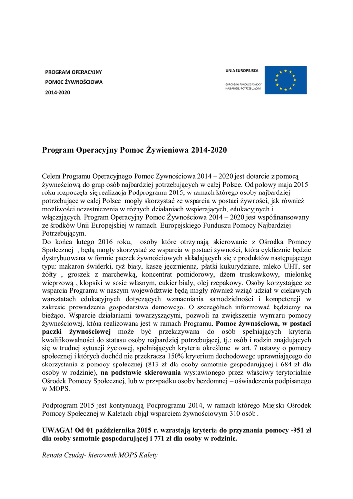 Program Operacyjny Pomoc Żywieniowa 2014-2020 Celem Programu Operacyjnego Pomoc Żywnościowa 2014 – 2020 jest dotarcie z pomocą żywnościową do grup osób najbardziej potrzebujących w całej Polsce. Od połowy maja 2015 roku rozpoczęła się realizacja Podprogramu 2015, w ramach którego osoby najbardziej potrzebujące w całej Polsce mogły skorzystać ze wsparcia w postaci żywności, jak również możliwości uczestniczenia w różnych działaniach wspierających, edukacyjnych i włączających. Program Operacyjny Pomoc Żywnościowa 2014 – 2020 jest wspófinansowany ze środków Unii Europejskiej w ramach Europejskiego Funduszu Pomocy Najbardziej Potrzebującym. Do końca lutego 2016 roku, osoby które otrzymają skierowanie z Ośrodka Pomocy Społecznej , będą mogły skorzystać ze wsparcia w postaci żywności, która cyklicznie będzie dystrybuowana w formie paczek żywnościowych składających się z produktów następującego typu: makaron świderki, ryż biały, kaszę jęczmienną, płatki kukurydziane, mleko UHT, ser żółty , groszek z marchewką, koncentrat pomidorowy, dżem truskawkowy, mielonkę wieprzową , klopsiki w sosie własnym, cukier biały, olej rzepakowy. Osoby korzystające ze wsparcia Programu w naszym województwie będą mogły również wziąć udział w ciekawych warsztatach edukacyjnych dotyczących wzmacniania samodzielności i kompetencji w zakresie prowadzenia gospodarstwa domowego. O szczegółach informować będziemy na bieżąco. Wsparcie działaniami towarzyszącymi, pozwoli na zwiększenie wymiaru pomocy żywnościowej, która realizowana jest w ramach Programu. Pomoc żywnościowa, w postaci paczki żywnościowej może być przekazywana do osób spełniających kryteria kwalifikowalności do statusu osoby najbardziej potrzebującej, tj.: osób i rodzin znajdujących się w trudnej sytuacji życiowej, spełniających kryteria określone w art. 7 ustawy o pomocy społecznej i których dochód nie przekracza 150% kryterium dochodowego uprawniającego do skorzystania z pomocy społecznej (813 zł dla osoby samotnie gospodarującej i 684 zł dla osoby w rodzinie), na podstawie skierowania wystawionego przez właściwy terytorialnie Ośrodek Pomocy Społecznej, lub w przypadku osoby bezdomnej – oświadczenia podpisanego w MOPS. Podprogram 2015 jest kontynuacją Podprogramu 2014, w ramach którego Miejski Ośrodek Pomocy Społecznej w Kaletach objął wsparciem żywnościowym 310 osób . UWAGA! Od 01 października 2015 r. wzrastają kryteria do przyznania pomocy -951 zł dla osoby samotnie gospodarującej i 771 zł dla osoby w rodzinie. Renata Czudaj- kierownik MOPS Kalety