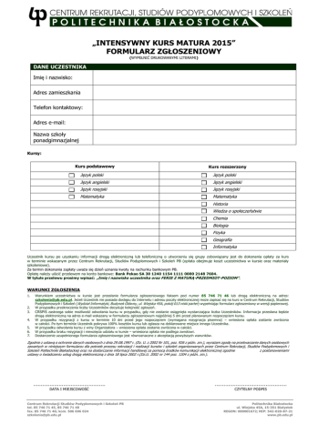 „INTENSYWNY KURS MATURA 2015” FORMULARZ ZGŁOSZENIOWY (WYPEŁNIĆ DRUKOWANYMI LITERAMI) DANE UCZESTNIKA Imię i nazwisko: Adres zamieszkania Telefon kontaktowy: Adres e-mail: Nazwa szkoły ponadgimnazjalnej Kursy: Kurs podstawowy Kurs rozszerzony Język polski Język polski Język angielski Język angielski Język rosyjski Język rosyjski Matematyka Matematyka Historia Wiedza o społeczeństwie Chemia Biologia Fizyka Geografia Informatyka Uczestnik kursu po uzyskaniu informacji drogą elektroniczną lub telefoniczną o utworzeniu się grupy zobowiązany jest do dokonania opłaty za kurs w terminie wskazanym przez Centrum Rekrutacji, Studiów Podyplomowych i Szkoleń PB (opłata obejmuje koszt uczestnictwa w kursie oraz materiały szkoleniowe). Za termin dokonania zapłaty uważa się dzień uznania kwoty na rachunku bankowym PB. Opłatę należy uiścić przelewem na konto bankowe: Bank Pekao SA 30 1240 1154 1111 0000 2148 7604. W tytule przelewu prosimy wpisać: „Imię i nazwisko uczestnika oraz FERIE Z MATURĄ-PRZEDMIOT-POZIOM”. WARUNKI ZGŁOSZENIA 1. 2. 3. 4. 5. 6. 7. Warunkiem uczestnictwa w kursie jest przesłanie formularza zgłoszeniowego faksem pod numer 85 746 71 46 lub drogą elektroniczną na adres: [email protected]. Jeżeli Uczestnik nie posiada dostępu do Internetu i adresu poczty elektronicznej może zapisać się na kurs w Centrum Rekrutacji, Studiów Podyplomowych i Szkoleń (Wydział Informatyki, Budynek Główny, ul. Wiejska 45A, pokój 013 niski parter) wypełniając formularz zgłoszeniowy w wersji papierowej. W przypadku przekroczenia liczby Uczestników decyduje kolejność zgłoszeń. CRSPiS zastrzega sobie możliwość odwołania kursu w przypadku, gdy nie zostanie osiągnięta wystarczająca liczba Uczestników. Informacja przesłana będzie drogą elektroniczną na adres e-mail wskazany w formularzu zgłoszeniowym najpóźniej 5 dni przed planowanym rozpoczęciem kursu. W przypadku rezygnacji z kursu w terminie 10 dni przed jego rozpoczęciem (wymagana rezygnacja pisemna) – wniesiona opłata zostanie zwrócona w całości. Po tym terminie Uczestnik pokrywa 100% kosztów kursu lub zgłasza na deklarowane miejsce innego Uczestnika. W przypadku odwołania kursu z winy Organizatora – wniesiona opłata zostanie zwrócona w całości. W przypadku braku rezygnacji i niewzięcia udziału w kursie – wniesiona opłata nie podlega zwrotowi. Dostarczenie uzupełnionego formularza zgłoszeniowego jest równoznaczne z akceptacją powyższych warunków. Zgodnie z ustawą o ochronie danych osobowych z dnia 29.08.1997 r. (Dz. U. z 2002 Nr 101, poz. 926 z późn. zm.), wyrażam zgodę na przetwarzanie danych osobowych zawartych w niniejszym formularzu dla potrzeb procesu rekrutacji i realizacji kursów i szkoleń organizowanych przez Centrum Rekrutacji, Studiów Podyplomowych i Szkoleń Politechniki Białostockiej oraz na dostarczanie informacji handlowej za pomocą środków komunikacji elektronicznej zgodnie z postanowieniami ustawy o świadczeniu usług drogą elektroniczną z dnia 18 lipca 2002 r.(Dz.U. 2002 nr 144 poz. 1204 z późn. zm.). ………………………………………… ………………………………………… DATA I MIEJSCOWOŚĆ CZYTELNY PODPIS Centrum Rekrutacji Studiów Podyplomowych i Szkoleń PB tel. 85 746 71 45, 85 746 71 48 fax. 85 746 71 46; kom. 506 696 024 [email protected] Politechnika Białostocka ul. Wiejska 45A, 15-351 Białystok REGON: 000001672; NIP: 542-020-87-21 www.pb.edu.pl