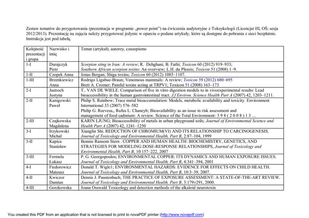 Zestaw tematów do przygotowania (prezentacja w programie „power point”) na ćwiczenia audytoryjne z Toksykologii (Licencjat III, OŚ; sesja 2012/2013). Prezentację na zajęcia należy przygotować jedynie w oparciu o podane artykuły, które są dostępne do pobrania z sieci bezpłatnie. Instrukcja jest pod tabelą. Kolejność Nazwisko i prezentacji imię i grupa 1-I Durajczyk Piotr 1-II Czopek Anna 1-III Brzenkiewicz Anna 2-I Jastroch Justyna 2-II Kanigowski Paweł 2-III 3-I 3-II 3-III 4-I 4-II 4-III Czajkowska Magdalena Irzykowski Michał Kapica Stanisław Formela Łukasz Fiedorowicz Mateusz Kwiczor Damian Gorzkowska Temat (artykuł), autorzy, czasopismo Scorpion sting in Iran: A review; R. Dehghani, B. Fathi; Toxicon 60 (2012) 919–933; Southern African scorpion toxins: An overview; L.H. du Plessis; Toxicon 51 (2008) 1–9. Jonas Bergan; Shiga toxins; Toxicon 60 (2012) 1085–1107. Rodrigo Ligabue-Braun; Venomous mammals: A review; Toxicon 59 (2012) 680–695 Brett A. Cromer; Painful toxins acting at TRPV1; Toxicon 51 (2008) 163–173 T.. VAN DE WIELE. Comparison of five in vitro digestion models to in vivoexperimental results: Lead bioaccessibility in the human gastrointestinal tract. J.f Environ. Science Health Part A (2007) 42, 1203–1211. Philip S. Rainbow; Trace metal bioaccumulation: Models, metabolic availability and toxicity. Environment International 33 (2007) 576–582 Philip G. Reevesa,, Rufus L. Chaneyb; Bioavailability as an issue in risk assessment and management of food cadmium: A review. Science of the Total Environment: 3 9 8 ( 2 0 0 8 ) 1 3 … KARIN LJUNG; Bioaccessibility of metals in urban playground soils; Journal of Environmental Science and Health Part A (2007) 42, 1241–1250 Xianglin Shi. REDUCTION OF CHROMIUM(VI) AND ITS RELATIONSHIP TO CARCINOGENESIS. Journal of Toxicology and Environmental Health, Part B, 2:87–104, 1999 Bonnie Ransom Stern . COPPER AND HUMAN HEALTH: BIOCHEMISTRY, GENETICS, AND STRATEGIES FOR MODELING DOSE-RESPONSE RELATIONSHIPS, Journal of Toxicology and Environmental Health, Part B, 10:157–222, 2007 P. G. Georgopoulos; ENVIRONMENTAL COPPER: ITS DYNAMICS AND HUMAN EXPOSURE ISSUES. Journal of Toxicology and Environmental Health, Part B, 4:341–394, 2001 Donald T. Wigle1; ENVIRONMENTAL HAZARDS: EVIDENCE FOR EFFECTS ON CHILD HEALTH. Journal of Toxicology and Environmental Health, Part B, 10:3–39, 2007. Dennis J. Paustenbach; THE PRACTICE OF EXPOSURE ASSESSMENT: A STATE-OF-THE-ART REVIEW. Journal of Toxicology and Environmental Health, Part B, 3:179±291, 2000. Joana Osswald Toxicology and detection methods of the alkaloid neurotoxin You created this PDF from an application that is not licensed to print to novaPDF printer (http://www.novapdf.com) 5-I 5-II 5-III 6-I 6-II 6-III 7-I 7-II 7-III Agata Jurkiewicz Gabriela Lewicka Agnieszka Jaroszek Joanna Karczewska Joanna Nastały Małgorzata Kozakiewicz Małgorzata Krogul Patrycja Nowicka Anna 8-II Kruk Aleksandra Kudłak Karolina Psiuk Maciej 8-III Lehman Paula 8-I 9-I 9-II Kurnik Magdalena Rudnicka Justyna produced by cyanobacteria, anatoxin-a. Environment International 33 (2007) 1070–1089 Anna A. Shvedova; Mechanisms of carbon nanotube-induced toxicity: Focus on oxidative stress; Toxicology and Applied Pharmacology 261 (2012) 121–133 Neelam Azad INFLAMMATION AND LUNG CANCER: ROLES OF REACTIVE OXYGEN/NITROGEN SPECIES; Journal of Toxicology and Environmental Health, Part B, 11:1–15, 2008 Andrew Waye; NEUROENDOCRINE DISRUPTION: MORE THAN HORMONES ARE UPSET; Journal of Toxicology and Environmental Health, Part B, 14:270–291, 2011 Jan A. Mennigen; PHARMACEUTICALS AS NEUROENDOCRINE DISRUPTORS: LESSONS LEARNED FROM FISH ON PROZAC; Journal of Toxicology and Environmental Health, Part B, 14:387–412, 2011 Syam S. Andra; Thyroid Disrupting Chemicals in Plastic Additives and Thyroid Health; Journal of Environmental Science and Health, Part C, 30:107–151, 2012 Robin E. Dodson; Endocrine Disruptors and Asthma-Associated Chemicals in Consumer Products; Environmental Health Perspectives • volume 120 | number 7 | July 2012 935 Shabana I. Khan; Epigenetic Events Associated with Breast Cancer and Their Prevention by Dietary Components Targeting the Epigenome; Chemical Research in Toxicology 2012, 25, 61–73 Anita Bakshi; POTENTIAL ADVERSE HEALTH EFFECTS OF GENETICALLY MODIFIED CROPS. Journal of Toxicology and Environmental Health, Part B, 6:211–225, 2003. Veronica J. Schulz Non-dioxin-like AhR Ligands in a Mouse Peanut Allergy Model. Toxicological sciences 128(1), 92–102 (2012) Afonso C.D. Bainy Nuclear receptors and susceptibility to chemical exposure in aquatic organisms. Environment International 33 (2007) 571–575 Jan L. Lyche; REPRODUCTIVE AND DEVELOPMENTAL TOXICITY OF PHTHALATES; Journal of Toxicology and Environmental Health, Part B, 12:225–249, 2009 Natalie B. Aquino; The Role of Cadmium and Nickel in Estrogen Receptor Signaling and Breast Cancer: Metalloestrogens or Not?; Journal of Environmental Science and Health, Part C, 30:189–224, 2012 ZSOLT FORGACS; Reproductive toxicology of nickel – Review; Journal of Environmental Science and Health, Part A (2012) 47, 1249–1260 Alexandra Muñoz; Elucidating the mechanisms of nickel compound uptake: A review of particulate and nanonickel endocytosis and toxicity; Toxicology and Applied Pharmacology 260 (2012) 1–16 E. Denkhaus, K. Salnikow Nickel essentiality, toxicity, and carcinogenicity Critical Reviews in Oncology/Hematology 42 (2002) 35–56 You created this PDF from an application that is not licensed to print to novaPDF printer (http://www.novapdf.com) 9-III Litwin Daria 10-I Maksymiuk Monika Saba Martyna 10-II 10-III 11-I 11-II Mieszkowska Karolina Malinowska Aleksandra 11-III Sofiński Łukasz Plicha Joanna 12-I Maya Hugo 12-II Solak Ewelina 12-III Podpłońska Patrycja Miller Gniewomir Stachnik Joanna 13-I 13-II Mala Nath. Toxicity and the cardiovascular activity of organotin compounds: a review Appl. Organom