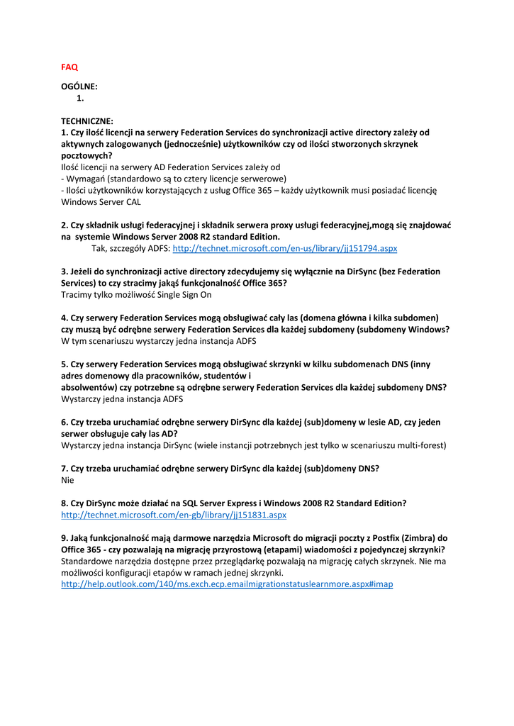 FAQ OGÓLNE: 1. TECHNICZNE: 1. Czy ilość licencji na serwery Federation Services do synchronizacji active directory zależy od aktywnych zalogowanych (jednocześnie) użytkowników czy od ilości stworzonych skrzynek pocztowych? Ilość licencji na serwery AD Federation Services zależy od - Wymagań (standardowo są to cztery licencje serwerowe) - Ilości użytkowników korzystających z usług Office 365 – każdy użytkownik musi posiadać licencję Windows Server CAL 2. Czy składnik usługi federacyjnej i składnik serwera proxy usługi federacyjnej,mogą się znajdować na systemie Windows Server 2008 R2 standard Edition. Tak, szczegóły ADFS: http://technet.microsoft.com/en-us/library/jj151794.aspx 3. Jeżeli do synchronizacji active directory zdecydujemy się wyłącznie na DirSync (bez Federation Services) to czy stracimy jakąś funkcjonalność Office 365? Tracimy tylko możliwość Single Sign On 4. Czy serwery Federation Services mogą obsługiwać cały las (domena główna i kilka subdomen) czy muszą być odrębne serwery Federation Services dla każdej subdomeny (subdomeny Windows? W tym scenariuszu wystarczy jedna instancja ADFS 5. Czy serwery Federation Services mogą obsługiwać skrzynki w kilku subdomenach DNS (inny adres domenowy dla pracowników, studentów i absolwentów) czy potrzebne są odrębne serwery Federation Services dla każdej subdomeny DNS? Wystarczy jedna instancja ADFS 6. Czy trzeba uruchamiać odrębne serwery DirSync dla każdej (sub)domeny w lesie AD, czy jeden serwer obsługuje cały las AD? Wystarczy jedna instancja DirSync (wiele instancji potrzebnych jest tylko w scenariuszu multi-forest) 7. Czy trzeba uruchamiać odrębne serwery DirSync dla każdej (sub)domeny DNS? Nie 8. Czy DirSync może działać na SQL Server Express i Windows 2008 R2 Standard Edition? http://technet.microsoft.com/en-gb/library/jj151831.aspx 9. Jaką funkcjonalność mają darmowe narzędzia Microsoft do migracji poczty z Postfix (Zimbra) do Office 365 - czy pozwalają na migrację przyrostową (etapami) wiadomości z pojedynczej skrzynki? Standardowe narzędzia dostępne przez przeglądarkę pozwalają na migrację całych skrzynek. Nie ma możliwości konfiguracji etapów w ramach jednej skrzynki. http://help.outlook.com/140/ms.exch.ecp.emailmigrationstatuslearnmore.aspx#imap