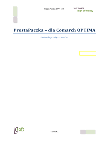 ProstaPaczka OPTI v1.5 ProstaPaczka – dla Comarch OPTIMA Instrukcja użytkownika Strona 1 ProstaPaczka OPTI v1.5 Spis treści 1Wstęp...........................................................................................................................3 1.1Wymagania...........................................................................................................3 1.2Opis panelu głównego..........................................................................................3 1.3Środowisko testowe kuriera..................................................................................4 1.4Menu Start/Stop....................................................................................................4 2Pierwsze uruchomienie...............................................................................................6 3Ustawienia...................................................................................................................7 3.1Ustawienia - Import danych..................................................................................8 3.2Ustawienia Siódemki............................................................................................9 3.2.1Menu Siódemka Eksport................................................................................9 3.2.1.1Zakładka WebService7..........................................................................9 3.2.1.2Zakładka Przetwarzanie......................................................................10 3.2.2Menu Siódemka Wydruk..............................................................................11 3.3Menu Ustawienia DPD........................................................................................12 3.3.1Menu DPD Eksport......................................................................................14 3.3.1.1Zakładka Web Service.........................................................................14 3.3.1.2Zakładka Przetwarzanie......................................................................15 3.3.2Menu DPD wydruk.......................................................................................15 3.4Menu Ustawienia Acrobat...................................................................................16 4Konfiguracja aplikacji Comarch OPTIMA..................................................................18 4.1Paczka pobraniowa............................................................................................20 4.2Paczka zwykła....................................................................................................23 5Praca z aplikacją ProstaPaczka OPTI......................................................................26 5.1Eksport faktur z Comarch OPTIMA....................................................................26 5.2Uruchomienie aplikacji........................................................................................29 5.3Import faktur........................................................................................................29 5.4Eksport danych do kuriera..................................................................................29 5.5Obsługa błędnych danych przesyłki...................................................................31 5.6Wydruk listów przewozowych.............................................................................33 5.7Zamknięcie listy..................................................................................................33 5.8Czyszczenie danych...........................................................................................34 Strona 2 ProstaPaczka OPTI v1.5 1 Wstęp Aplikacja została przygotowana dla użytkowników aplikacji Comarch OPTIMA i współpracujący z firmami kurierskimi. Aplikacja jest dodatkiem do Comarch OPTIMA i jest przeznaczona do współpracy z tą aplikacją bądź aplikacjami generującymi pliki wejściowe w tym samym formacie. Aplikacja ma na celu uproszczenie i przyśpieszenie pracy związanej z przygotowaniem dokumentów wymaganych do prawidłowej realizacji usługi transportowej (listów przewozowych, dokumentu wydania paczek). 1.1 Wymagania Aplikacja do poprawnej pracy wymaga: 1. Systemu Windows z zainstalowany .NET Framework 4 (lub wyższym) 2. Aplikacji Adobe Acrobat Reader 3. Połączenia z internetem w momencie przygotowania wysyłki 4. Przyznanego dostępu do oprogramowania (API Kuriera) 5. Uprawnień do zapisywania/otwierania/usuwania plików w katalogu głównym aplikacji i katalogu z którego będą odczytywane dane o dokumentach 1.2 Opis panelu głównego Aplikacja składa się z okna głównego oraz okien ustawień (WebService7 i wydruku). Okno główne przedstawione zostało na poniższym rysunku: Strona 3 ProstaPaczka OPTI v1.5 Ilustracja 1: Okno główne aplikacji ProstaPaczka OPTI W tym oknie wyświetlane będą informacje o fakturach i przypisanych do nich numerach listów przewozowych. 1.3 Środowisko testowe kuriera Kurierzy udostępniają swoim klientom środowiska testowe swojego API aby każdy mógł poznać zasadę ich działania. UWAGA!!! Przesyłek przygotowanych przekazywać kurierowi! na środowisku testowym nie wolno Do normalnej pracy przeznaczone są środowiska produkcyjne. Na niebieskim pasku aplikacji (przy nazwie) zostanie wyświetlona informacja tylko w przypadku gdy adresy API wskazują na środowisko testowe kuriera (przykład poniżej) Jeżeli u Państwa wyświetlają się takie napisy (Siodemka: TEST lub DPD: TEST) a chcą Państwo korzystać produkcyjnie z aplikacji należy skontaktować się z nami aby otrzymać prawidłową wersję programu. 1.4 Menu Start/Stop W menu Start/Stop znajdują się pozycje pozwalające na kontrolę stanu pracy aplikacji. Strona 4 ProstaPaczka OPTI v1.5 • Pozycja menu Start – uruchamia proces skanowania wskazanego katalogu w poszukiwania plików XML zawierających dane o fakturach z OPTIMY • Pozycja menu Stop – wyłącza proces skan