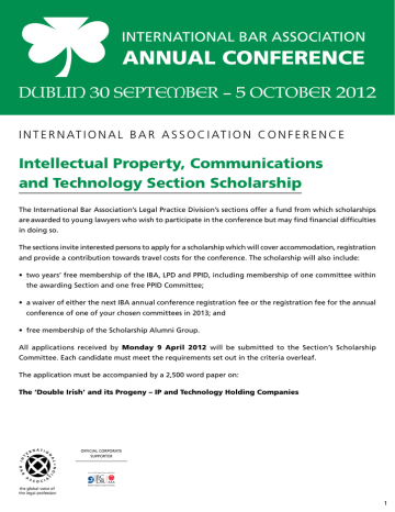 I n t e r n at i o n a l B a r A s s o c i at i o n C o n f e r e n c e Intellectual Property, Communications and Technology Section Scholarship The International Bar Association’s Legal Practice Division’s sections offer a fund from which scholarships are awarded to young lawyers who wish to participate in the conference but may find financial difficulties in doing so. The sections invite interested persons to apply for a scholarship which will cover accommodation, registration and provide a contribution towards travel costs for the conference. The scholarship will also include: • two years’ free membership of the IBA, LPD and PPID, including membership of one committee within the awarding Section and one free PPID Committee; • a waiver of either the next IBA annual conference registration fee or the registration fee for the annual conference of one of your chosen committees in 2013; and • free membership of the Scholarship Alumni Group. All applications received by Monday 9 April 2012 will be submitted to the Section’s Scholarship Committee. Each candidate must meet the requirements set out in the criteria overleaf. The application must be accompanied by a 2,500 word paper on: The ‘Double Irish’ and its Progeny – IP and Technology Holding Companies Official corporate supporter 1 Dublin 2012 The International Bar Association (IBA), the world’s largest international organisation of law societies, bar associations and individual lawyers engaged in transnational law, will hold its 2012 Conference in Dublin from 30 September – 5 October. As one of the largest international legal gatherings in 2012, it will attract over 4000 lawyers from more than 100 jurisdictions. All 55 specialist Committees of the Legal Practice Division will present programmes covering current topics of significance to commercial lawyers worldwide. The IBA’s Public and Professional Interest Division’s Committees and Other Entities will also be presenting full sessions, covering topics dealing with public interest and general professional work. For a list of IBA committees and constituents please see page 5. The working programmes will be complemented by a full social programme which helps to establish and maintain business contacts and friendships with the legal profession worldwide. Criteria (1) The Intellectual Property, Communications and Technology Section Scholarship is free to enter. It is open to all lawyers up to and including the age of 35, whether or not they are members of the IBA. Papers shall answer the following question or be based on the following topic: The ‘Double Irish’ and its Progeny – IP and Technology Holding Companies Papers must be original, unpublished works. They will not be under consideration for any commercial contract by any publishing house. The author is warranting his or her unrestricted copyright to the paper submitted. (2) Participation with a pen name will be permitted, provided that an operative contact and a valid address are provided for a term until 1 July 2012. If authors using pen names are chosen as finalists, they will be required to prove their identity, age and qualification as a lawyer. If these requirements are not met, the candidate will automatically fail. Submissions with pen names will in any case need to be disclosed by all participants once the scholar has been chosen, at the request of the scholarship committee. Pen names are mandated for lawyers working in the corporations of the members of the judging committee. (3) In the case of papers submitted under a pen name, the e-mail address or any other reference of the sender shall not disclose the real details of the participant. In the case of e-mail addresses, for example, this can be achieved by using free e-mail services. 2 (4) Papers must be sent by e-mail, preferably as Word documents or in PDF format to Charlotte Evans, Divisions Administrative Assistant at the IBA Office ([email protected]). (5) Papers are to be written in English and should be at least 2,500 words. The text should be doublespaced. Each paper must contain the author’s name or the author’s pen name, and a valid contact address on the front page. (6) Papers must be submitted and received by Monday 9 April 2012. Papers received after this time will not be considered. (7) The Scholarship Committee will consist of Officers of the IBA Intellectual Property, Communications and Technology Section. They will judge the papers primarily on the basis of legal argumentation, research, style, logic, originality and overall quality of the content. An international, rather than a strict domestic, approach would be appreciated. Factors such as financial need and geographical diversity may also be considered. (8) It is planned that the IBA Office will communicate the Scholarship Committee’s decision to the winner and possibly any additional finalists by the middle of June 2012 along with a request for their identification as per rule 2. (9) The decision of the judging committee is final and no correspondence will be entered into. The decision will be published on the IBA website. Winners will be contacted at the e-mail address indicated by them on the paper. They will be requested to provide a biographical note giving details of their legal career, studies and professional appointments. (10) The prize for the winning paper is as follows: • Free registration for the IBA 2012 Annual Conference, 30 September – 5 October, Dublin, Ireland. • A contribution towards travel costs to the conference. • A contribution towards accommodation costs while attending the conference. • Two years’ free membership of the IBA, LPD and PPID including membership of one committee within the awarding section and one free PPID Committee. • A waiver of either the next IBA annual conference registration fee or the registration fee for the next specialist conference of their chosen committee. • Free membership of the Scholarship Alumn